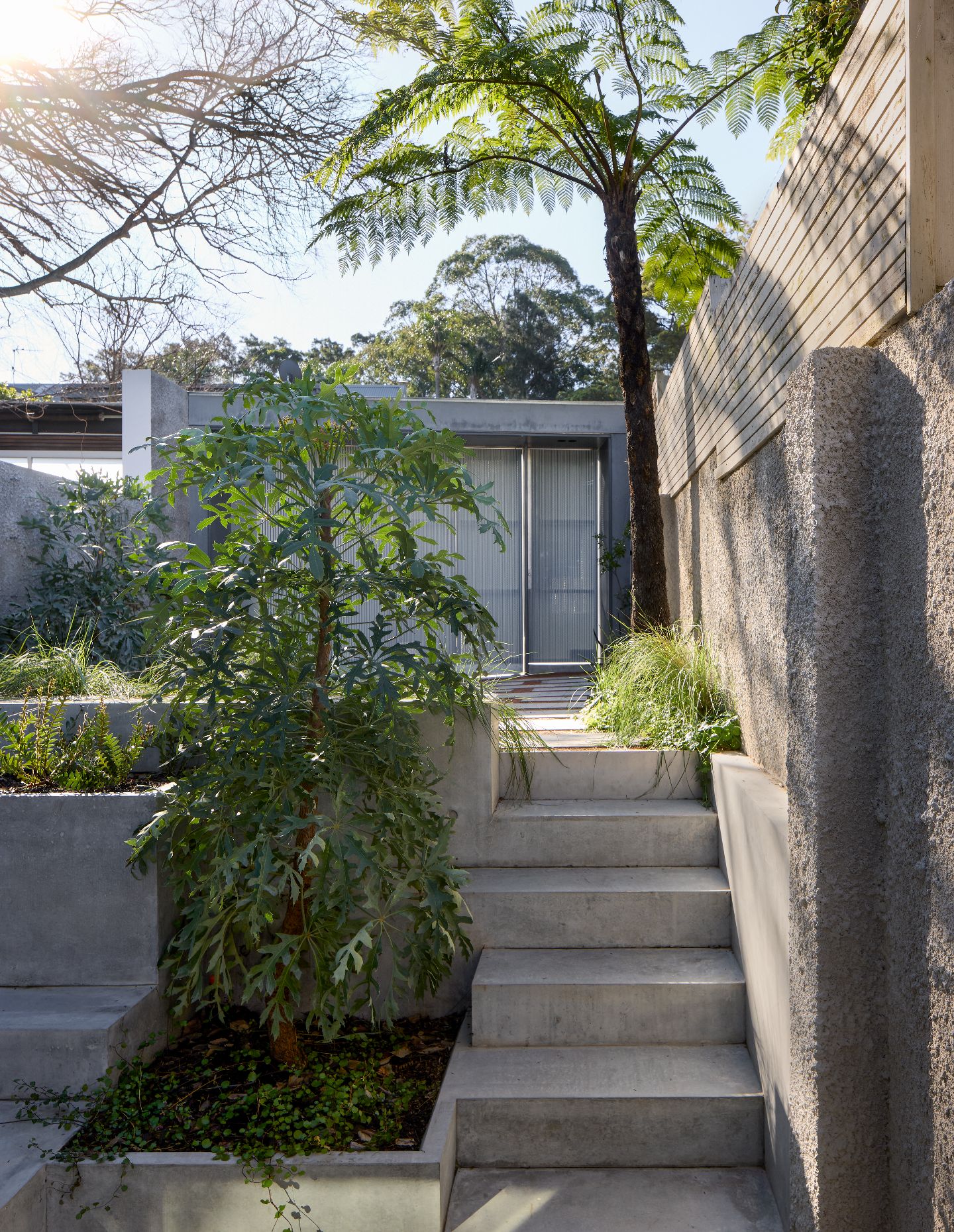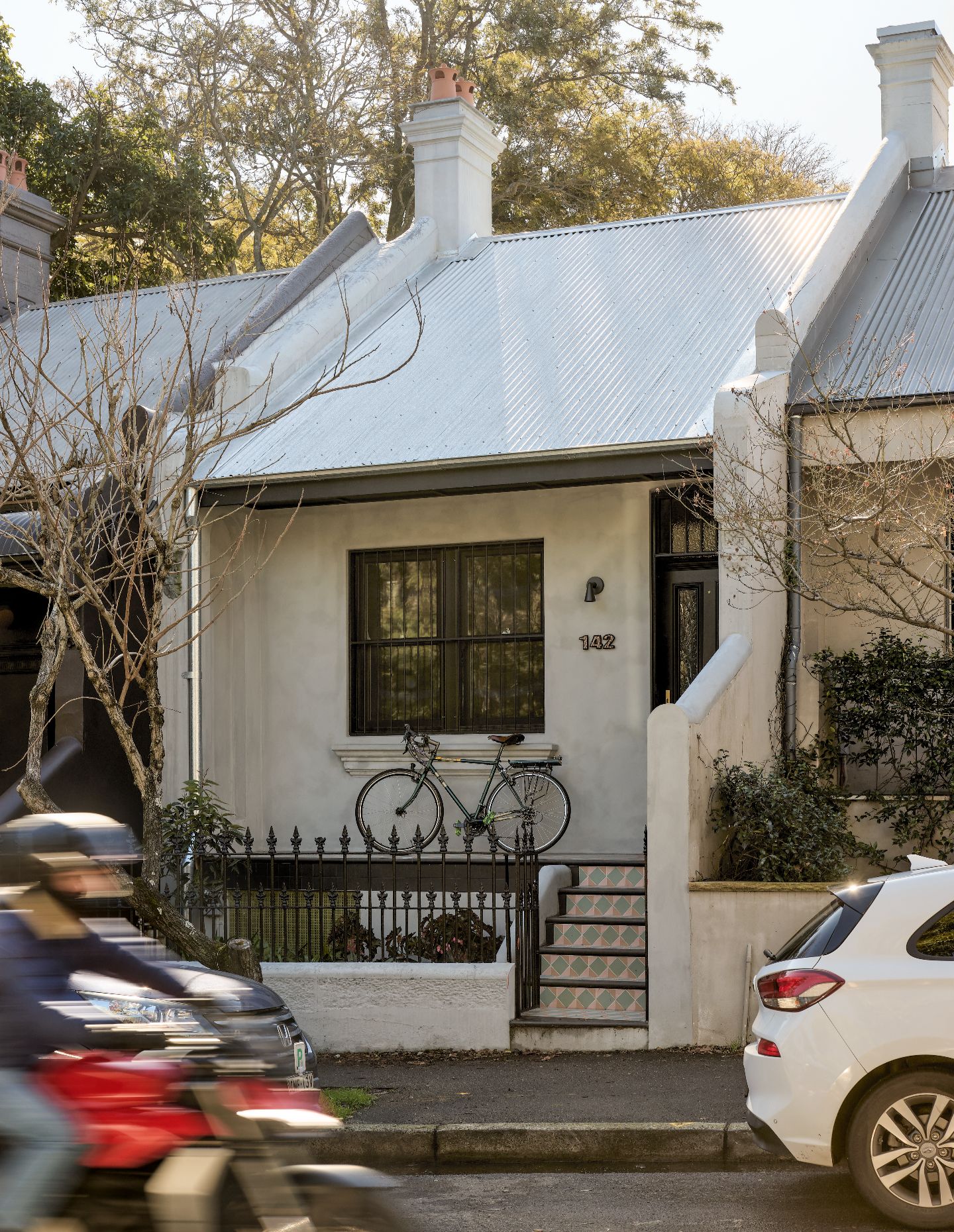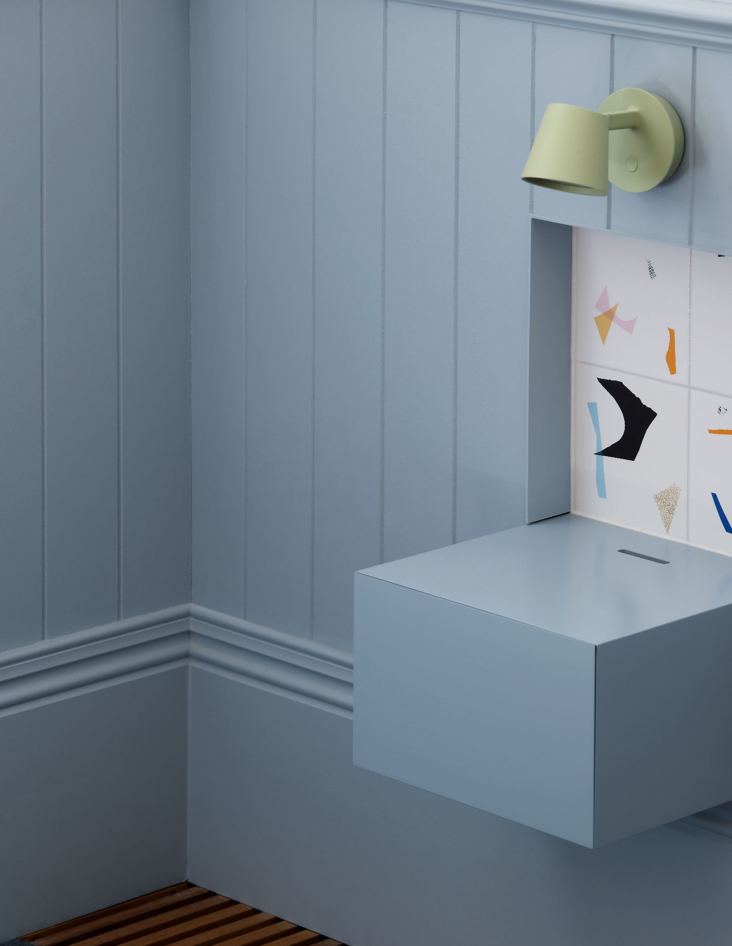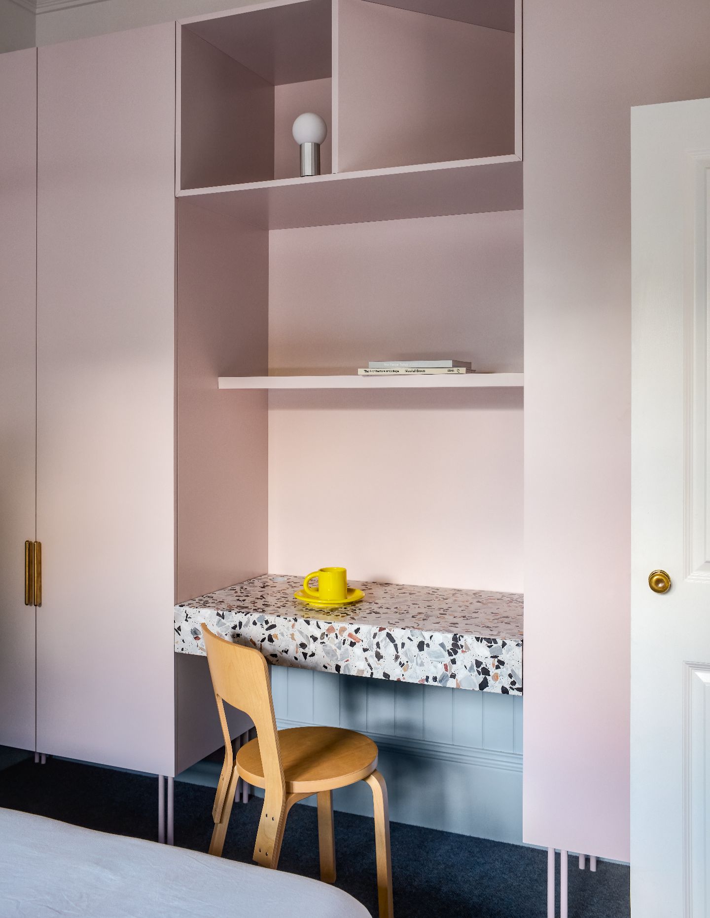 There’s incredible nuance in the detail, including the decision to use this pale grey terrazzo as the desktop for the main bedroom’s built-in study, and the use of salvaged gymnasium timber floors (still marked with painted basketball court lines) in the hallway. In totality, it’s a masterful study in how to create a residential interior that is joyful yet understated, fun yet calming.