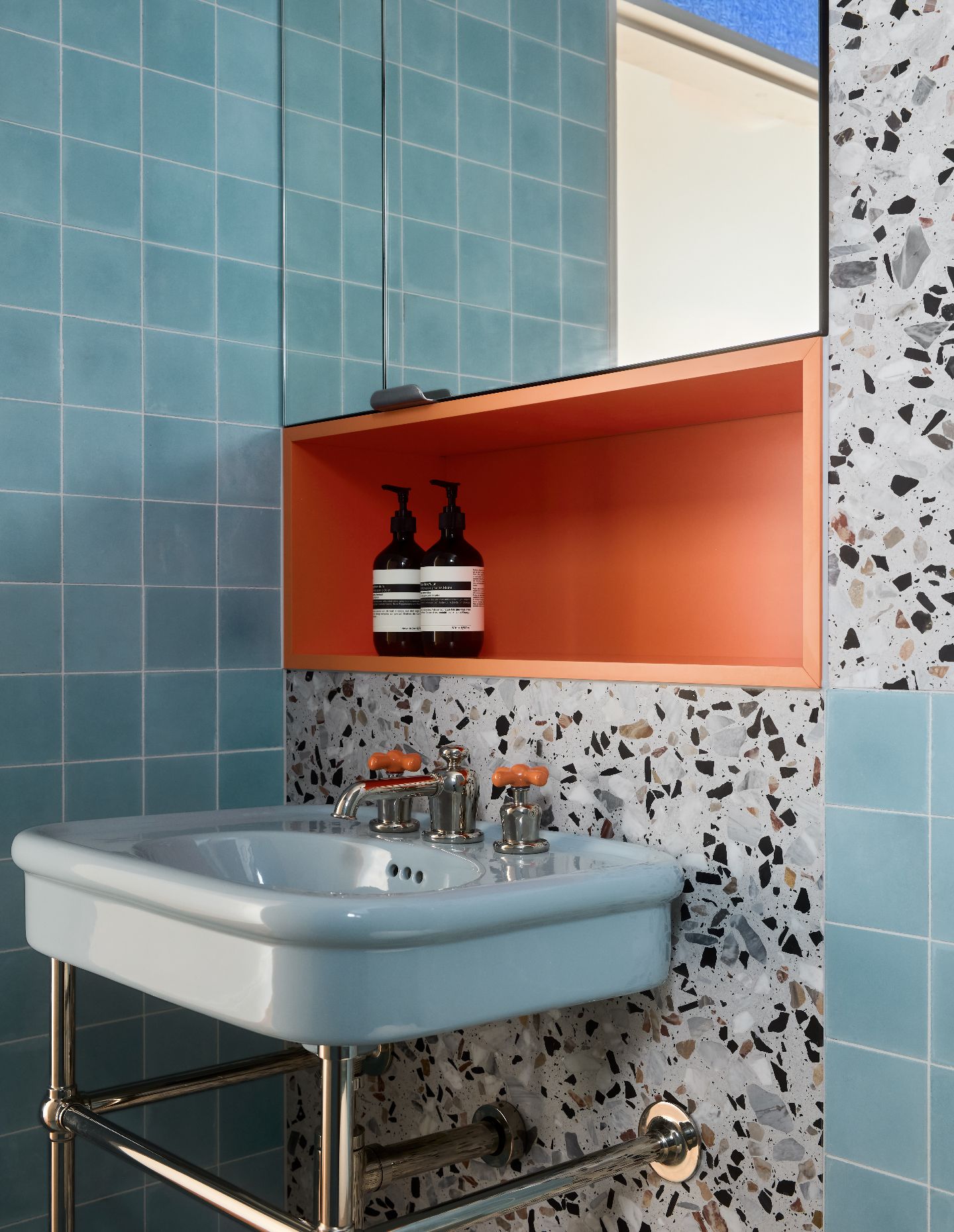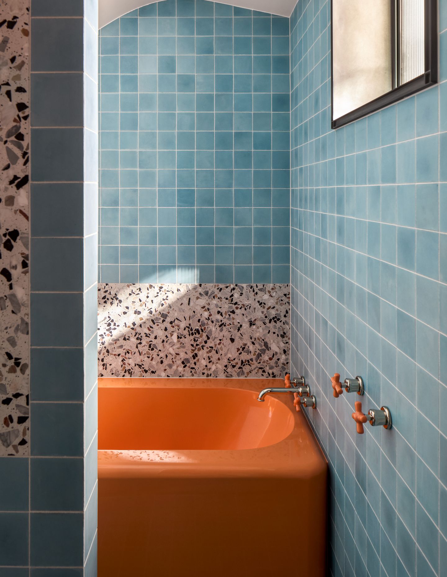 The bright orange joinery sections are complemented by other sections finished in orange-toned tiles, not to mention the orange chips in the black and cream terrazzo. And the same striking palette is repeated in the lounge area’s joinery and two built-ins flanking the dining area’s full-height glass doors. Unsurprisingly, the customised bathtub (hand-formed and finished by a shipbuilder, no less) in the bathroom is also orange, as is the joinery and tapware. Miranda has swapped out the tiles for light blue though, and the terrazzo is the palest of greys, with chips in black, white and brown.