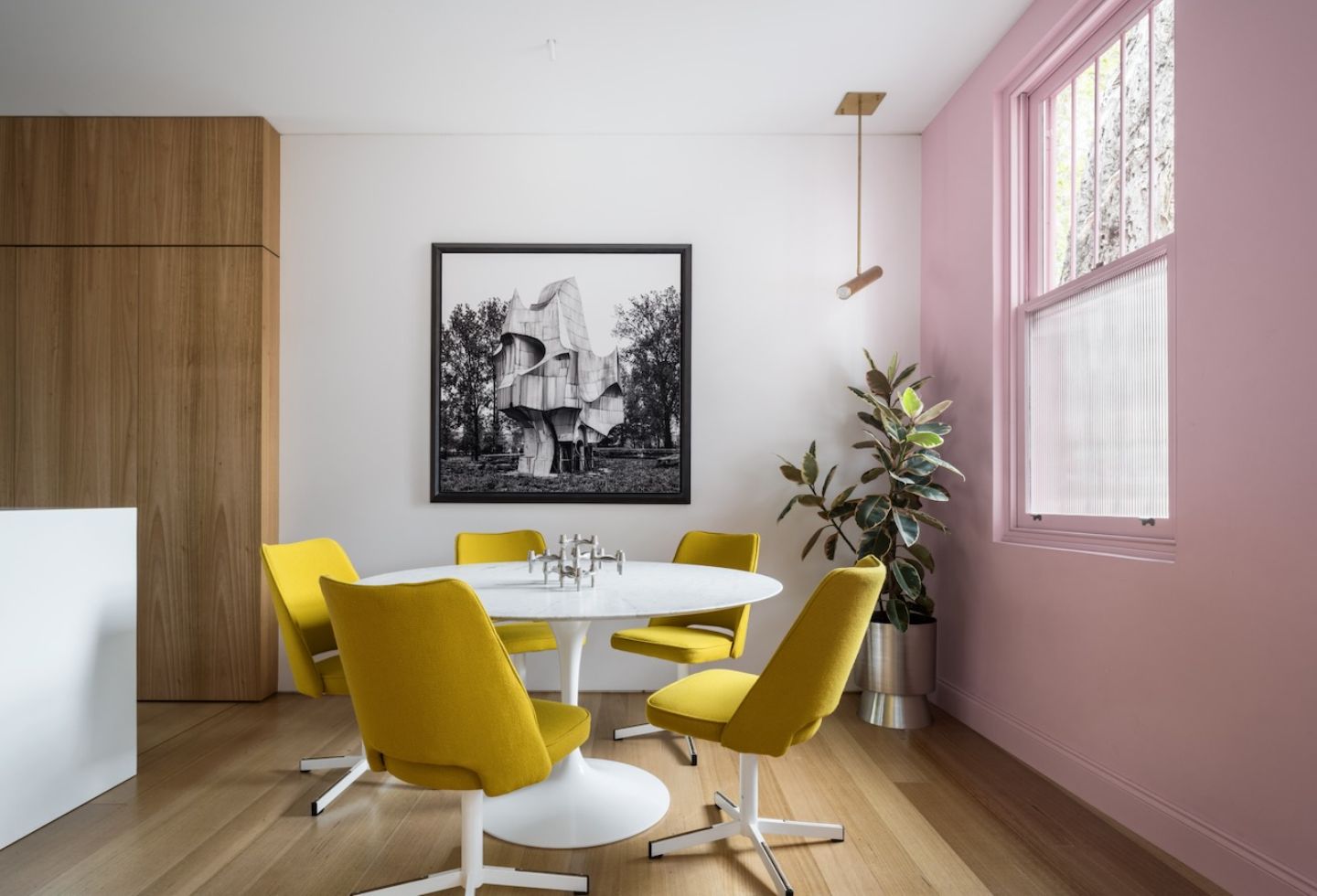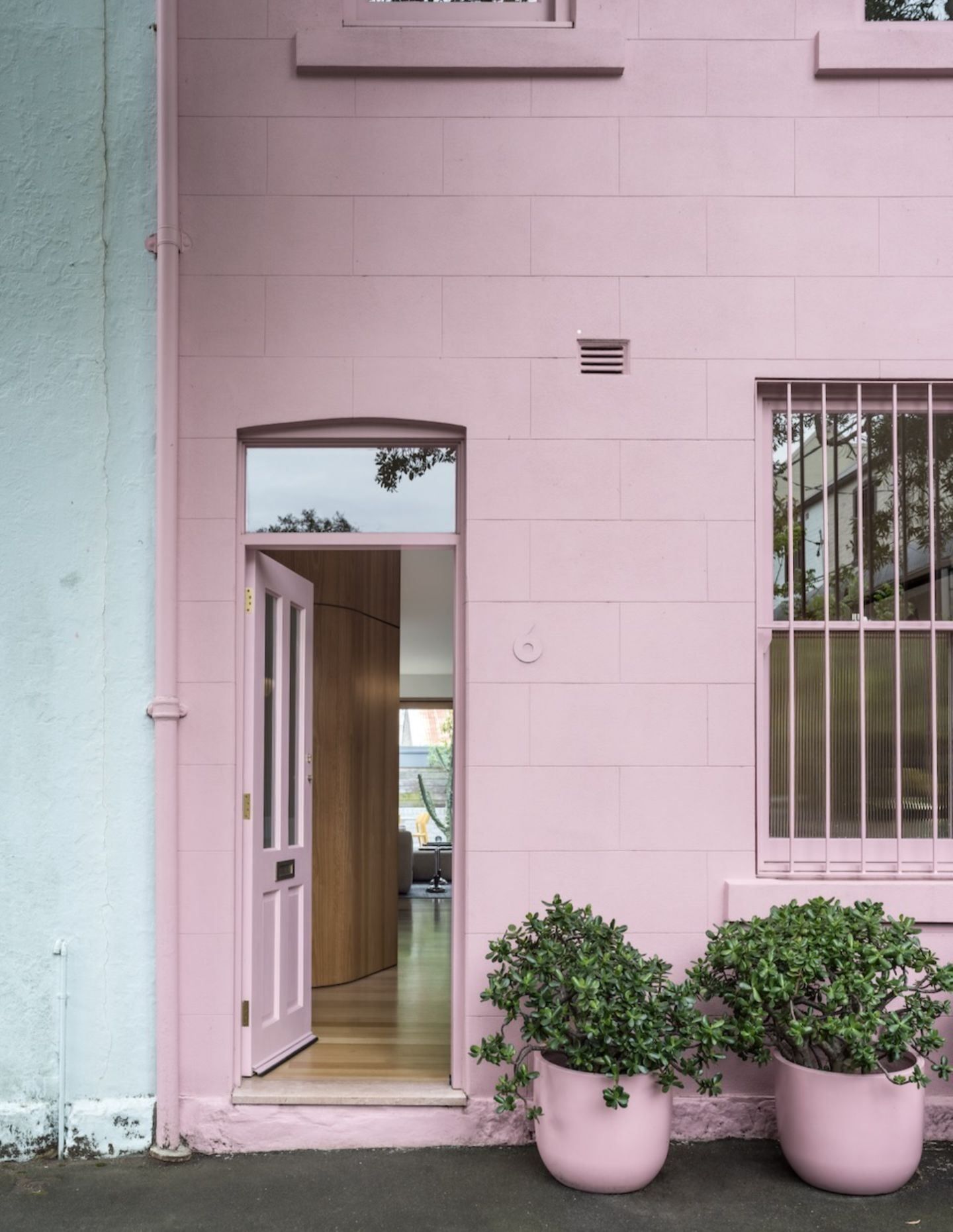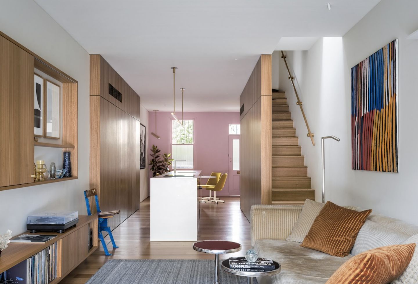 At the front, the restored façade anchors the project in its context. Painted pink — a reference to both historical precedent and the character of the street — it becomes a point of continuity. Inside, that colour carries through the front portion of the house before giving way to a more restrained palette, marking a subtle transition between what is retained and what has been reworked.