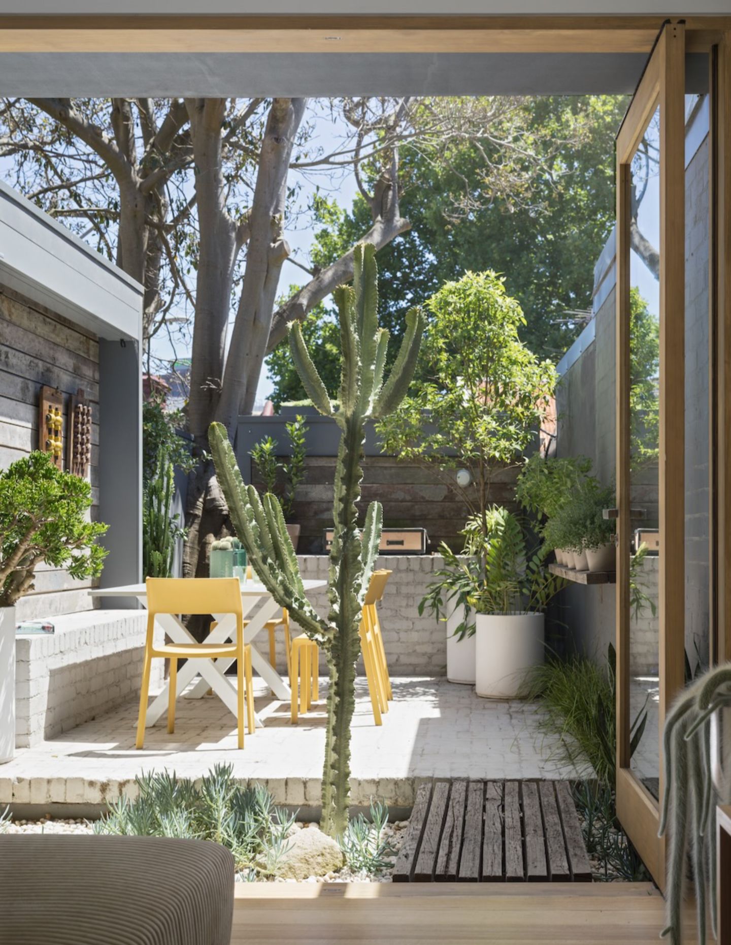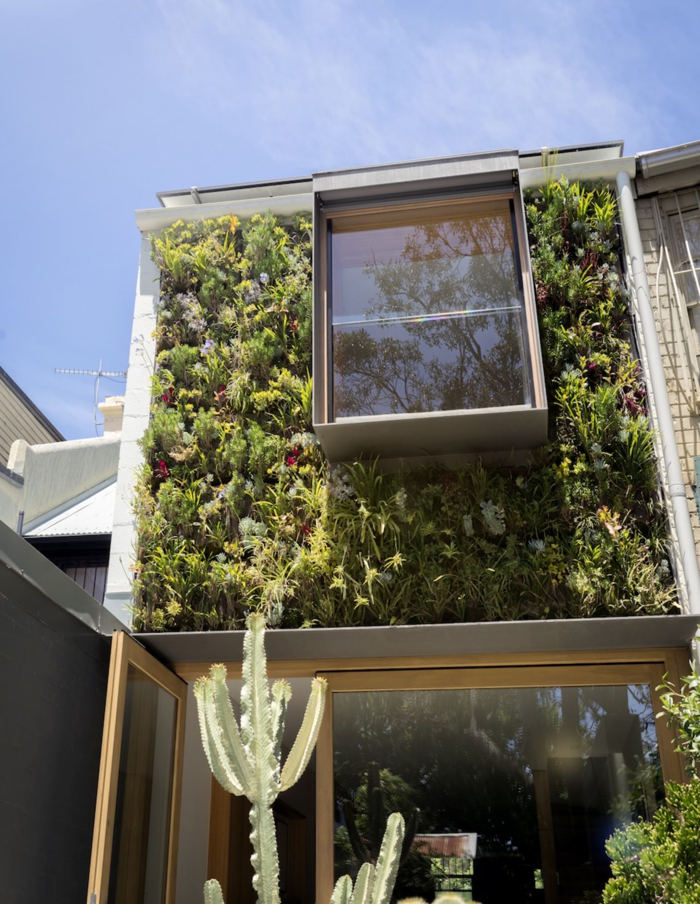 The rear shifts the tone again. Here, the “green house” emerges — a planted façade, rooftop garden and dense layering of vegetation that extend the architecture into the landscape. In a courtyard that measures just five by three metres, planting moves vertically, allowing the space to remain usable while still feeling immersed.