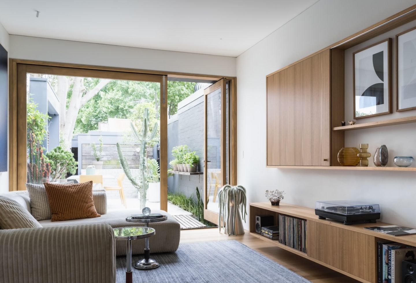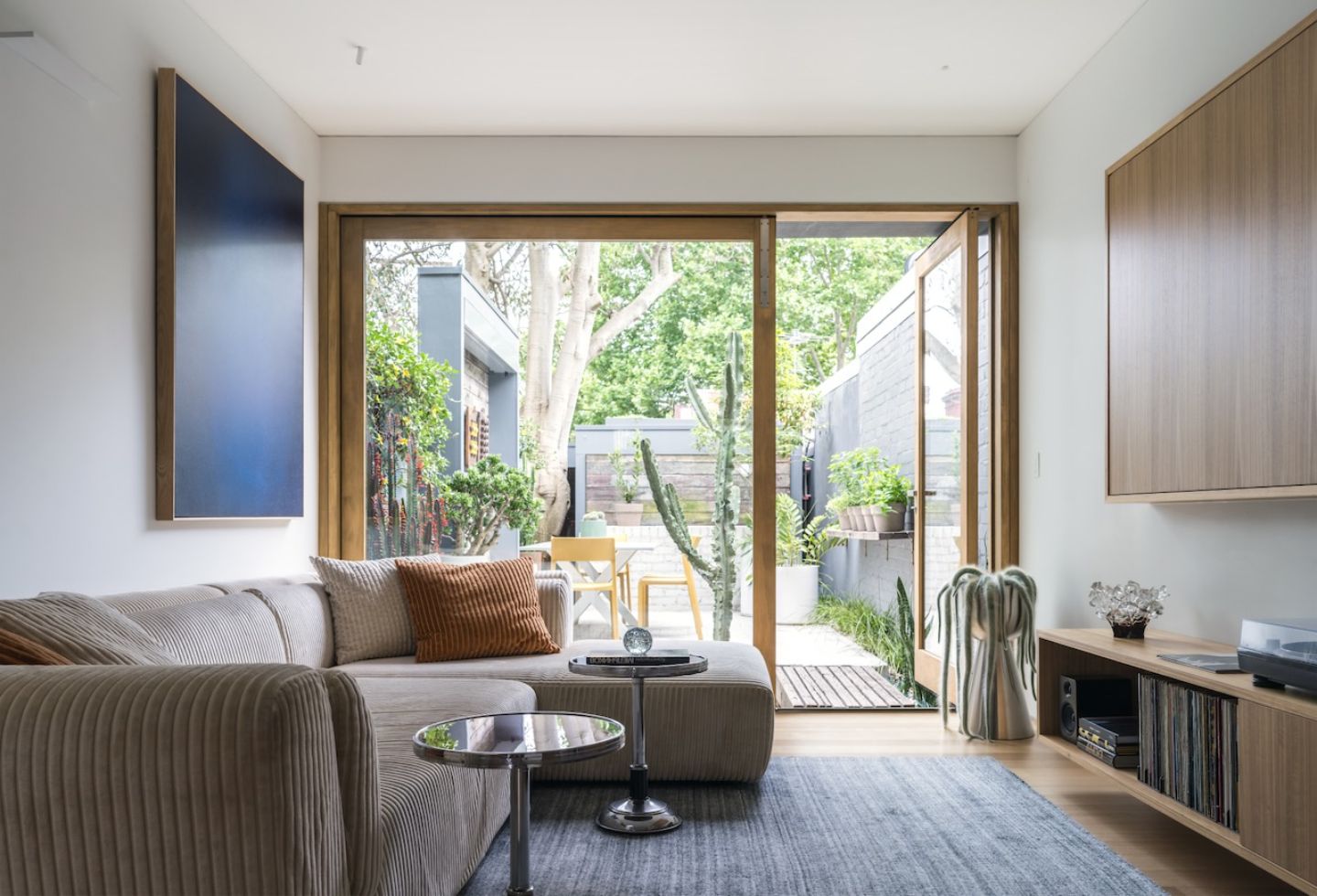 Light is what gives the house its sense of generosity. With no side windows, it becomes something to be carefully drawn through the plan — from the north-facing rear, from above and, more subtly, from the street. Bell treats light less as an outcome and more as a material. “You’re always working with light in a terrace,” he says. “It’s not something you add later — it’s what shapes the whole thing.”