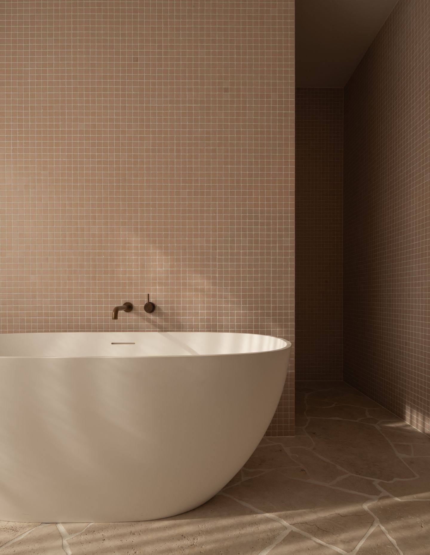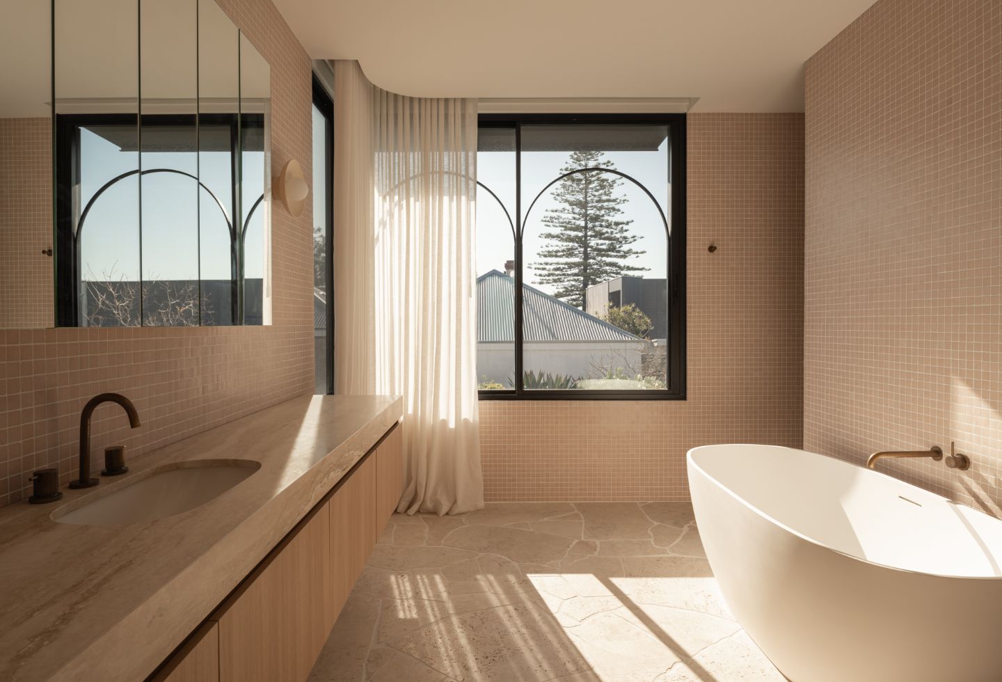 Unafraid of bold gestures, they splashed pink mosaic throughout the ensuite, which also has ocean beach views, travertine crazy paving inside and out downstairs and gently curving aluminium elements to the windows.