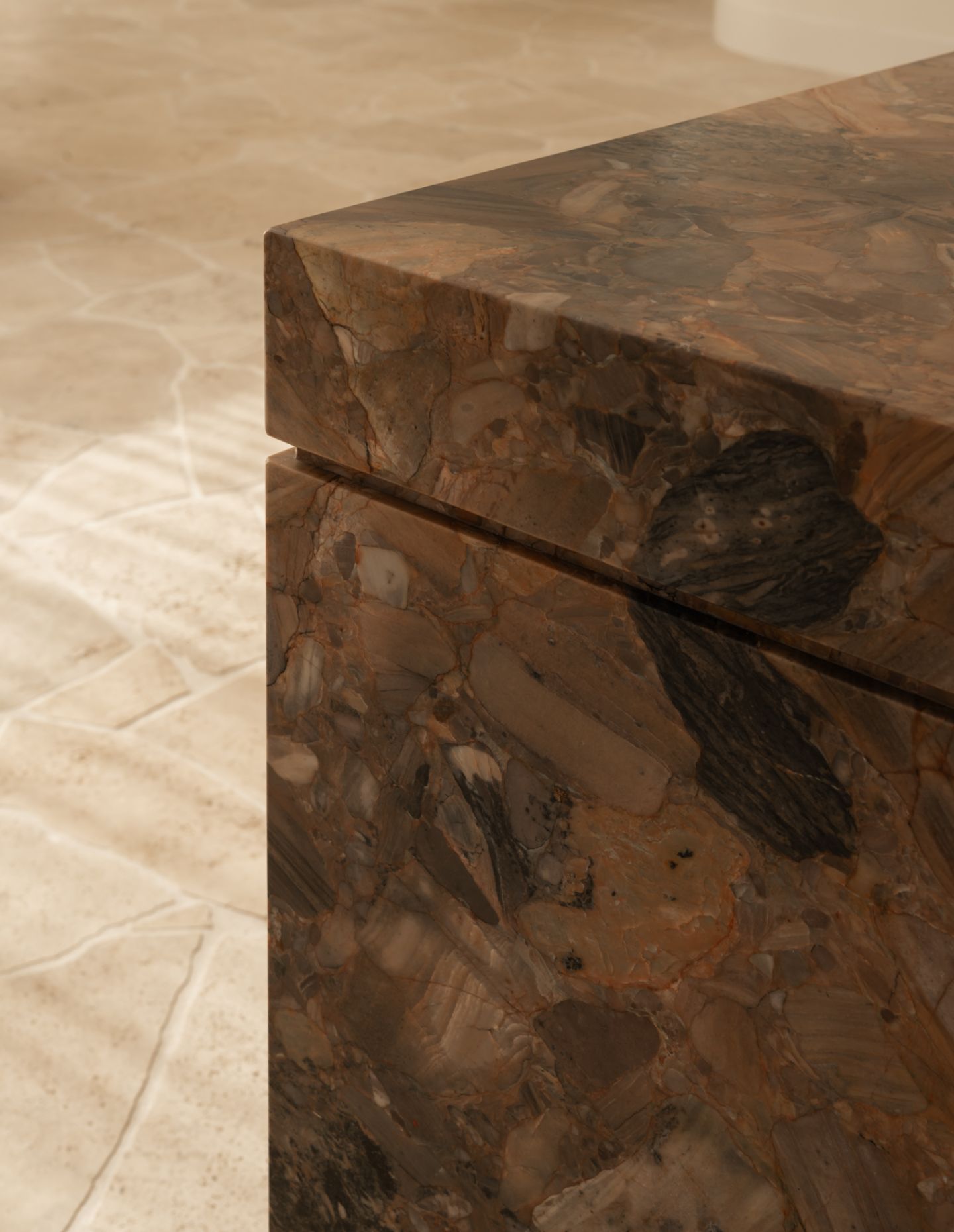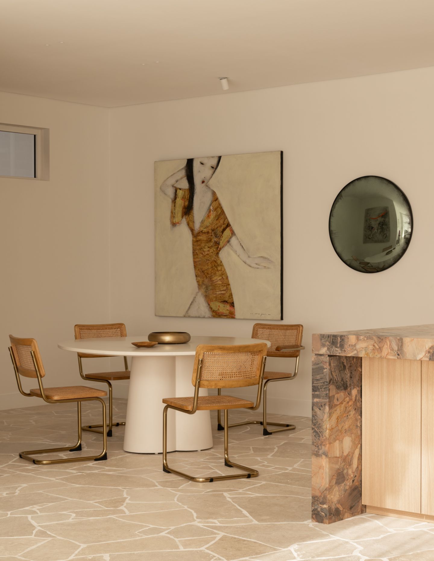 “It was a ‘happy accident’ that now anchors the kitchen with sculptural drama,” she laughs.