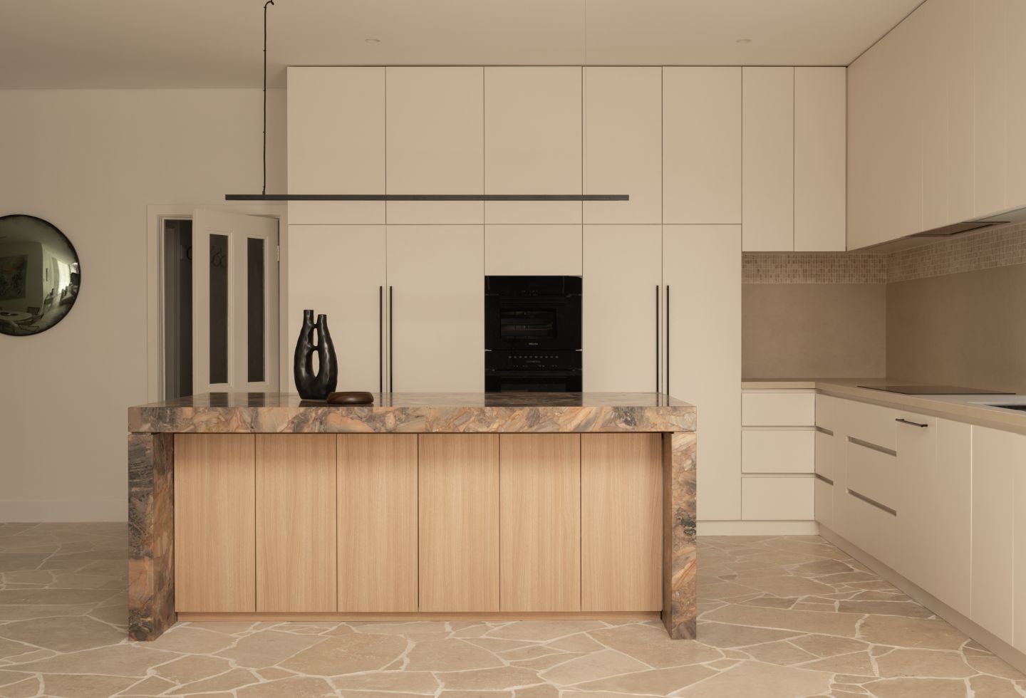 “We originally weren’t going to redesign the kitchen, but then discovered there was black mould in all the carcasses of the old kitchen. So, we redesigned it and picked beautiful Arabella quartzite for the monolith island, with bits of pink in it,” Lauren says.