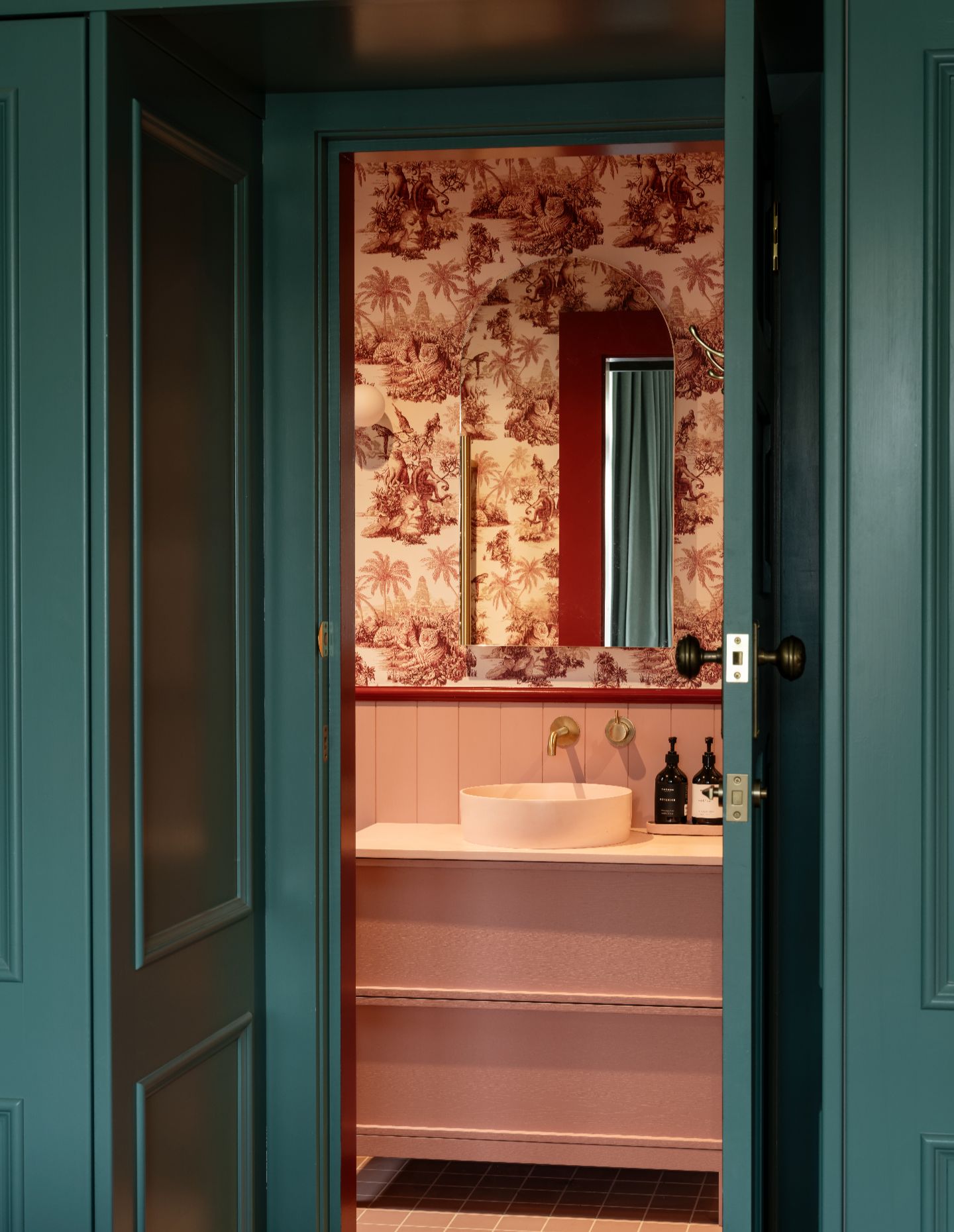 The villa extension re-establishes a long-lost dialogue with Tāmaki Makaurau’s volcanic field – reconnecting home, land and light. Throughout, a volcanic-inspired material palette grounds the project in place – deep reds, bold patterns, and playful wallpaper echo the underlying geology while expressing the character of its owners. Meanwhile, the sculptural skylight and borrowed views across the tree canopy bring the outside in, allowing light and foliage to shape the mood of the space.