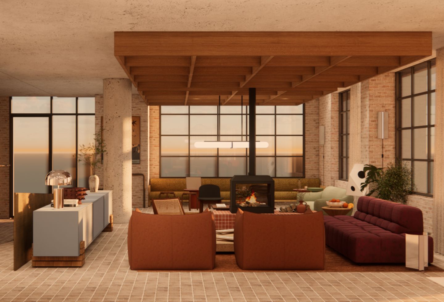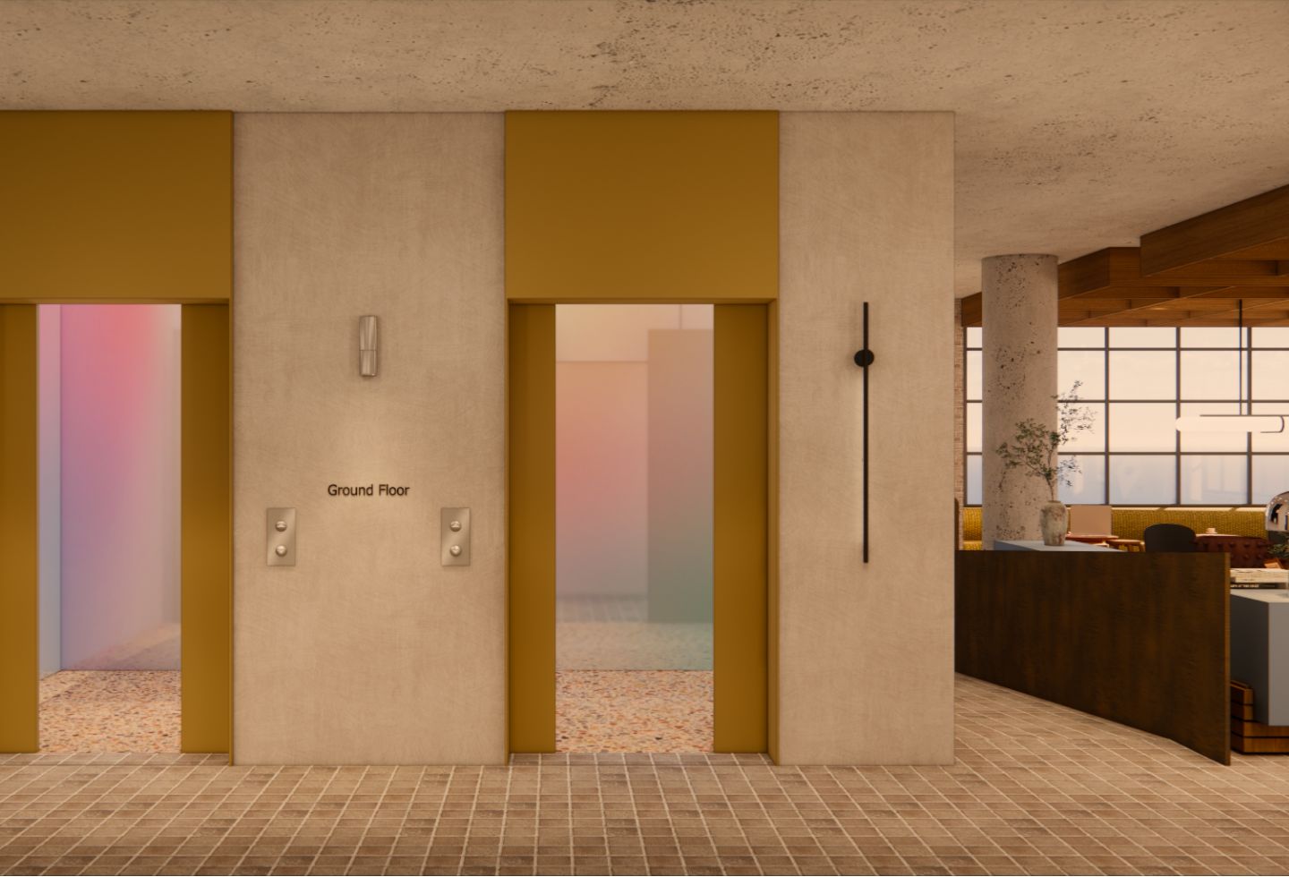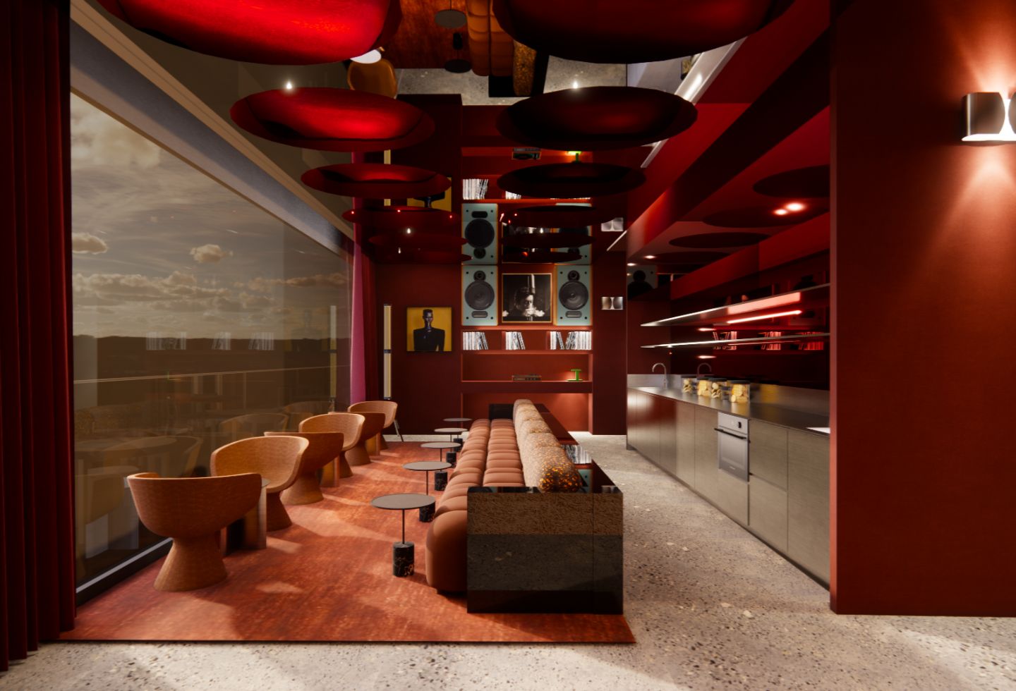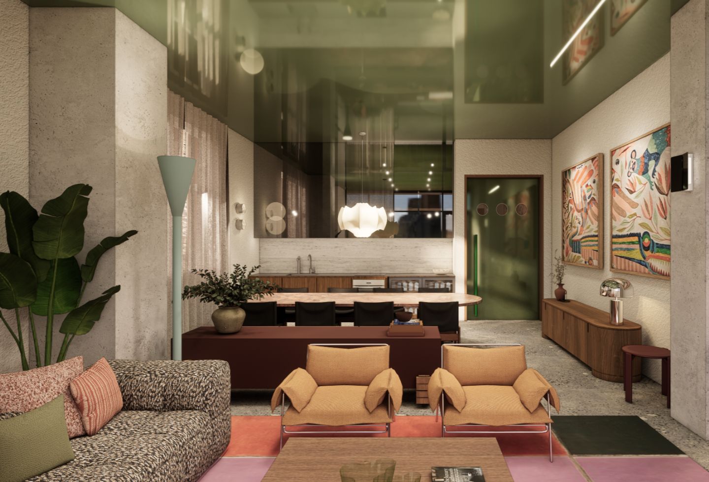 The design preserves the site’s industrial elements – exposed concrete, brickwork, warehouse forms – while layering in colour and domestic detail. A glossy green ceiling features in the private dining room. The ground floor lobby incorporates iridescent panels that shift with light. The cocktail bar uses cherry reds and crimson tones.