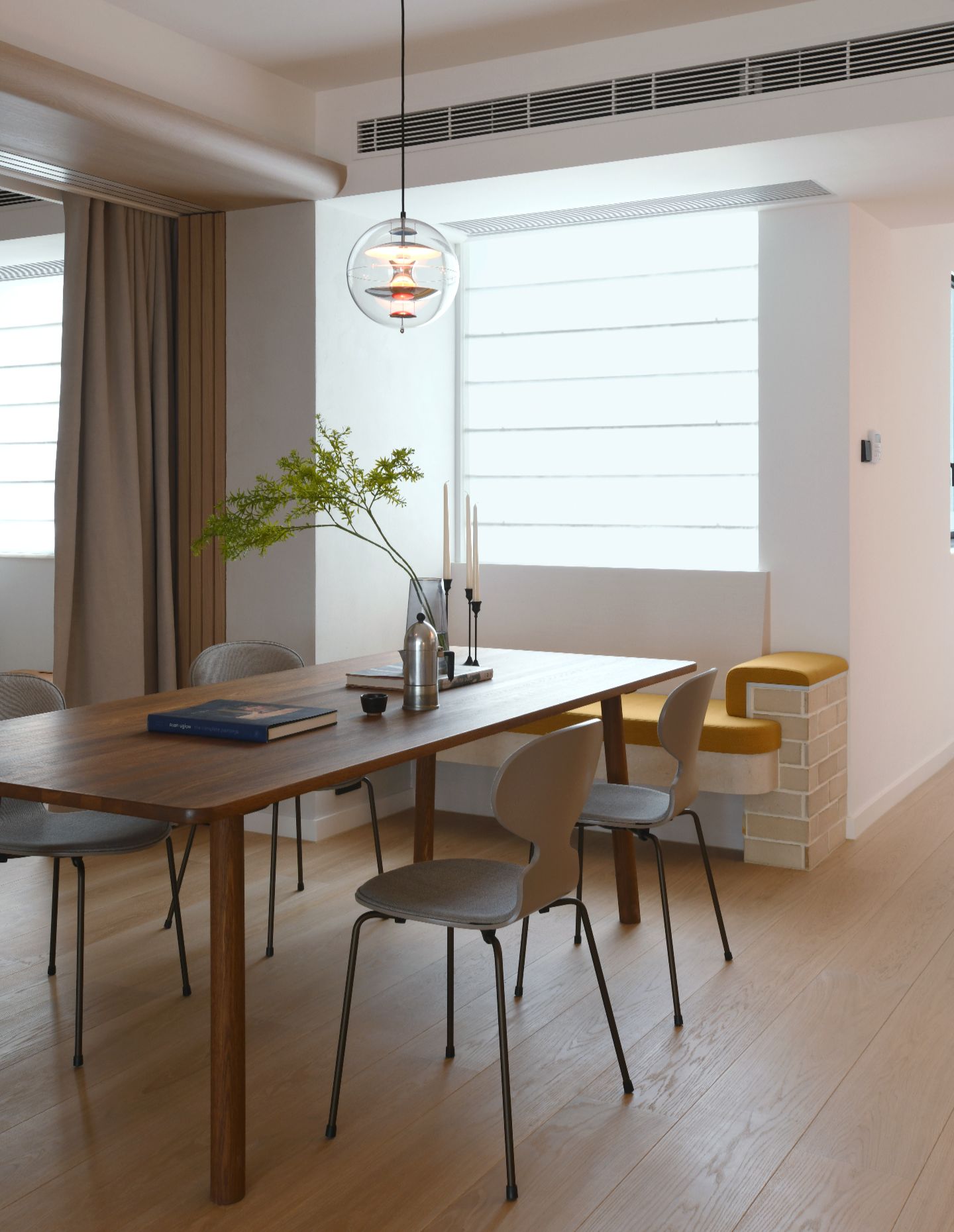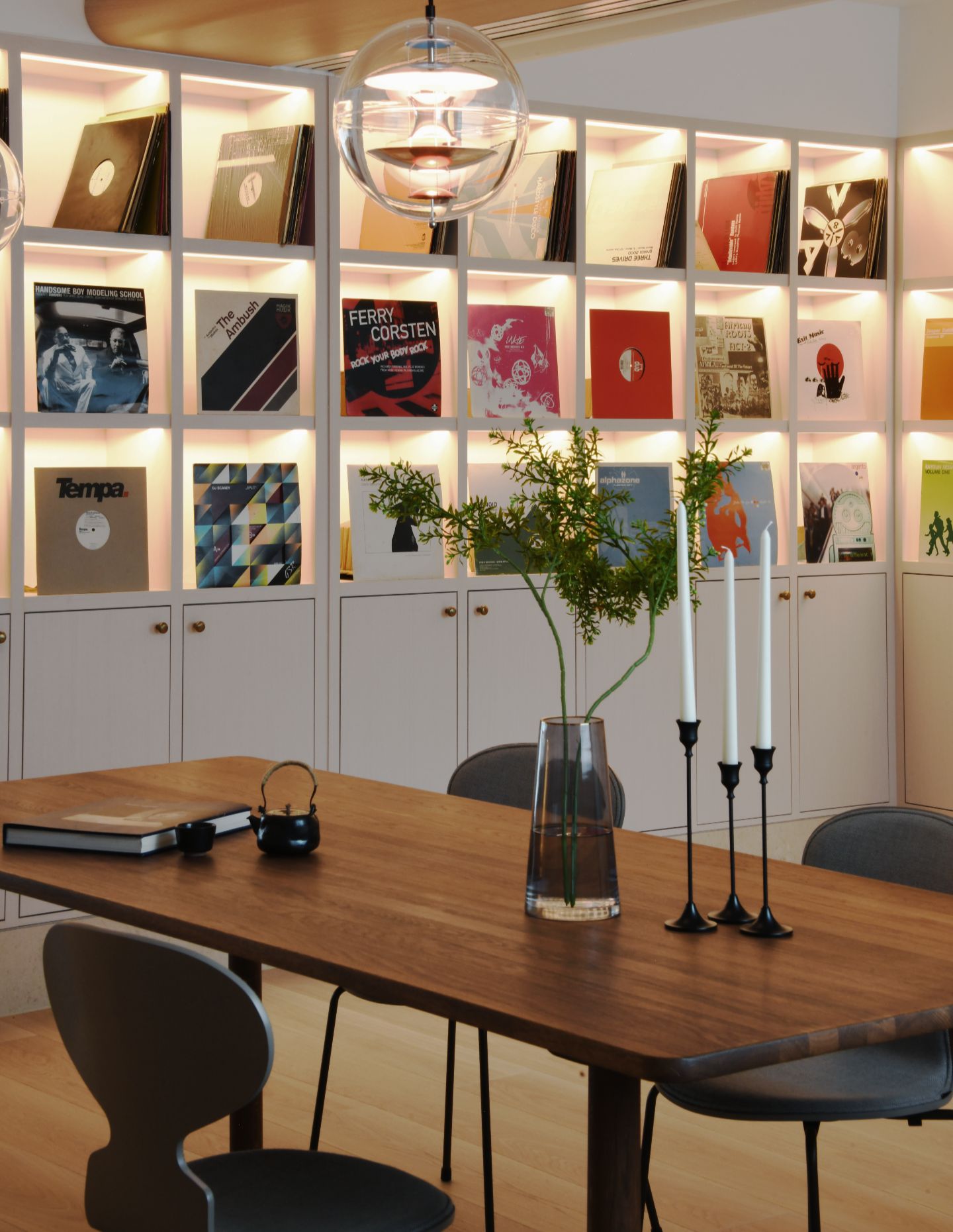Lighting has been carefully considered, with the VP Globe pendant by Verner Panton providing a focal point within the dining area. Designed in 1969, the light brings a subtle note of nostalgia and optimism, referencing both the Space Age and the warm glow of traditional street lighting. Here, it sits comfortably within the interior, contributing to the atmosphere without dominating it.