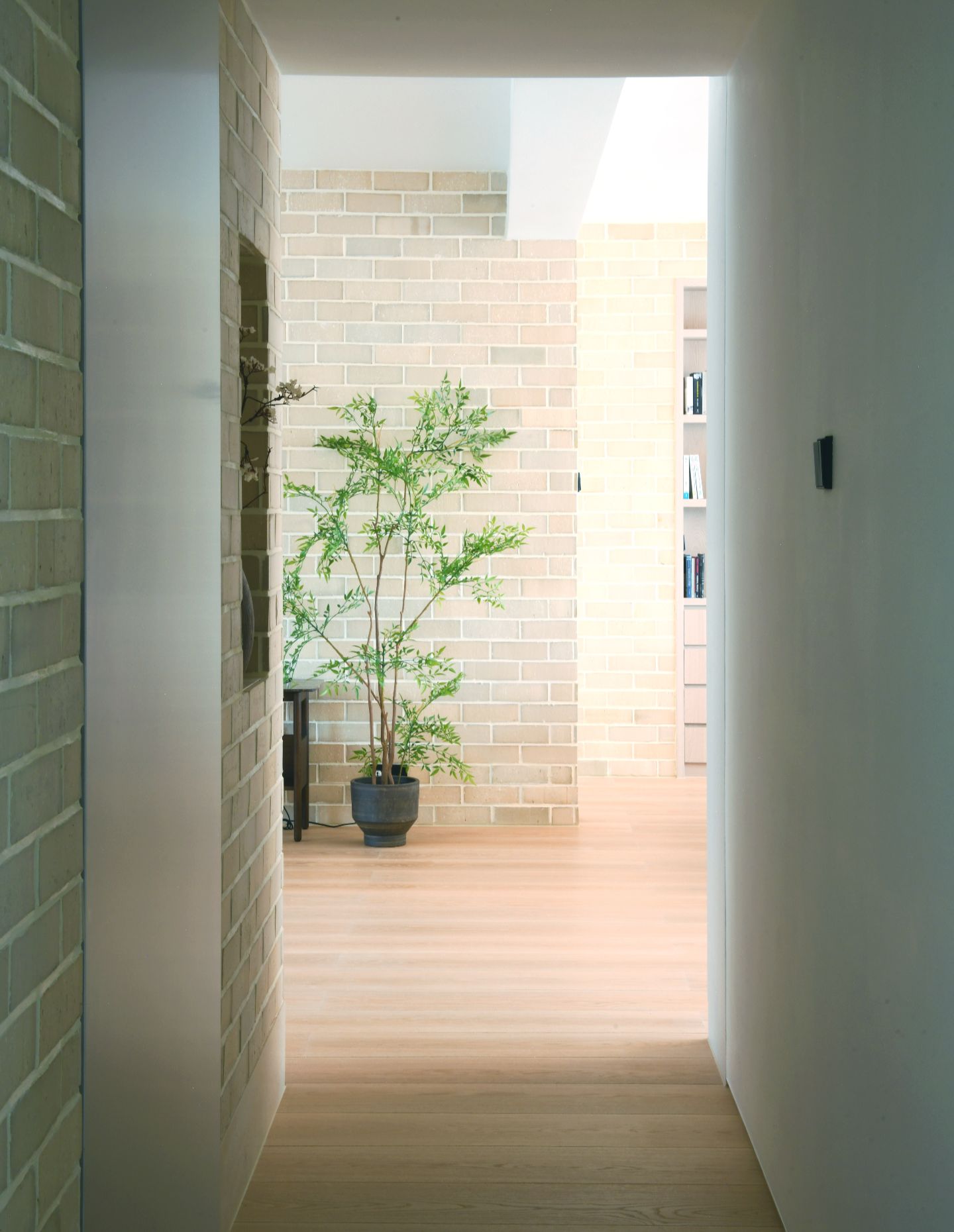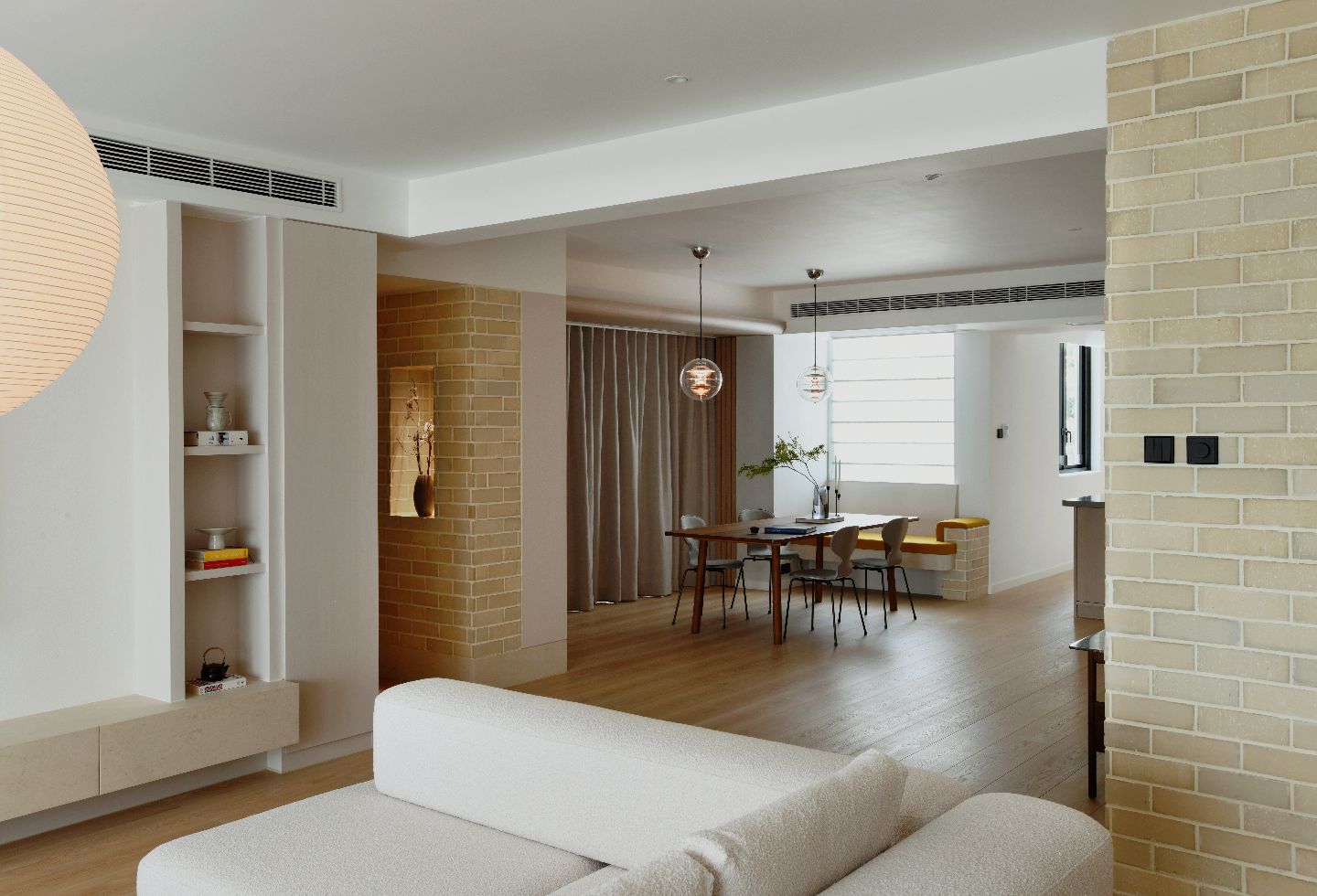 The walls of the living and dining areas are lined with handcrafted beige bricks from Krause Bricks, an Australian maker with a long history of artisanal production. The bricks have a subtle pink undertone that responds softly to daylight, creating a warm and settled atmosphere as light shifts across the space. Beyond their visual quality, the bricks speak to a broader interest in durability and longevity, offering strong thermal performance and a material lifespan measured in generations.