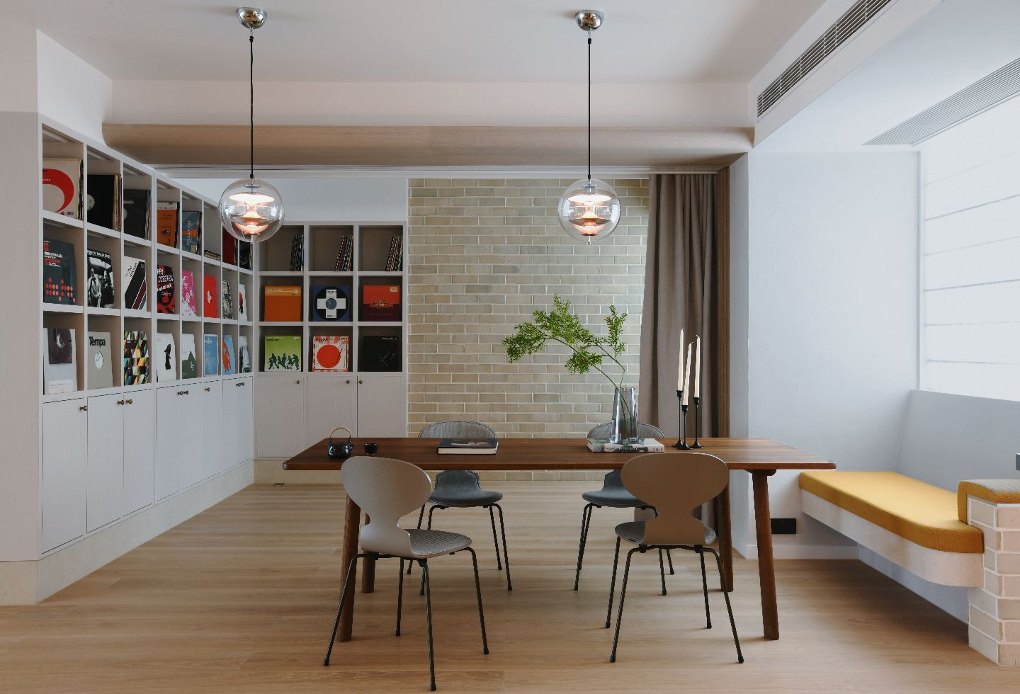 One of the defining elements is the reading room, positioned near the entry and separated from the dining area by a series of glass sliding partitions. These panels introduce a gentle threshold rather than a hard division, allowing light and views to move freely through the apartment. When opened, the dining space expands to accommodate larger gatherings, an important consideration for a client whose life often involves collaboration and hosting. When closed, the reading room becomes a quieter retreat, still visually connected to the rest of the home.