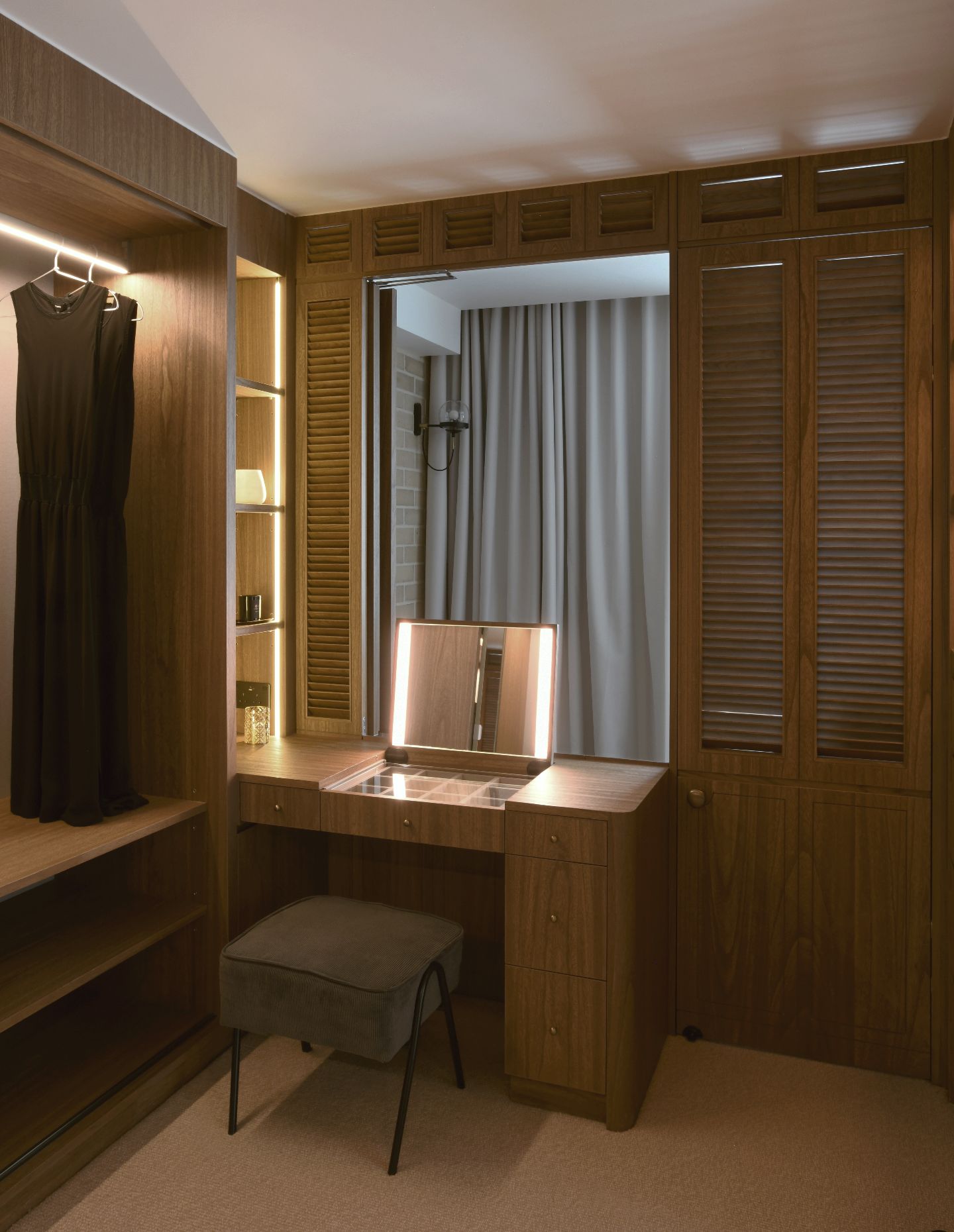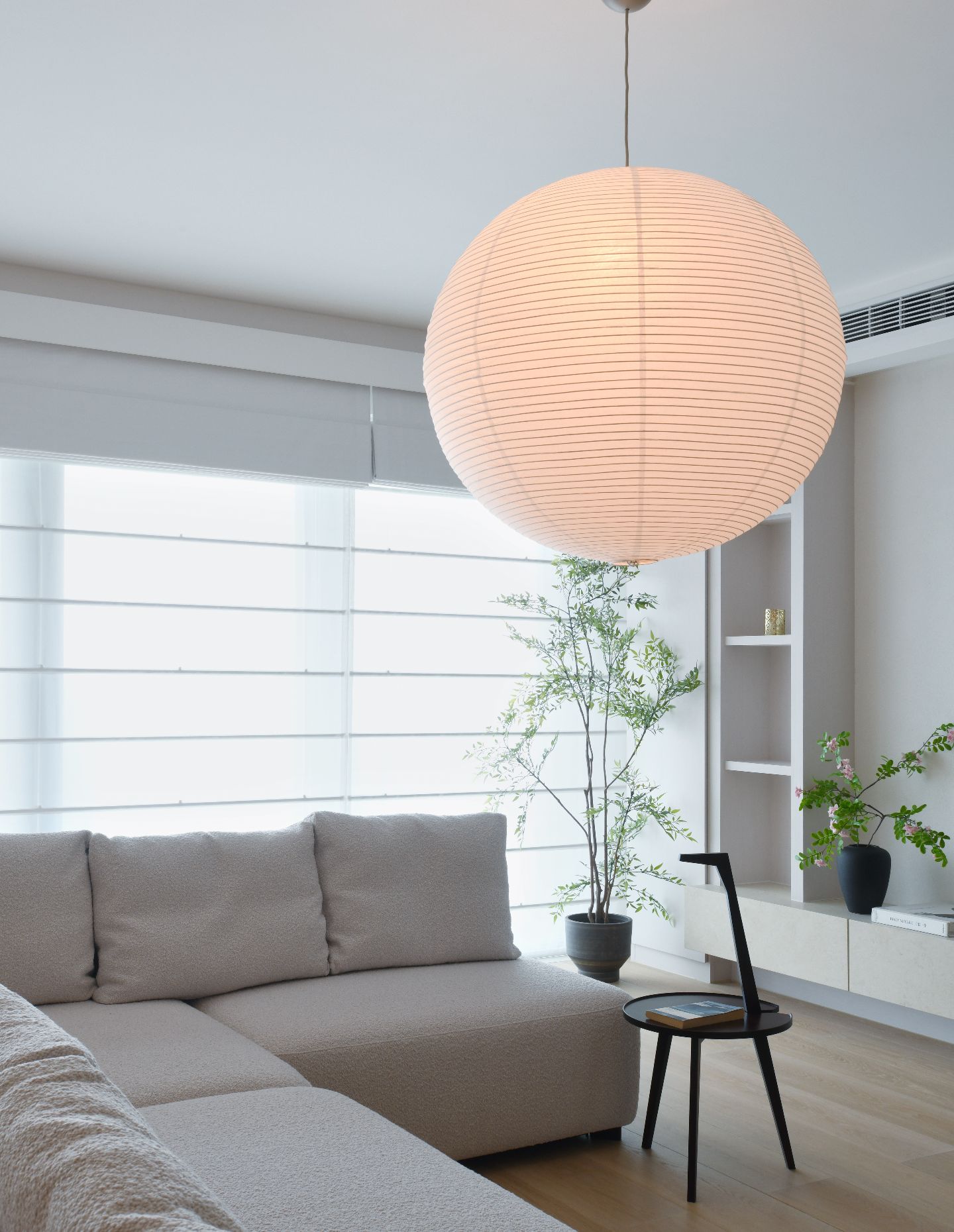 Textiles play a significant supporting role. Roman blinds introduce softness and help regulate light throughout the apartment, filtering glare while maintaining a gentle brightness. Their fabric folds add a domestic quality that balances the more robust materials, ensuring the interior never feels austere or overly formal.