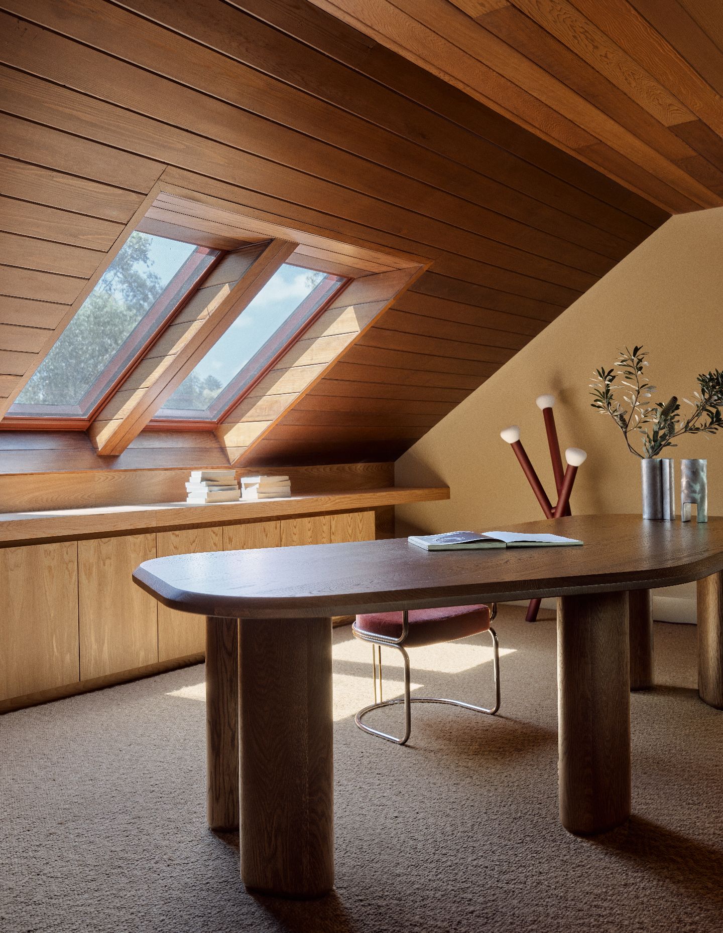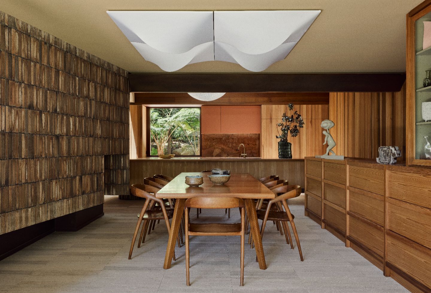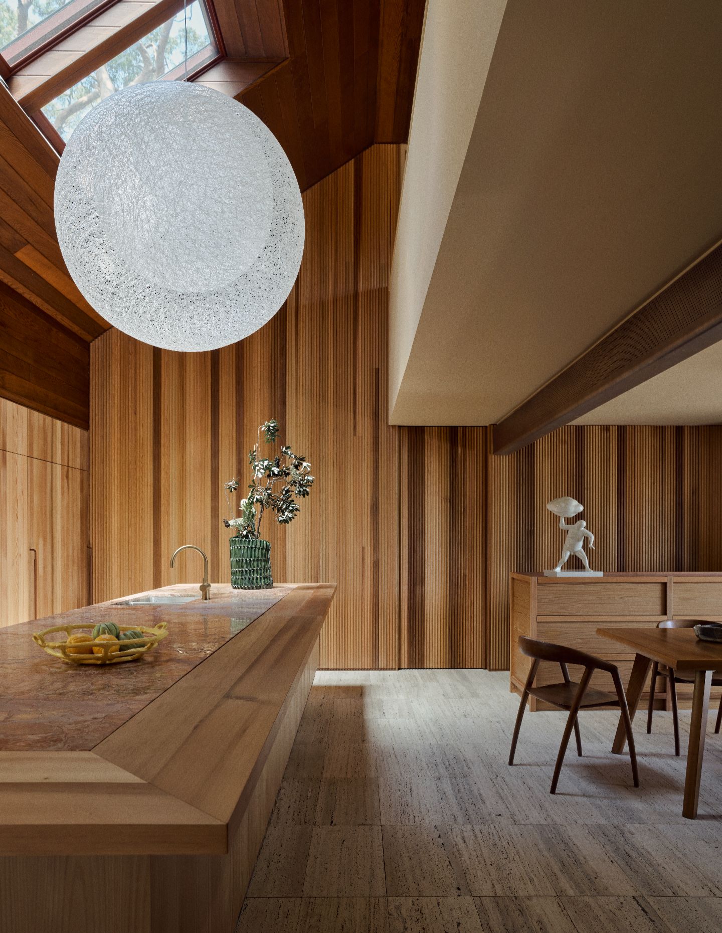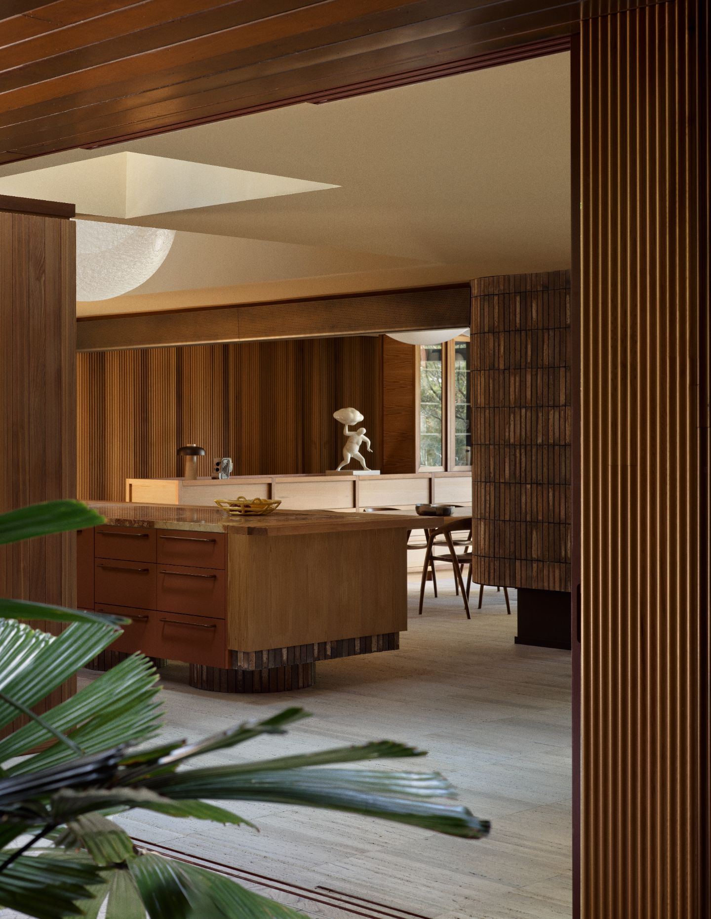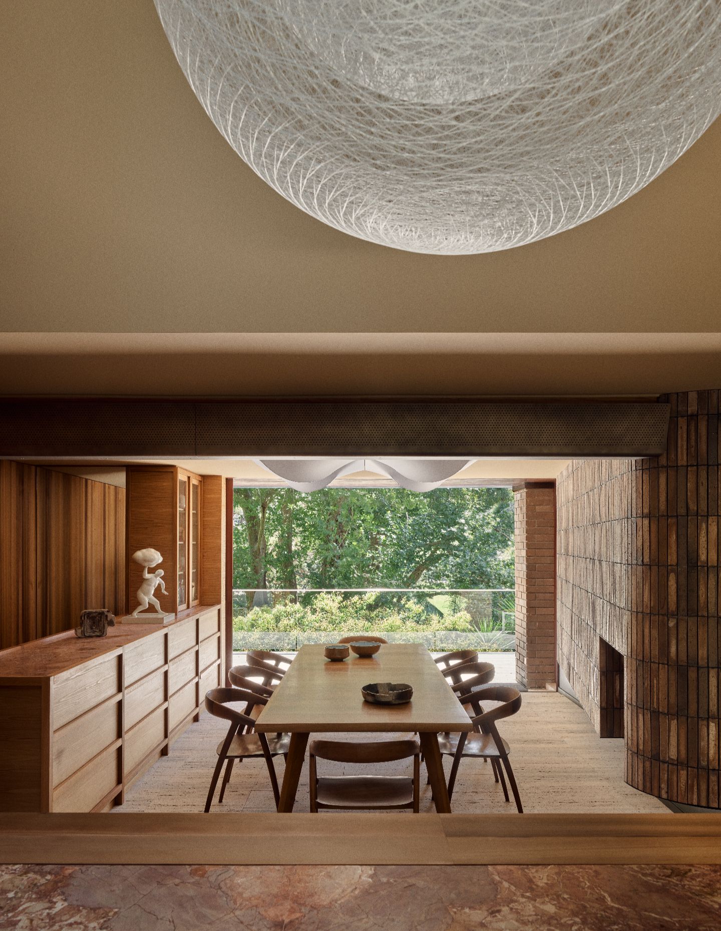 A luscious brown colour scheme anchors the project. The original ‘pier and void’ wire-cut brick, the dark glazed tile parasol roof and the raked western red cedar soffits are all retained and complemented by new layers of texture. Travertine, raw clay tiles, cedar panelling and tobacco grass-cloth deepen the organic materiality, giving the home intimacy even beneath its soaring ceilings.