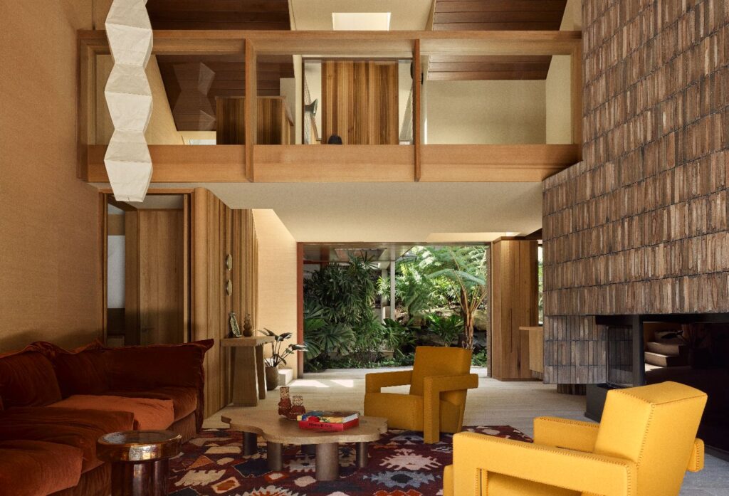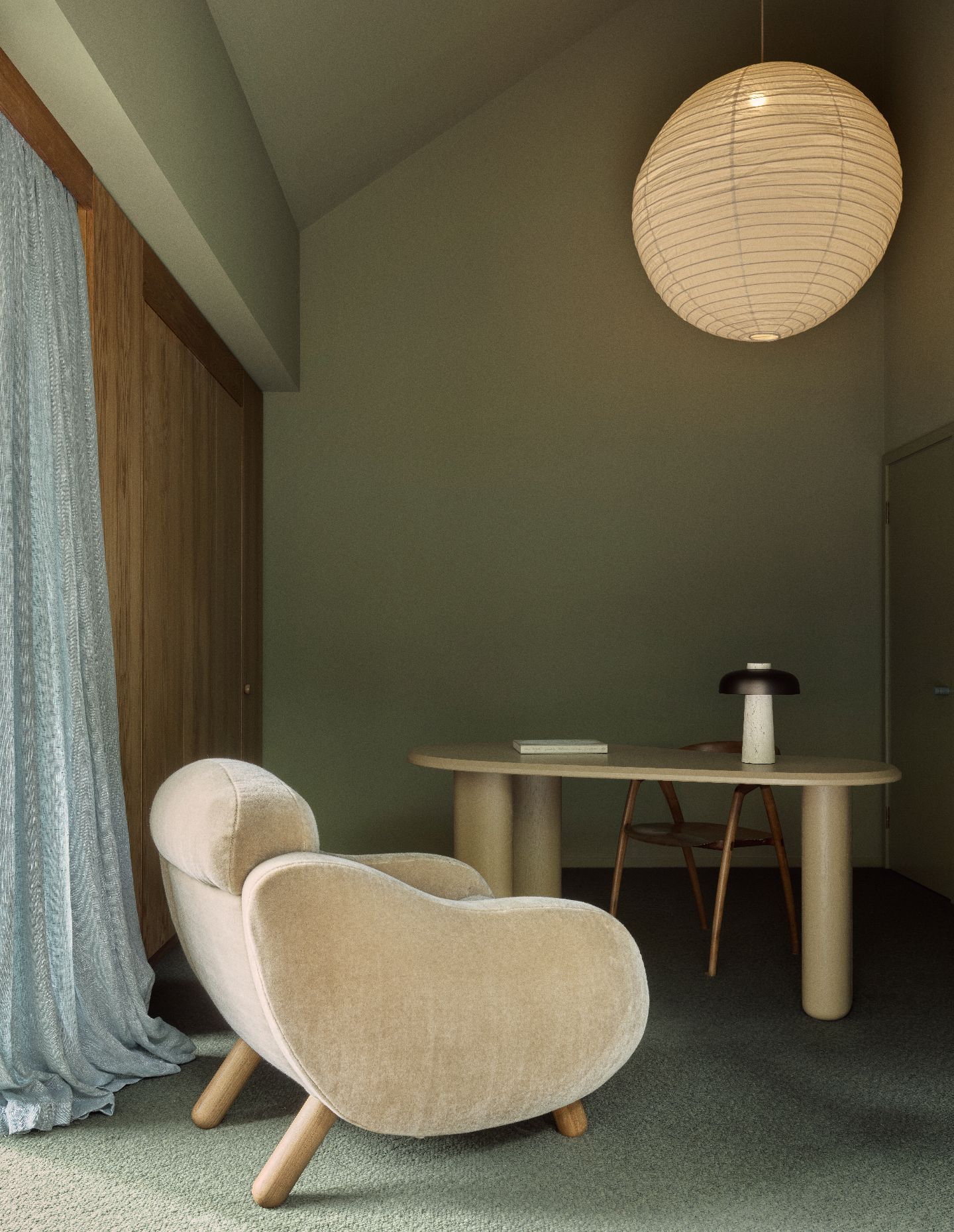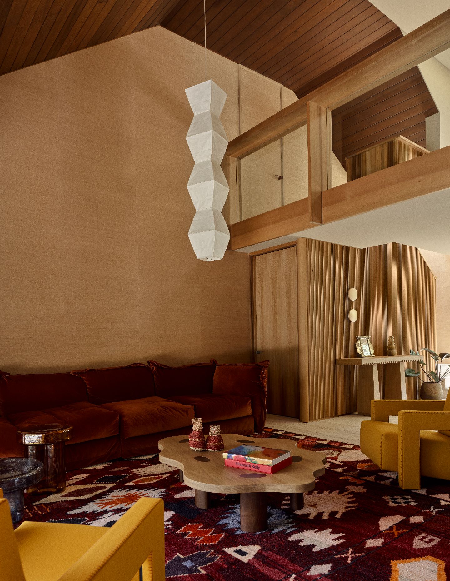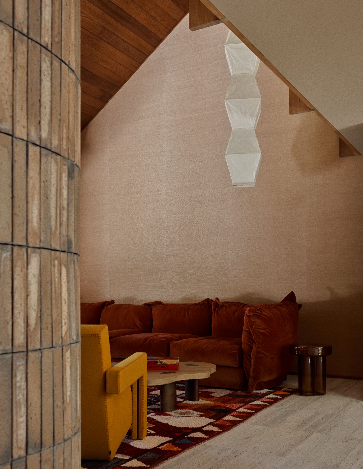 Striato travertine floors act as a neutral counterpoint to the warm tan and coffee tones, softened by rugs underfoot. Frameless glass balustrades are framed in cedar, creating subtle ledges, while walls alternate between painted and clad finishes to manipulate light. Sculptural lighting becomes a recurring motif: the delicate Yamagiwa Mayuhana pendant light, undulating Saori Q2 ceiling lights by Kazuhide Takahama and wall sconces by Henry Wilson.