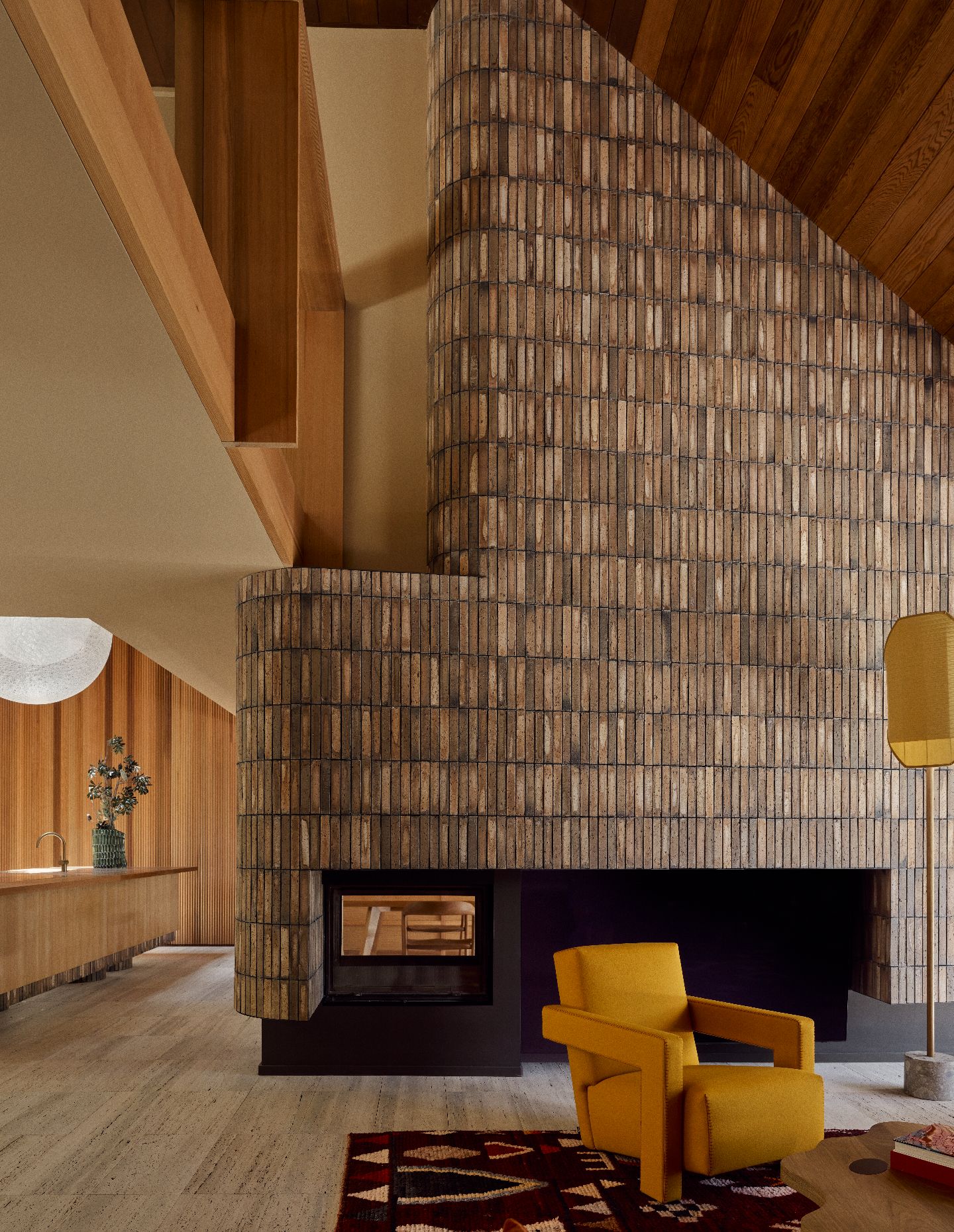 At its core, a double-height curved fireplace forms the heart of the plan, dividing the living and dining rooms. Clad in Artedomus’ Momoyama Japanese ceramic tiles, it extends into the kitchen, where red cedar cabinetry by Calibre Project Group meets Tiberio marble benchtops and splashbacks. The kitchen island plays with proportion, moving up and down to conceal and reveal the benchtop – a creative methodology to hide the food prep away from the dining table.