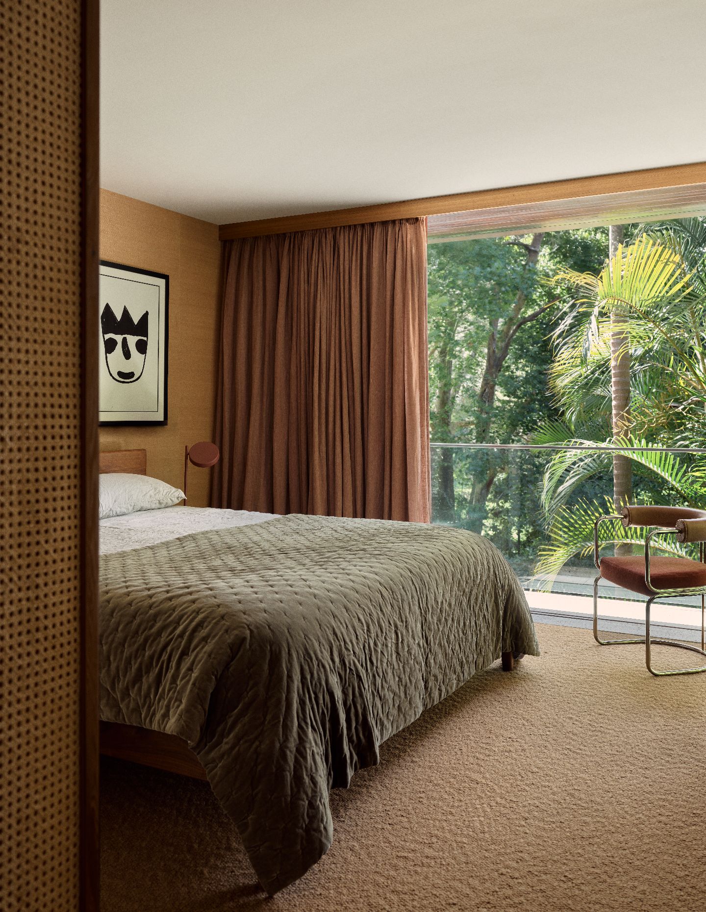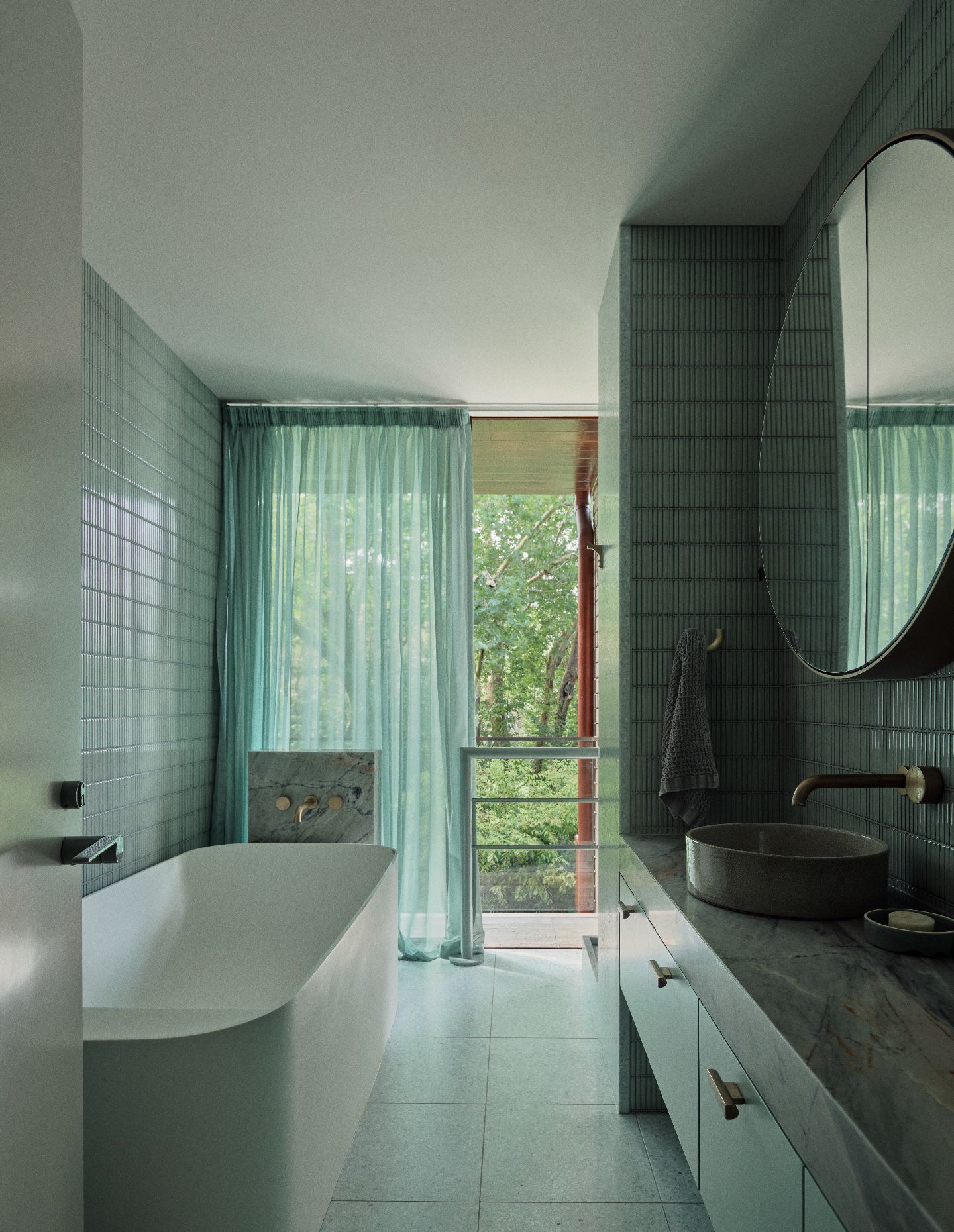 The bathrooms are a study in calm contrast, their cool aqua palette offering respite from the warmth elsewhere. Faustina marble, Suki turquoise penny-round mosaics and Fibonacci Rocketman terrazzo tiles form a layered composition, paired with Anton wall lights from Volker Haug Studio. Framed by lush views of Dangar Barin Smith’s landscaping, these spaces feel almost spa-like.