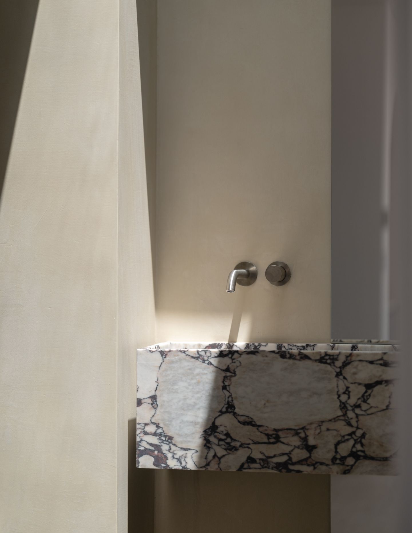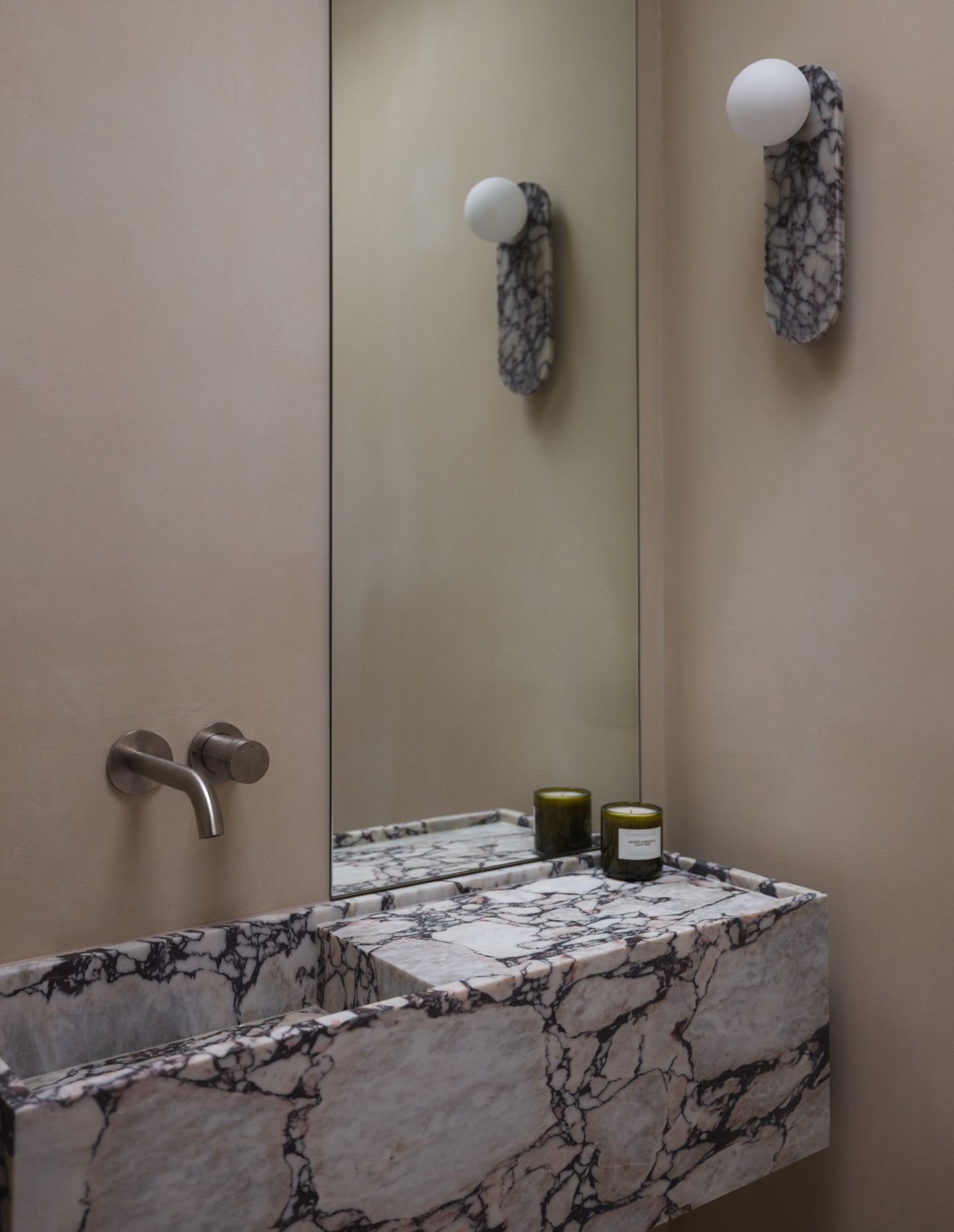 In the more intimate rooms, scale and atmosphere were carefully considered. The powder room, in particular, became a moment of pause. Sculptural stone, soft surfaces and gentle lighting coming together to create a sense of stillness within the home.
