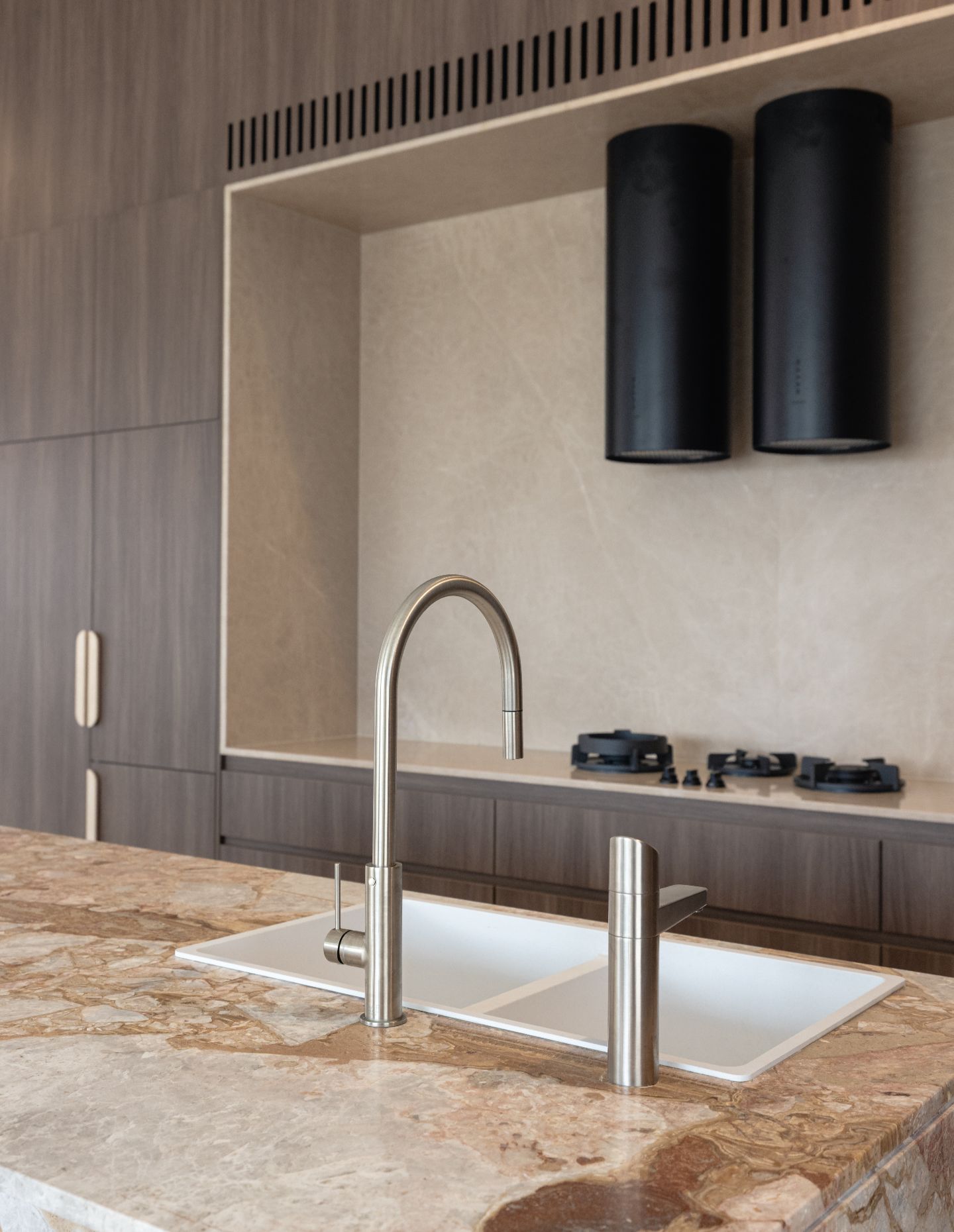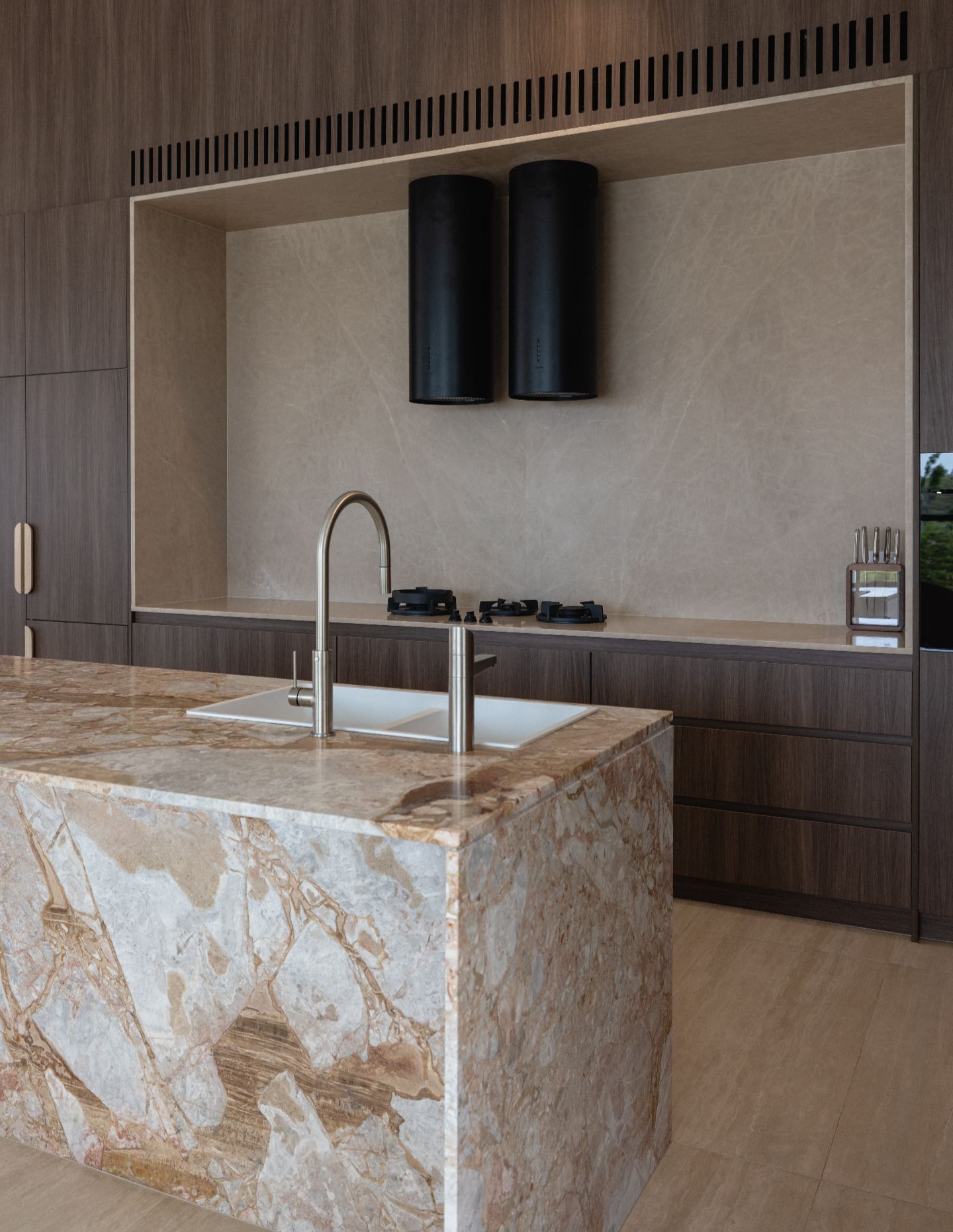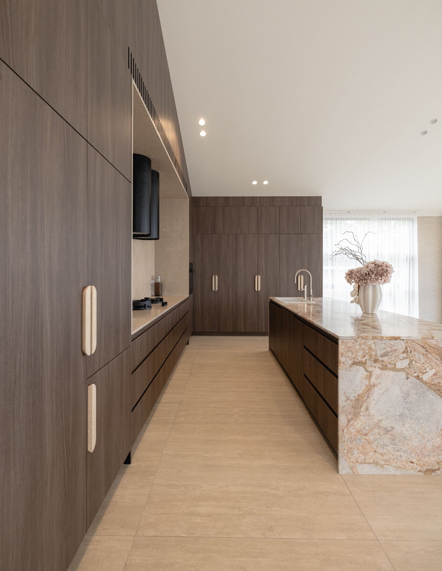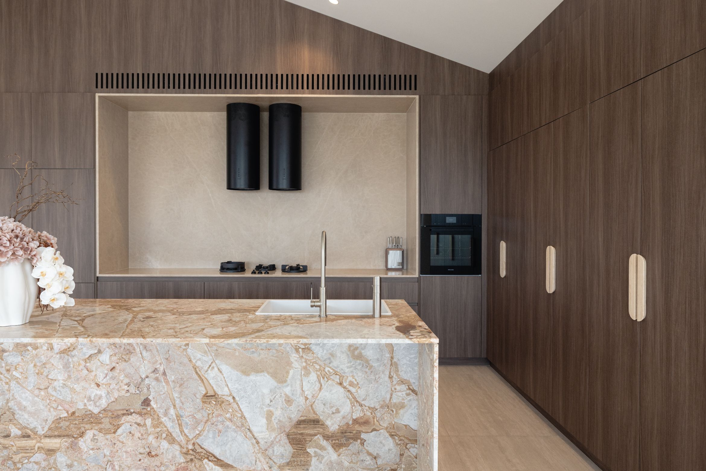 In the kitchen, this intent revealed itself through a more expressive use of material. A coloured stone was chosen to bring warmth and personality, moving away from a purely neutral palette and allowing the space to feel layered and lived-in. Its natural veining and shifting tones create a gentle sense of movement, giving the kitchen depth and character that evolves with light throughout the day. Paired with warm timber joinery and understated detailing, the space feels inviting and grounded. The kitchen became a central point of connection, where natural stone introduces movement and character, while the surrounding joinery brings warmth and balance. It’s a space designed to be lived in daily yet still carries a quiet sense of occasion.