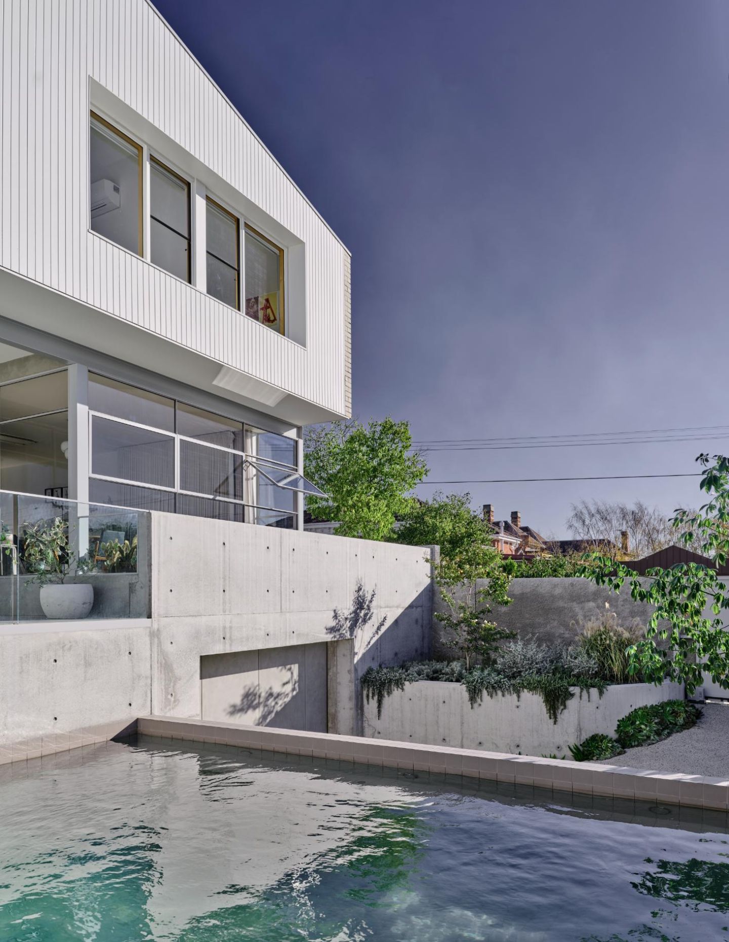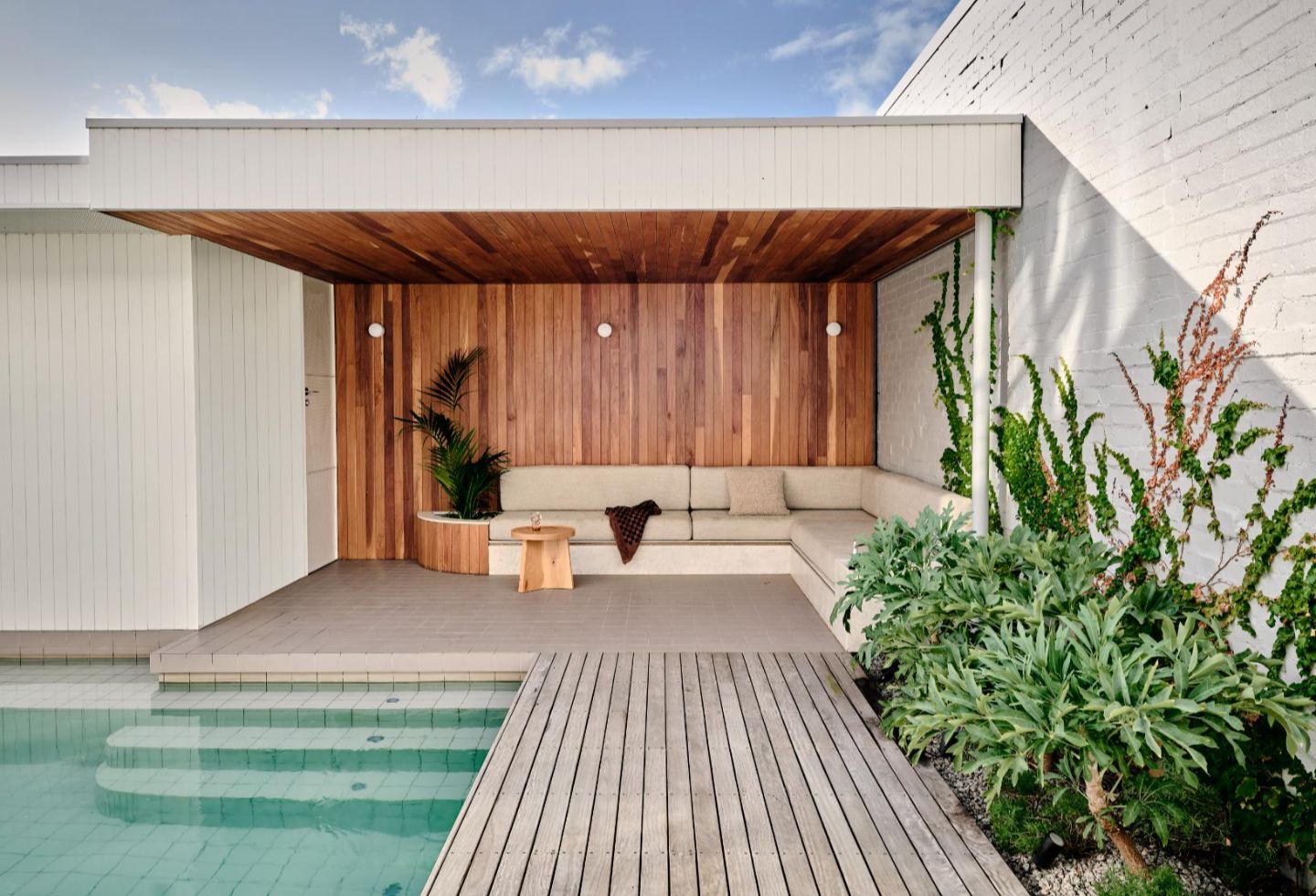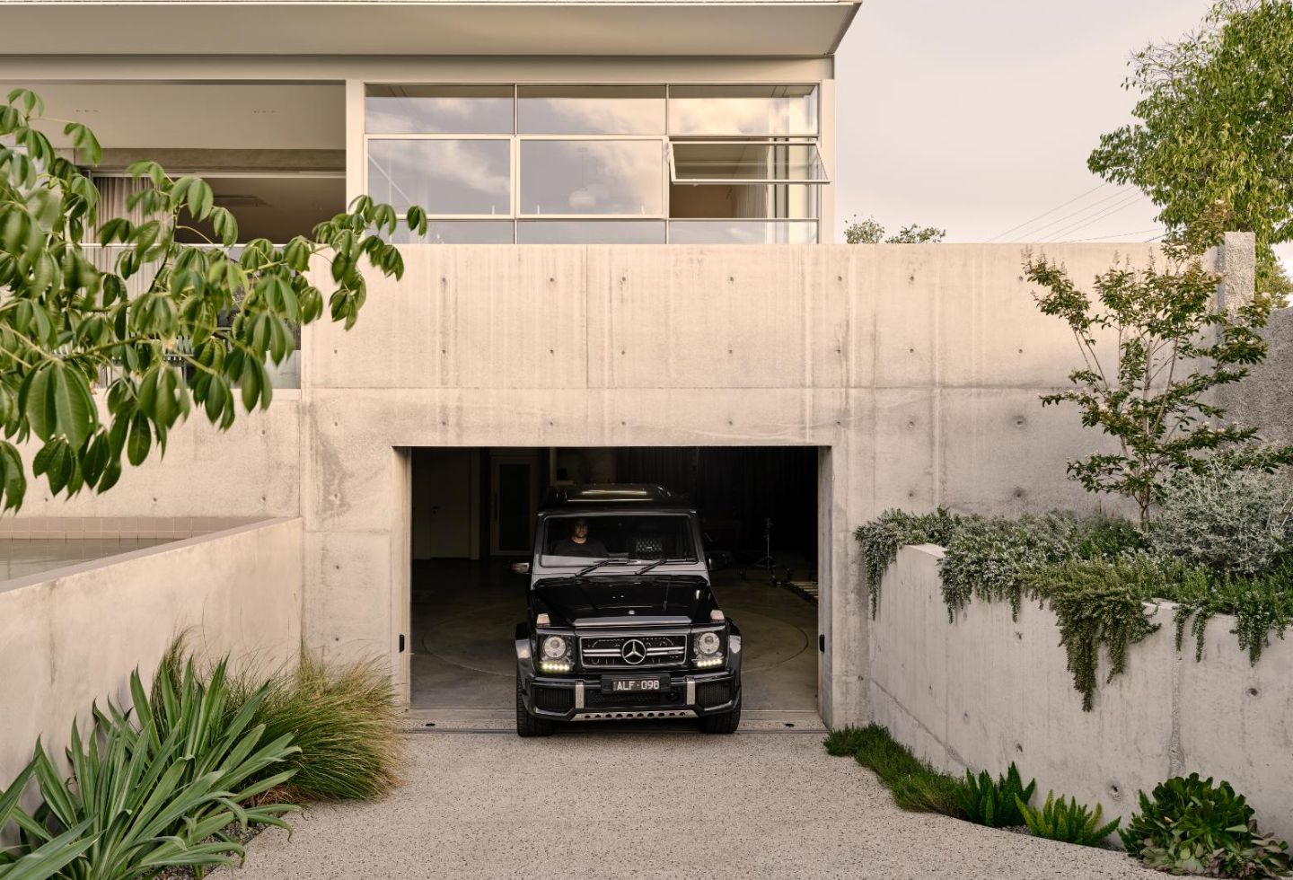 The design is an amalgamation of mortared brickwork, glass, stucco and timber. Beyond this, concrete always holds a common presence throughout; a burnished concrete floor flows from the sunken living room to the outdoor dining terrace, whilst cast-in-situ concrete walling of the building and pool sits proudly nearby.