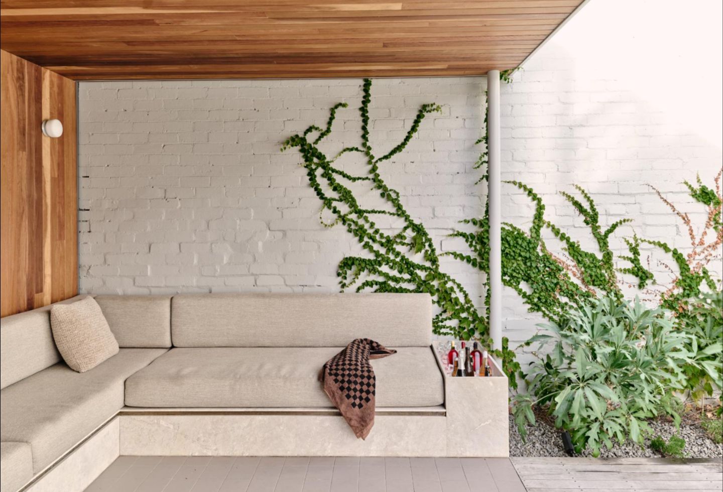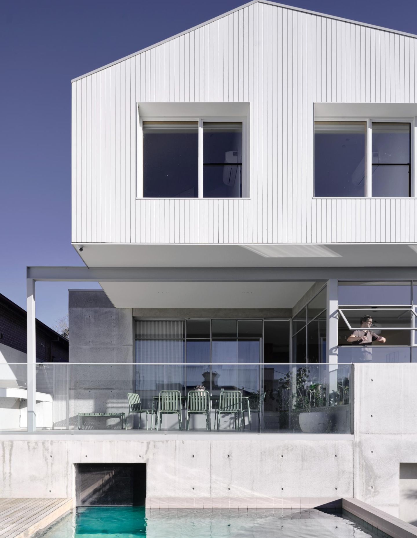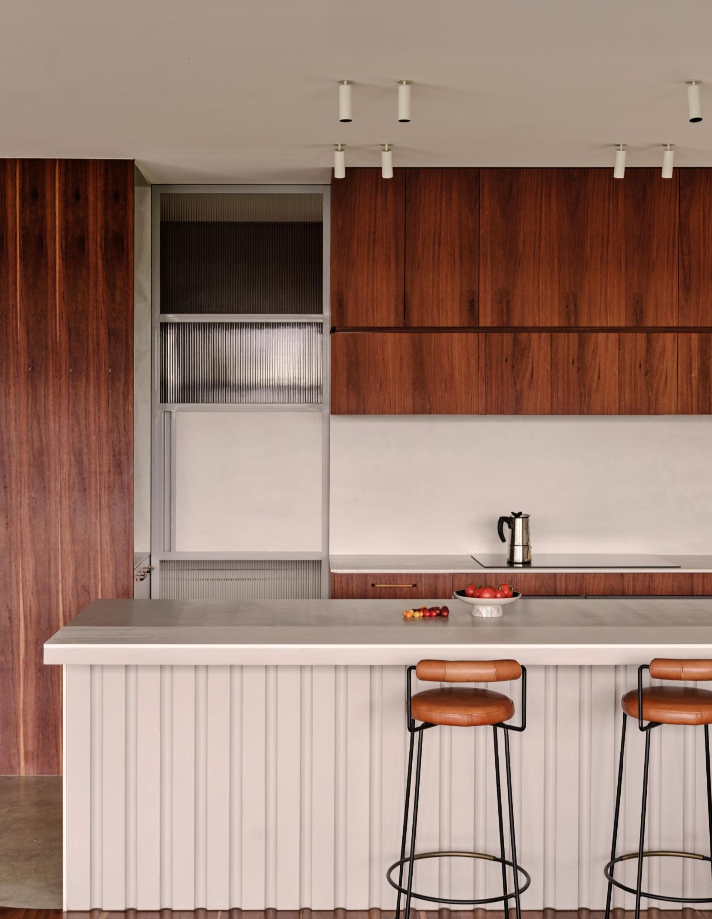 The design is an amalgamation of mortared brickwork, glass, stucco and timber. Beyond this, concrete always holds a common presence throughout; a burnished concrete floor flows from the sunken living room to the outdoor dining terrace, whilst cast-in-situ concrete walling of the building and pool sits proudly nearby.