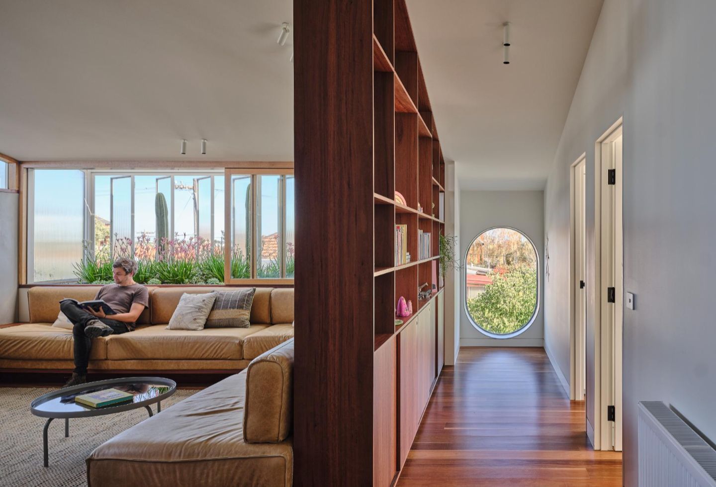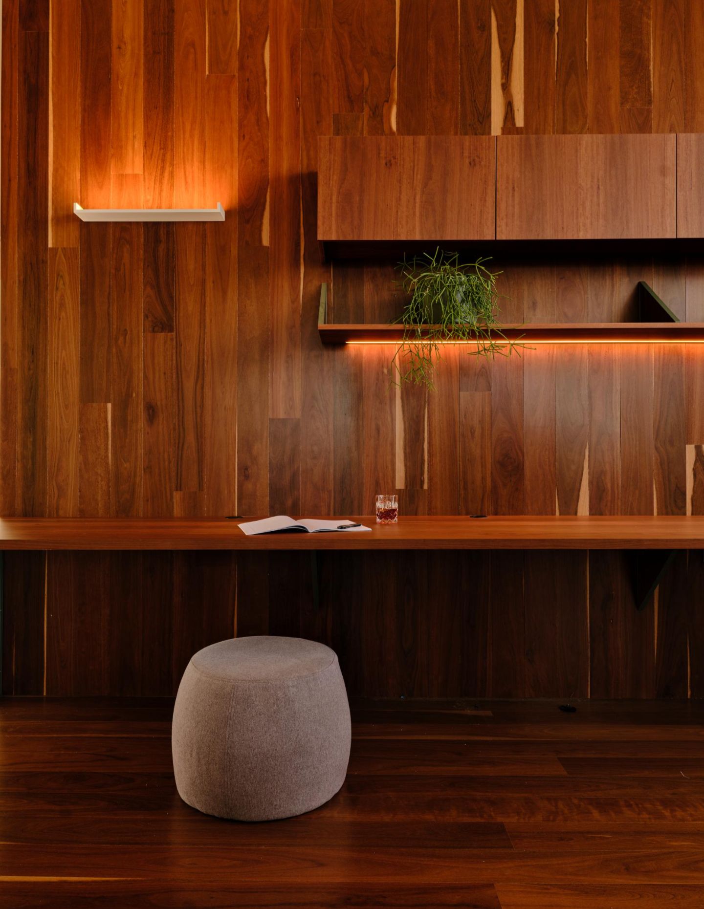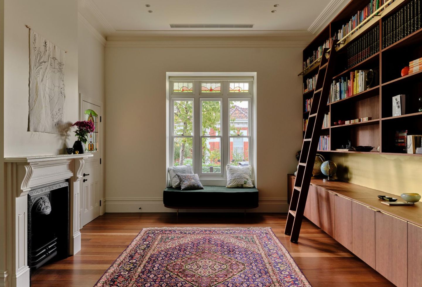 Internally, the design comprises several living spaces that provide places to gather and socialise, whilst one can find solitude in the library, study or on the rooftop terrace. Spaces are configured to capture views of the surrounding context, including fenestration towards Melbourne’s CBD from the rooftop terrace. Interiors integrate natural materials, custom detailing and a curated approach to cabinetry and built-in furniture. There is a conviviality throughout the interiors, with each space or living zone vacillating in tone, character and style.