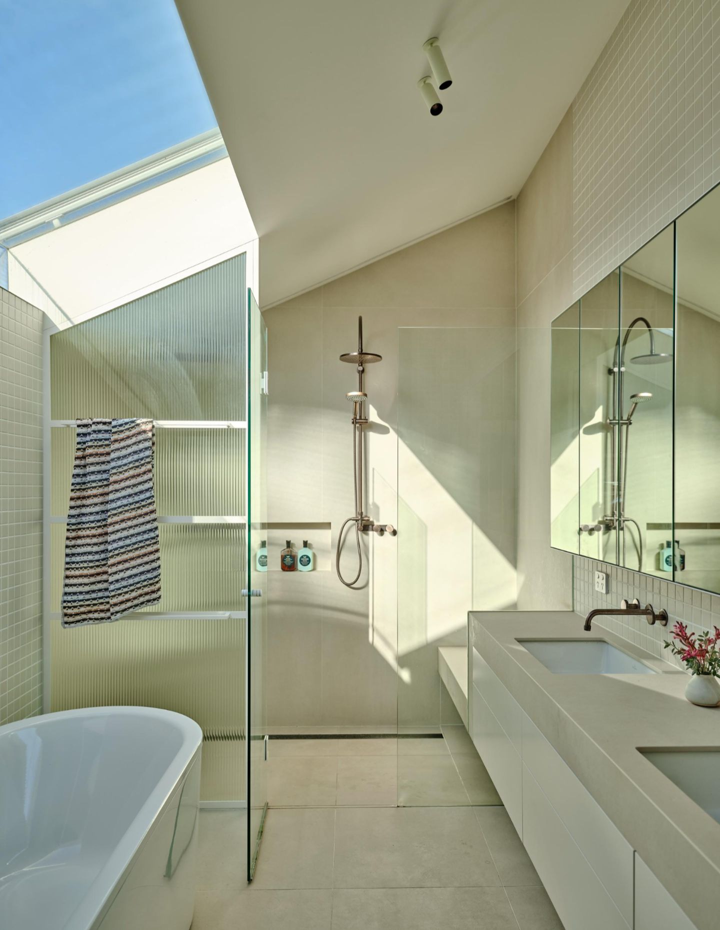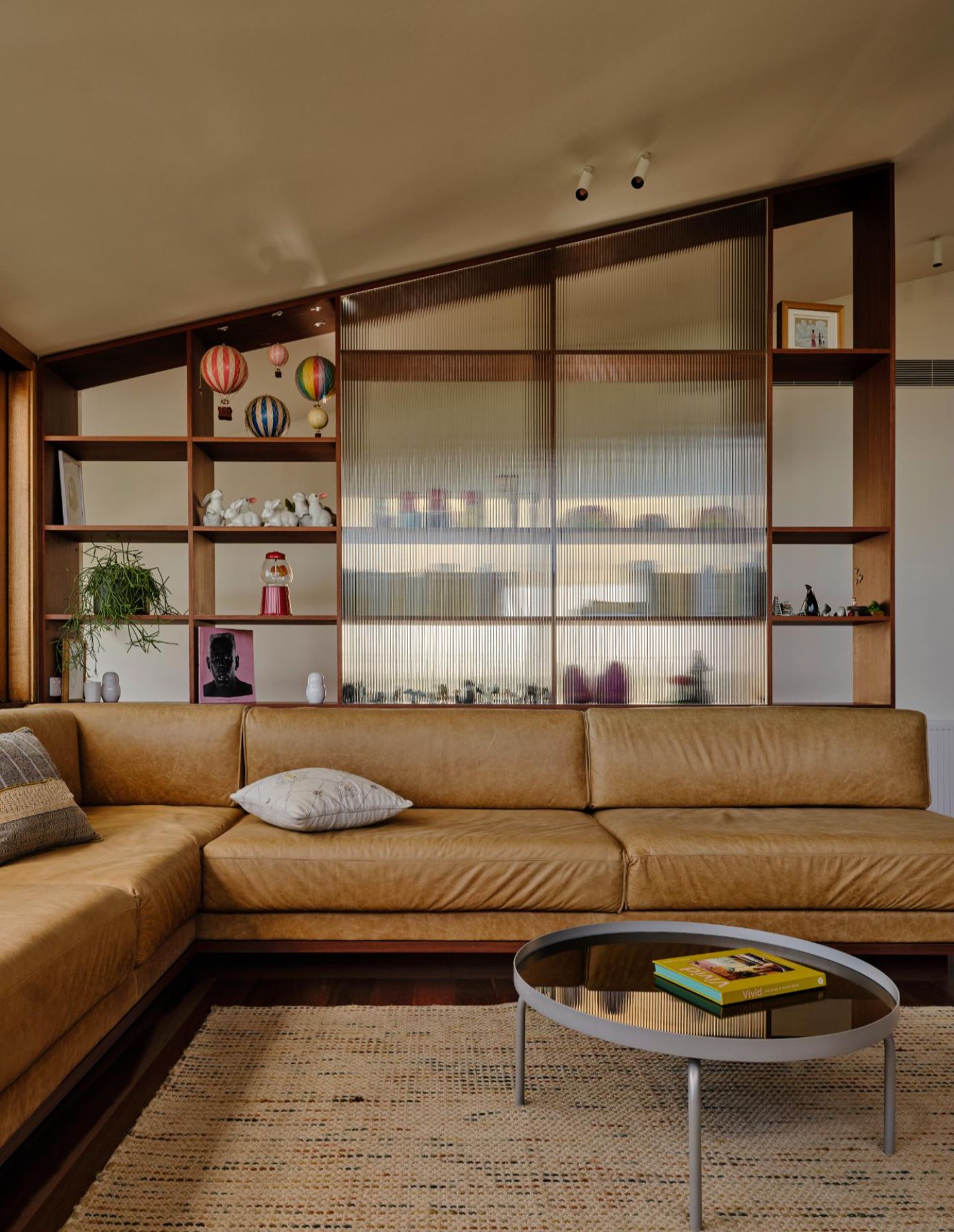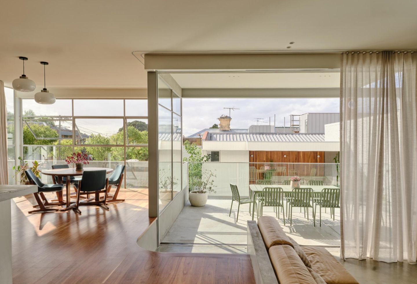 Internally, the design comprises several living spaces that provide places to gather and socialise, whilst one can find solitude in the library, study or on the rooftop terrace. Spaces are configured to capture views of the surrounding context, including fenestration towards Melbourne’s CBD from the rooftop terrace. Interiors integrate natural materials, custom detailing and a curated approach to cabinetry and built-in furniture. There is a conviviality throughout the interiors, with each space or living zone vacillating in tone, character and style.