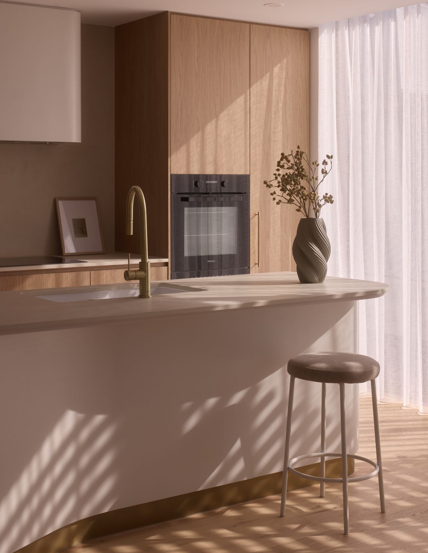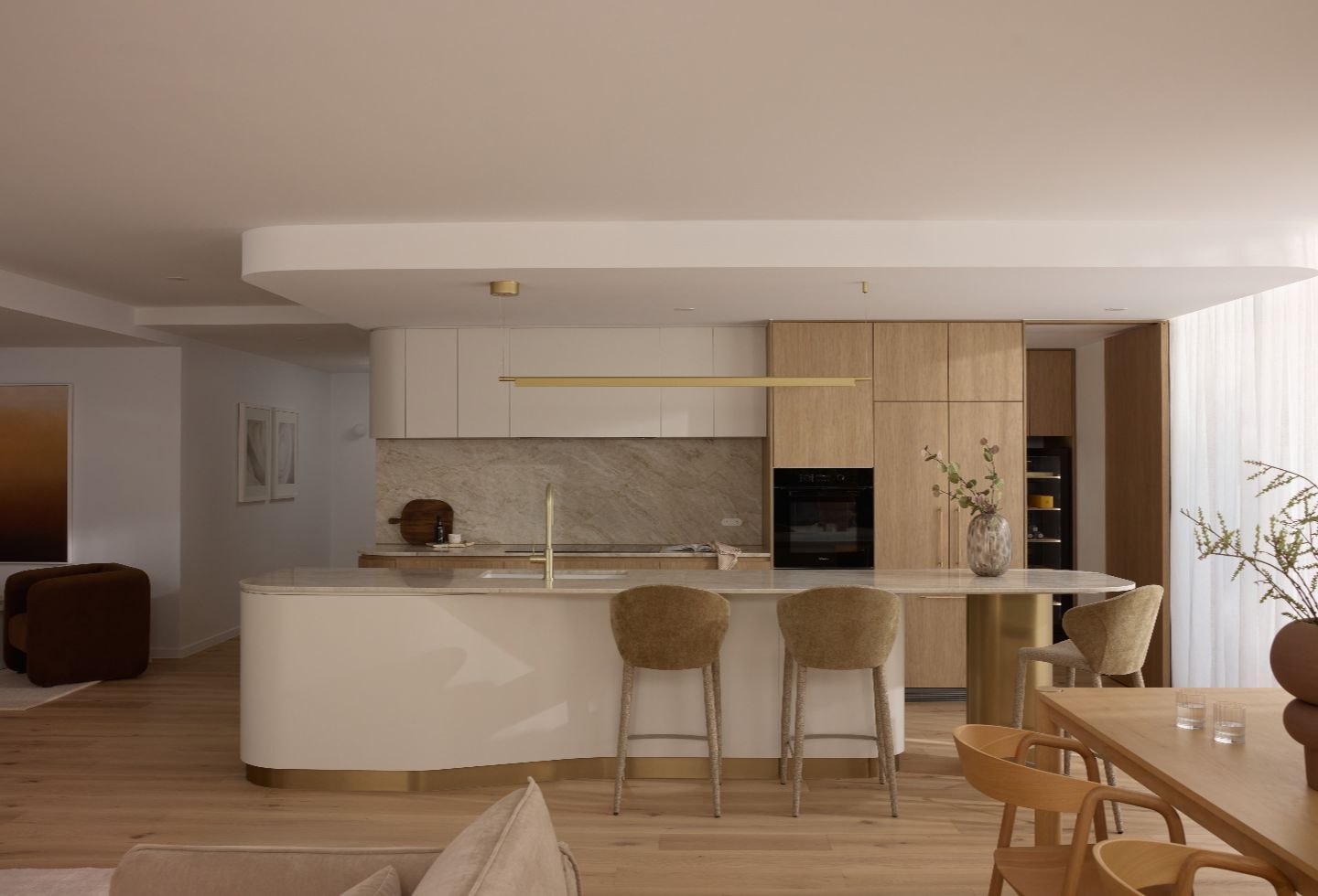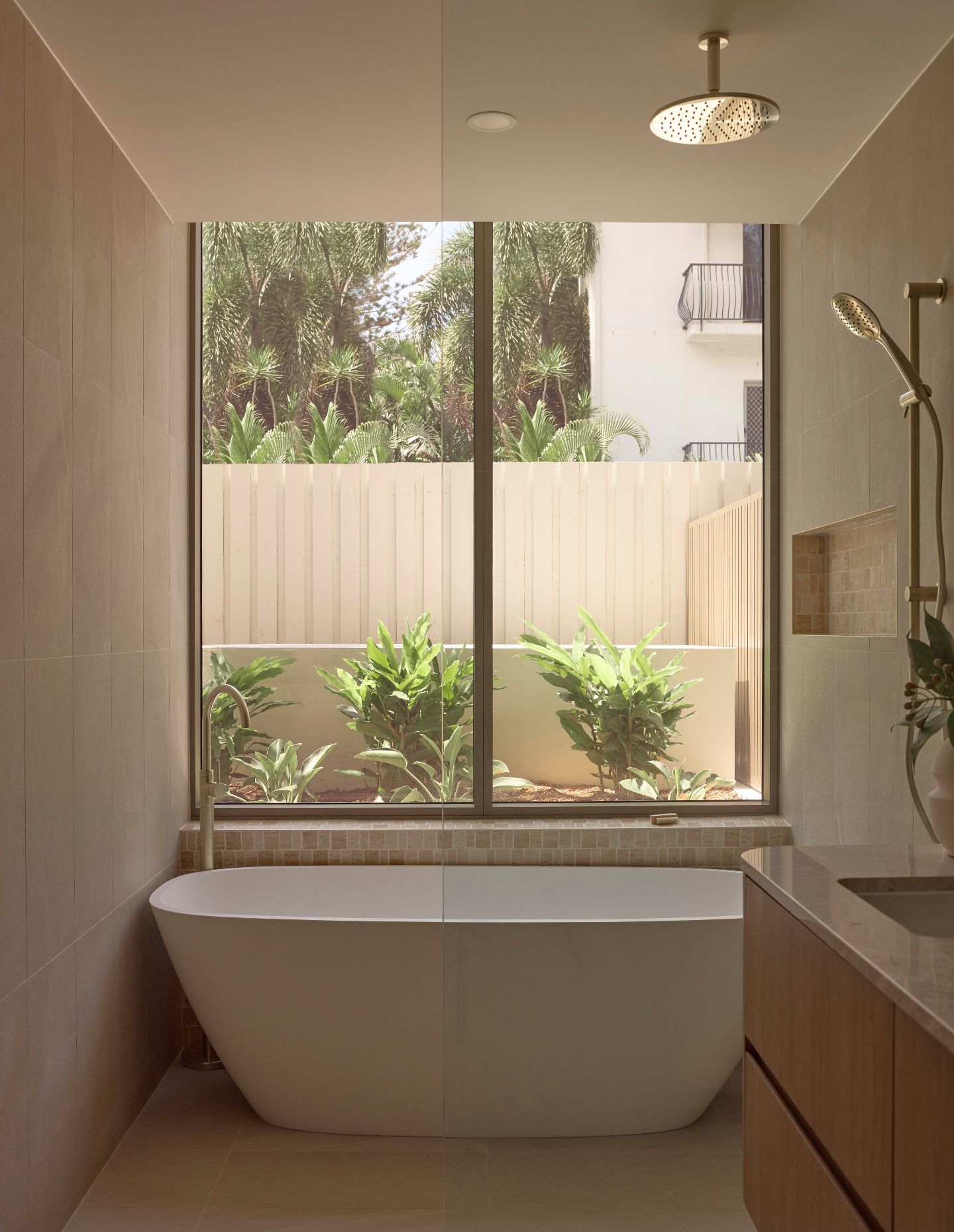 Timber-look aluminium battens move across the facade, creating a rhythm of shadow that changes throughout the day. The palette — rendered masonry and warm bronze aluminium — is deliberately restrained. It’s intended to feel coastal in a grounded way, rather than stylised or imported.