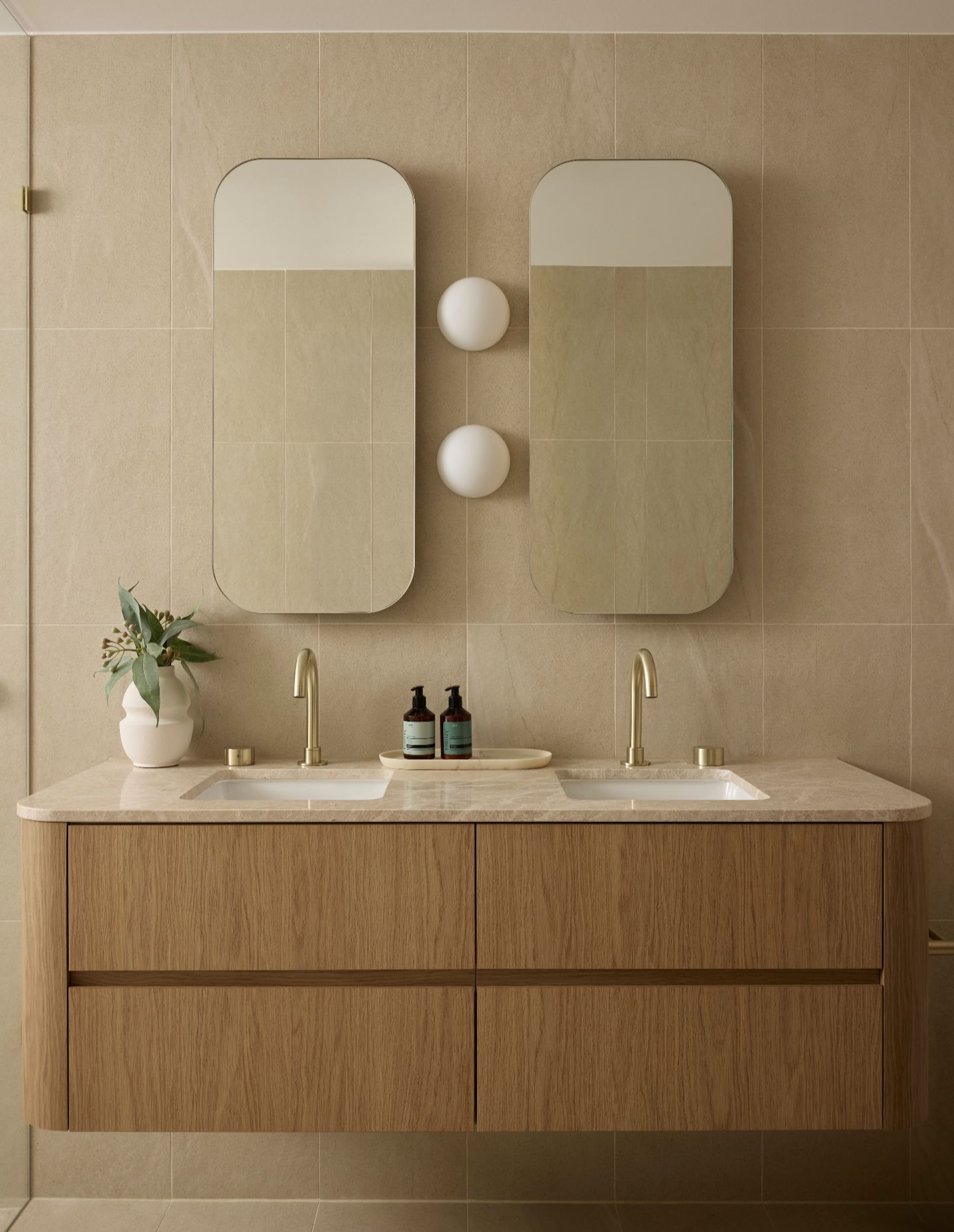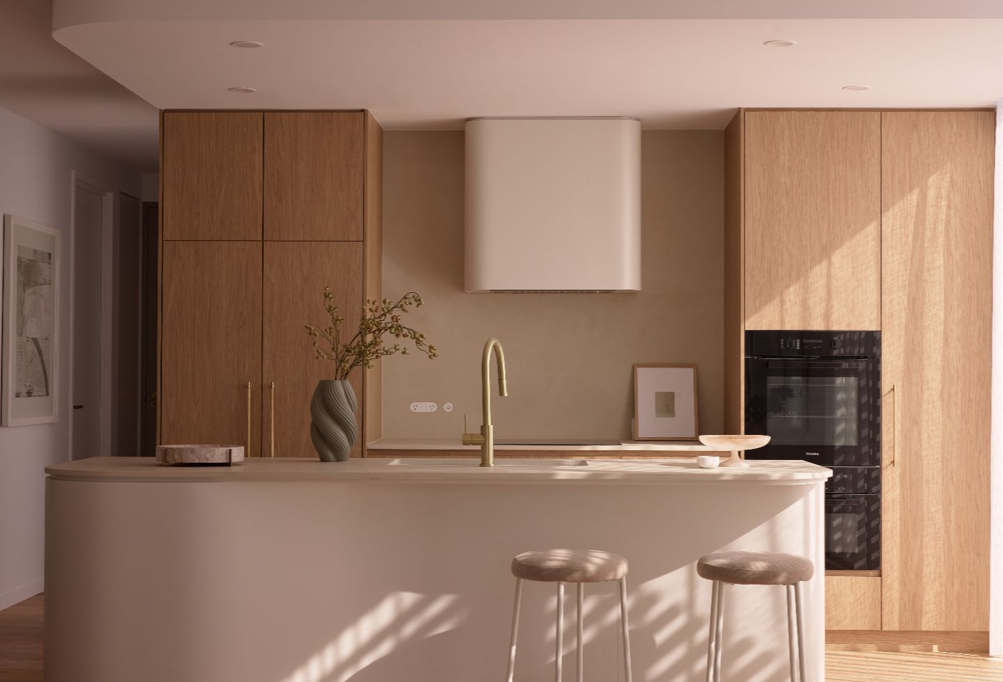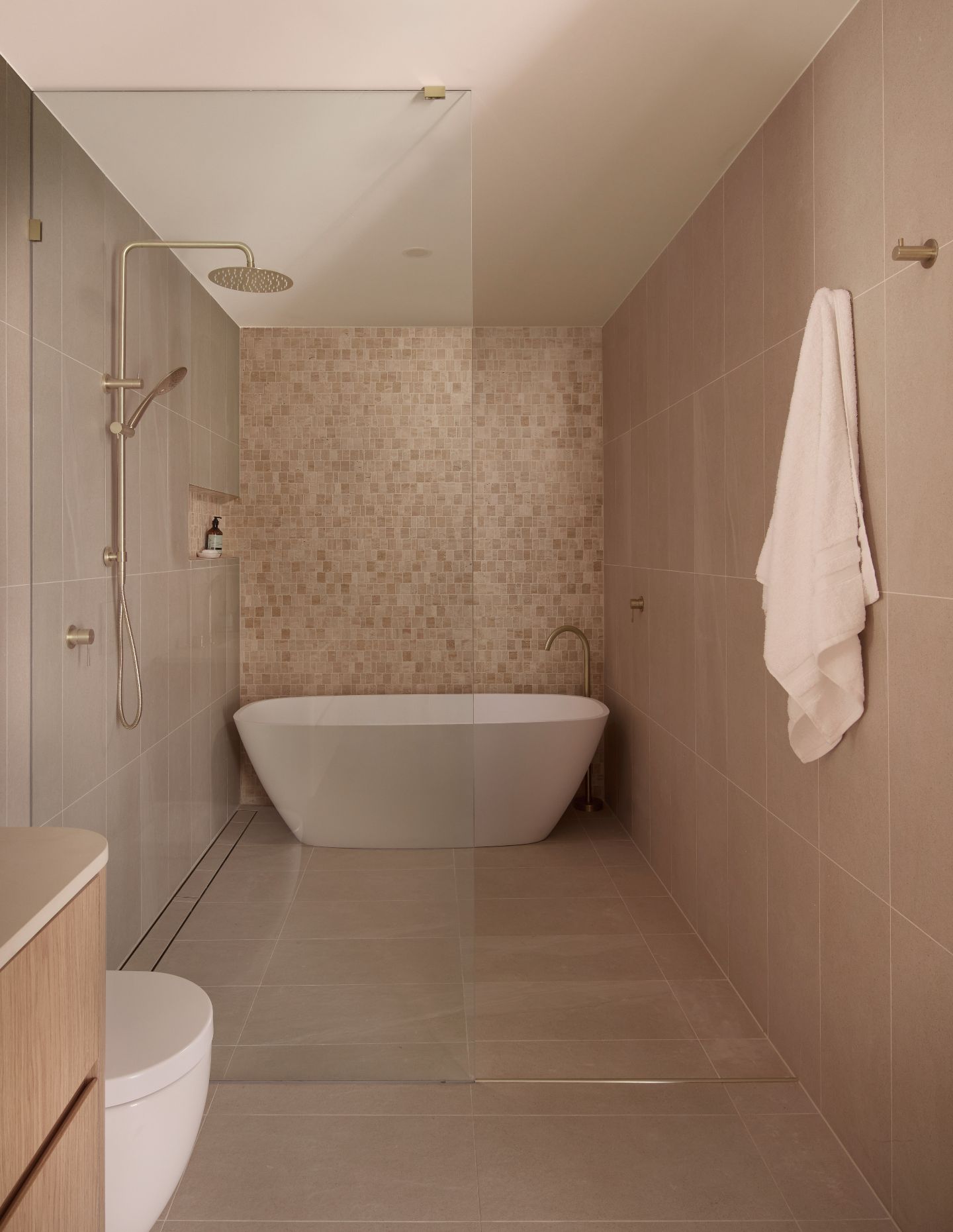Timber-look aluminium battens move across the facade, creating a rhythm of shadow that changes throughout the day. The palette — rendered masonry and warm bronze aluminium — is deliberately restrained. It’s intended to feel coastal in a grounded way, rather than stylised or imported.