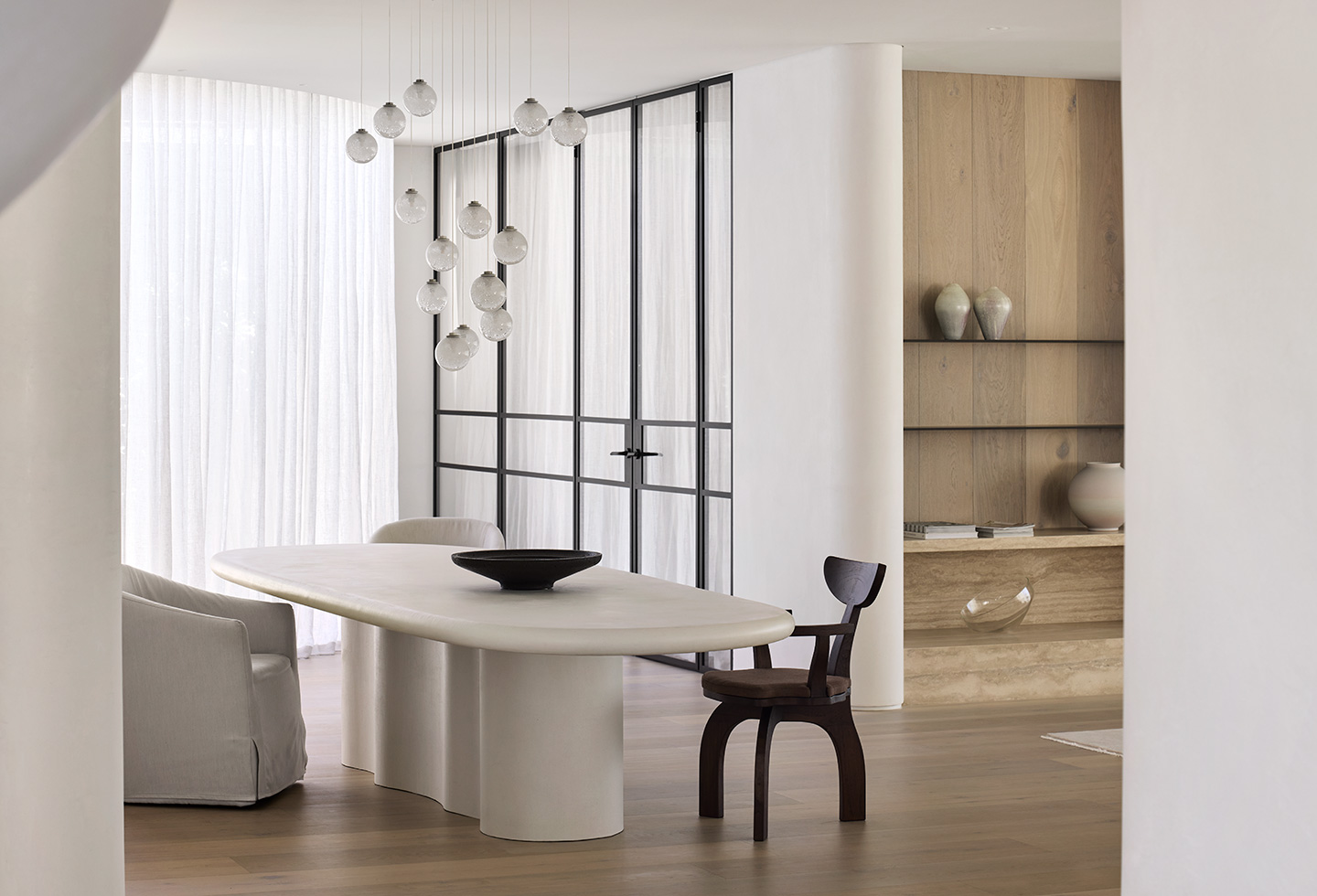 The design was guided by Tess Shanahan and Shaun Wilson’s brief to create a sanctuary that balanced international influences with an Australian coastal setting. Materiality grounded our response, with warm neutrals, custom-stained timber flooring, Venetian plaster, aged bronze and travertine establishing a cohesive tonal palette. Soft curves, barrel archways, domed ceilings, acoustic considerations and water elements, such as a feature skylight installation and ice bath, were introduced as devices to foster calm, movement and reflection — all principles of biophilic design. The result is a residence that supports both the rhythms of daily life and moments of retreat.