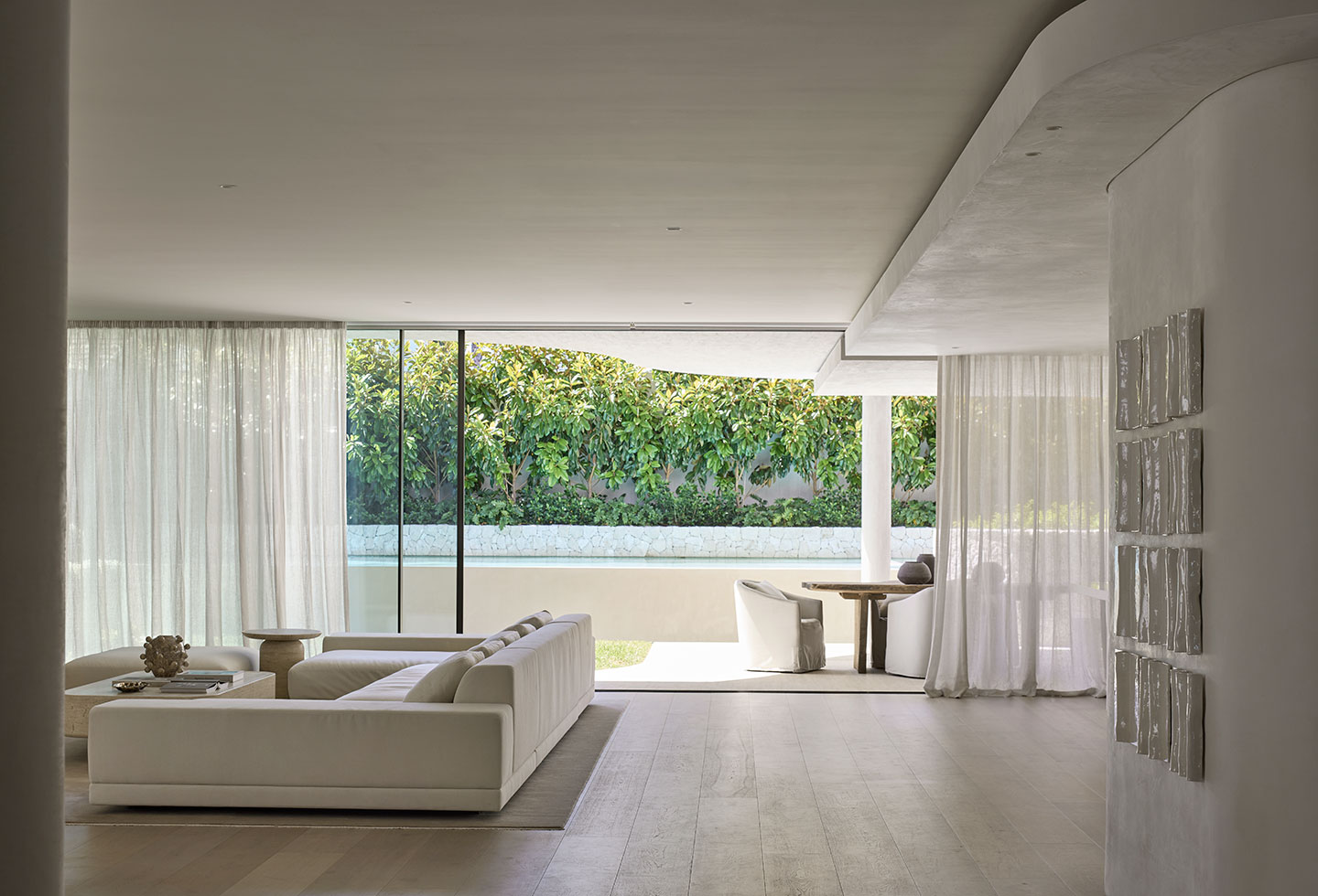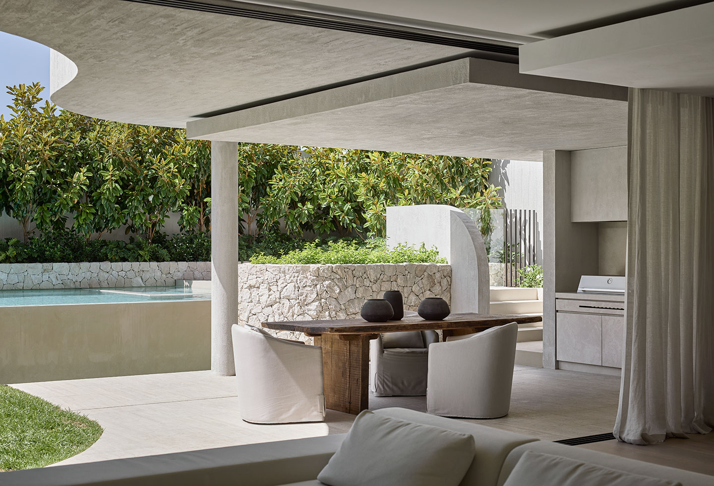 The house was designed for the co-founder of Bondi Sands, Shaun Wilson and his wife, model, presenter and Tess Talks podcast host, Tess Shanahan. The design brief was centred on creating a sanctuary that blurred the lines between indoors and out. Tess and Shaun referenced the Los Angeles Hills, along with the minimalist tones seen in Rosie Huntington-Whiteley’s home and the grandeur of Kim Kardashian’s residence.