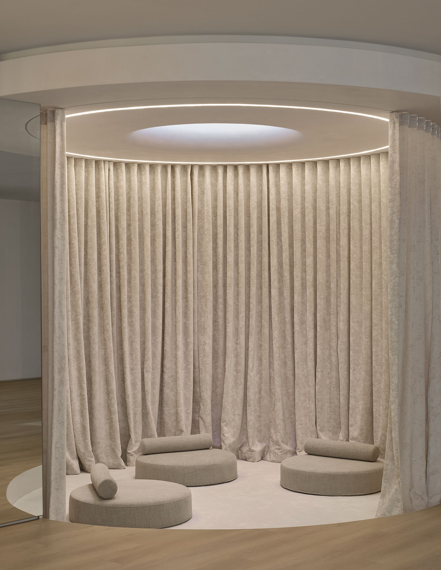The underground wellness centre is a key part of the home’s design and the clients’ lifestyle. It is substantial in size and includes a gym, meditation dome, sauna, steam shower and ice bath. Biophilic design principles — such as the skylight above the meditation dome and the lower garden courtyard — bring natural light and a sense of connection to nature. The space transforms what would typically be a dark basement into a restorative environment, supporting daily practice and wellbeing.