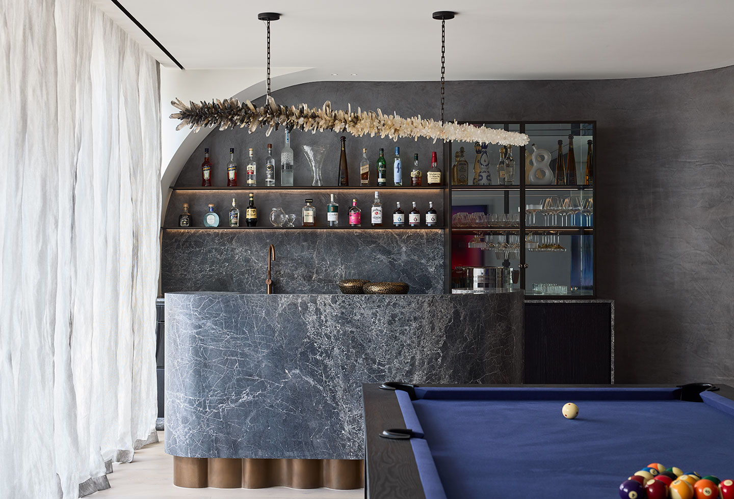 Design Manager Isabella Cini curated pieces that enhance both texture and function. In the front lounge, the Saint Honoré sofa by Pierre Augustin Rose, Gubi Pacha chairs, Fleur Studios Wabi tables and a vintage Tronchi chandelier were selected to create a layered, gallery-like space. Lighting was treated as sculptural art, with crystal fixtures by Christopher Boots, tubular chandeliers from Castorina and E-Moderno and selected pendants by Kelly Wearstler. Custom cabinetry, joinery and rugs complement the material palette, while the aged brass cocktail bar anchors the living zones with a subtle presence.