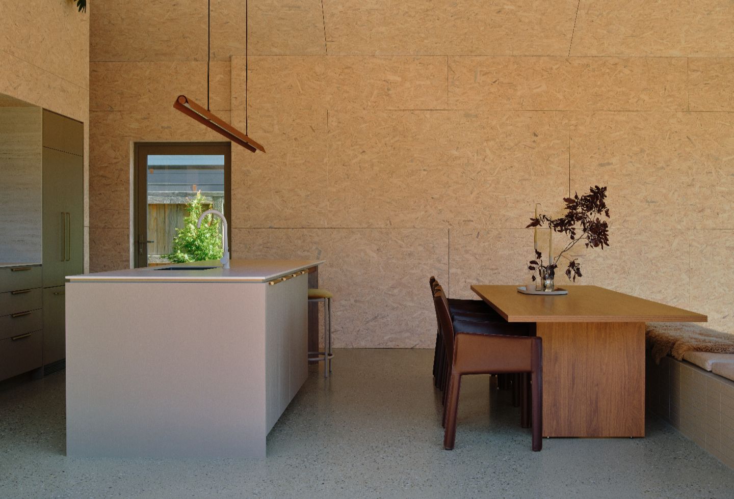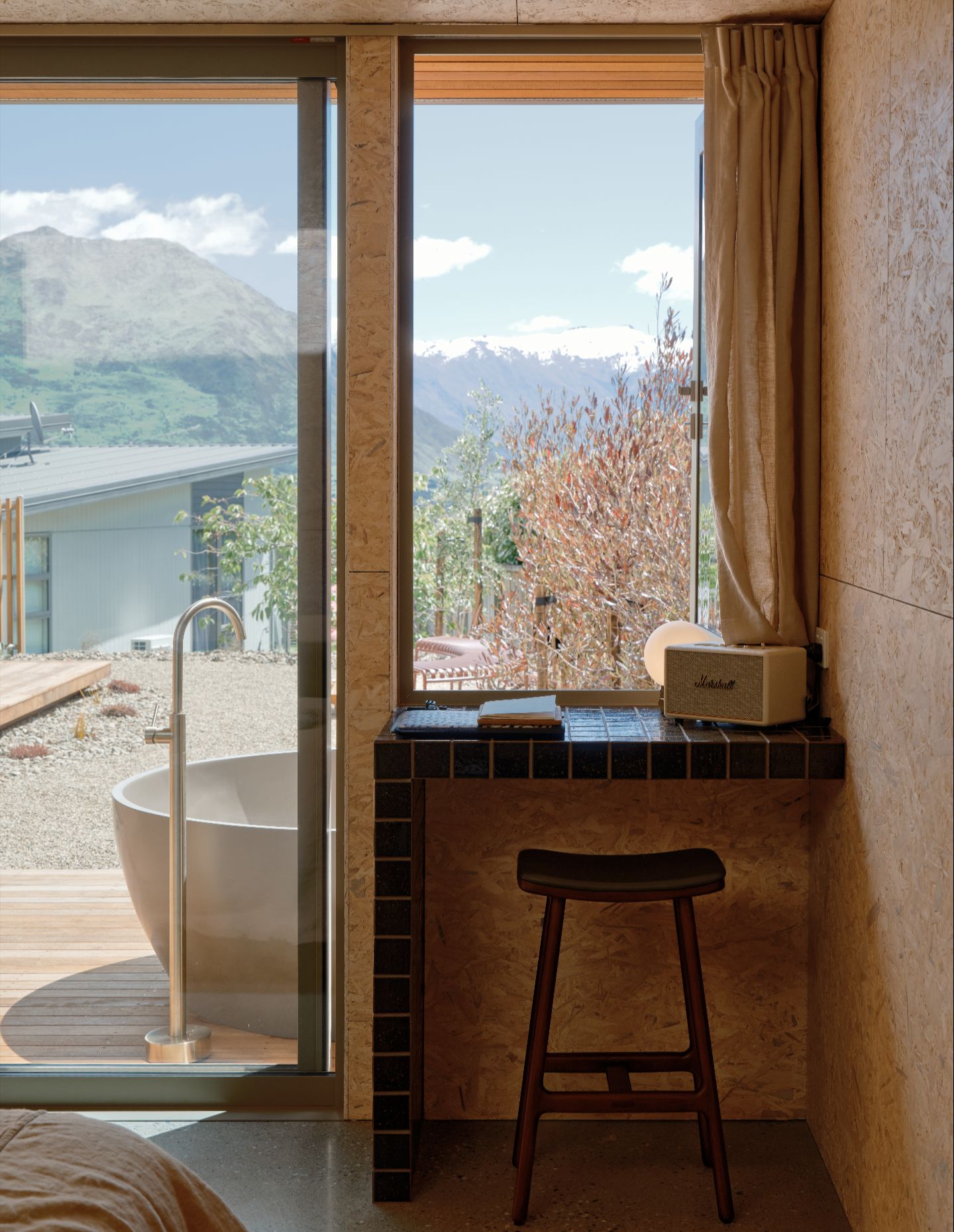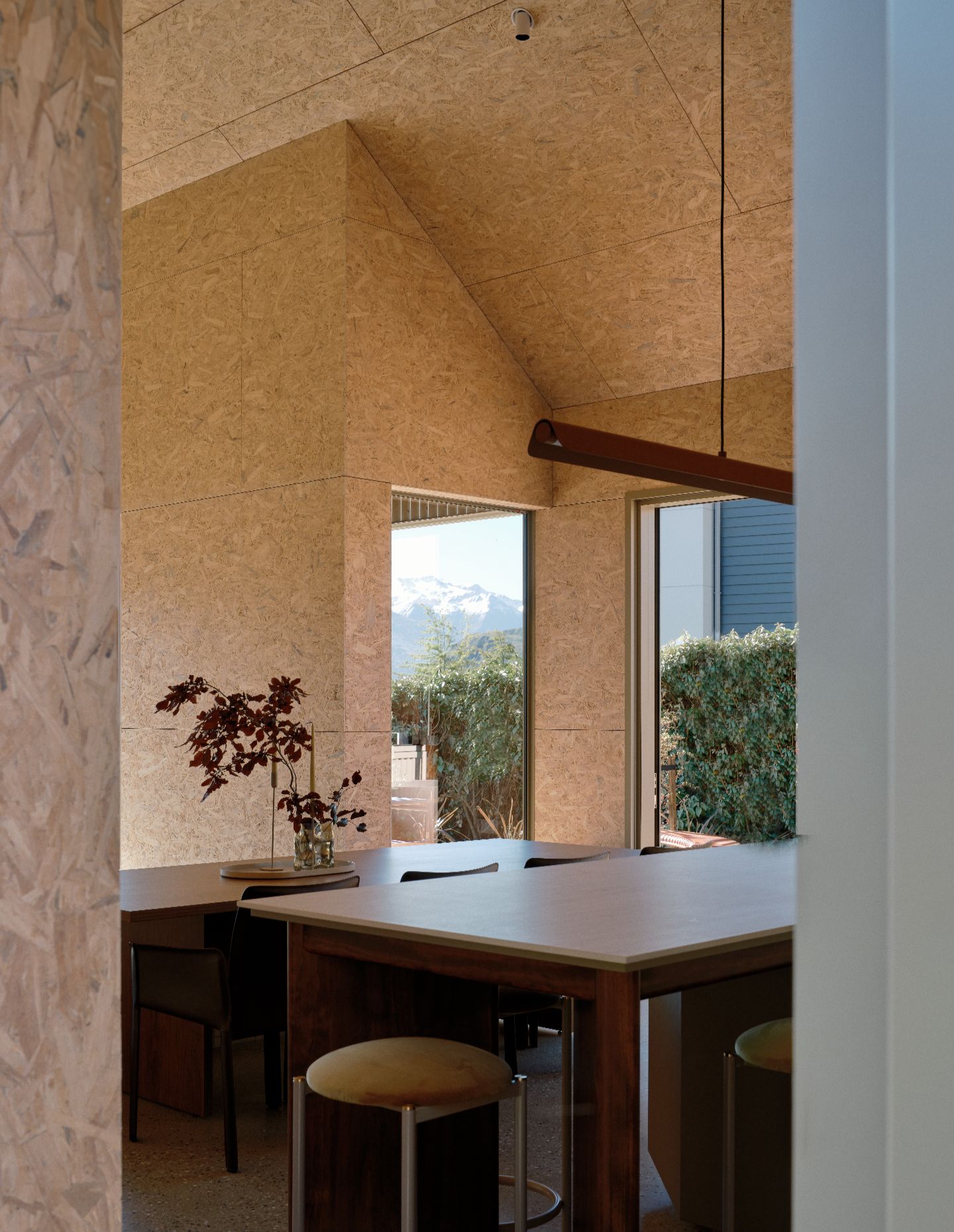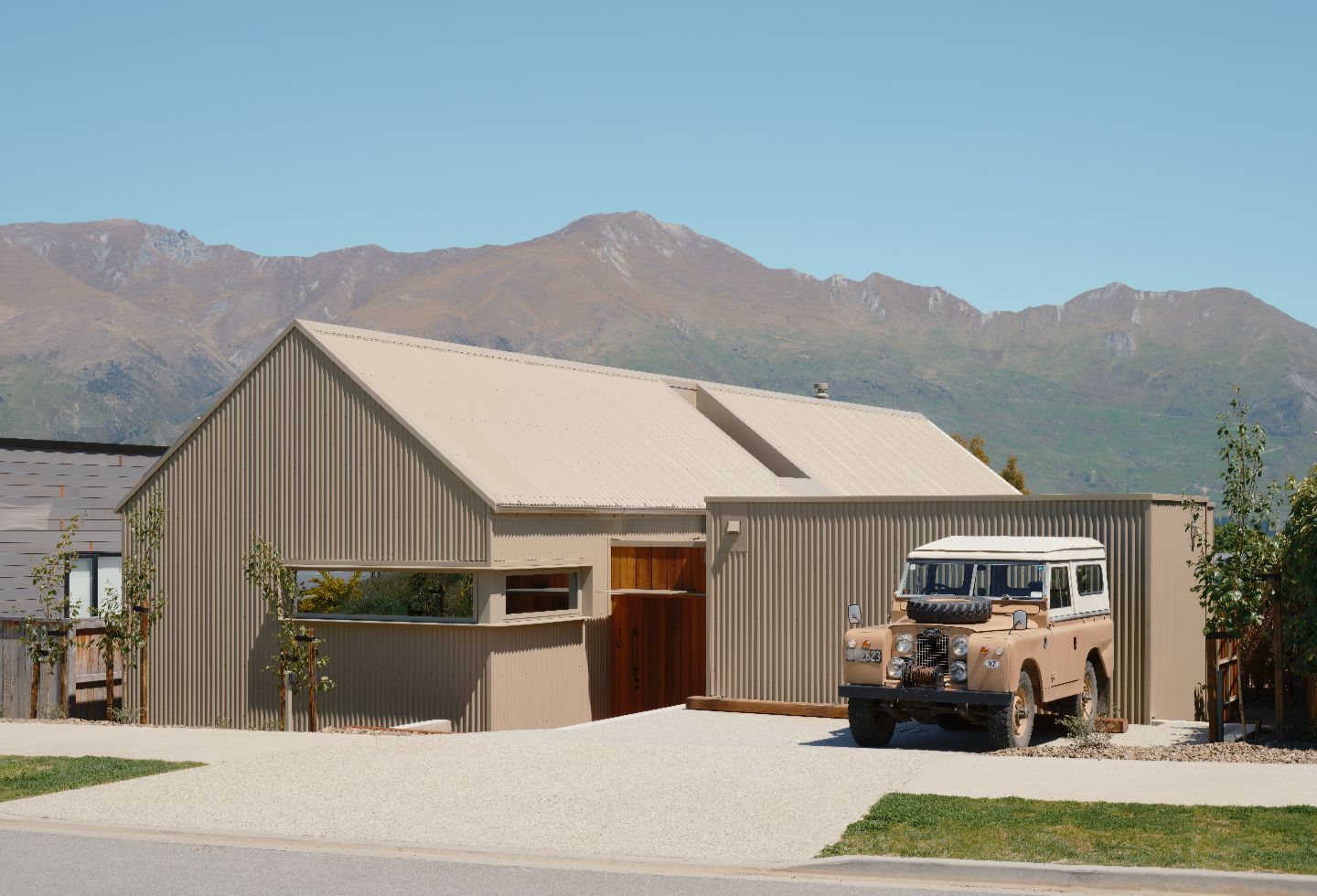 The design draws inspiration from the rich hues of Central Otago, with a palette of earthy browns, iron reds, and mushroom greys that shift with the changing light. Inside, the home balances bold materiality with thoughtful craftsmanship – polished concrete, walnut toned joinery, and handmade tiles create a tactile, immersive experience.