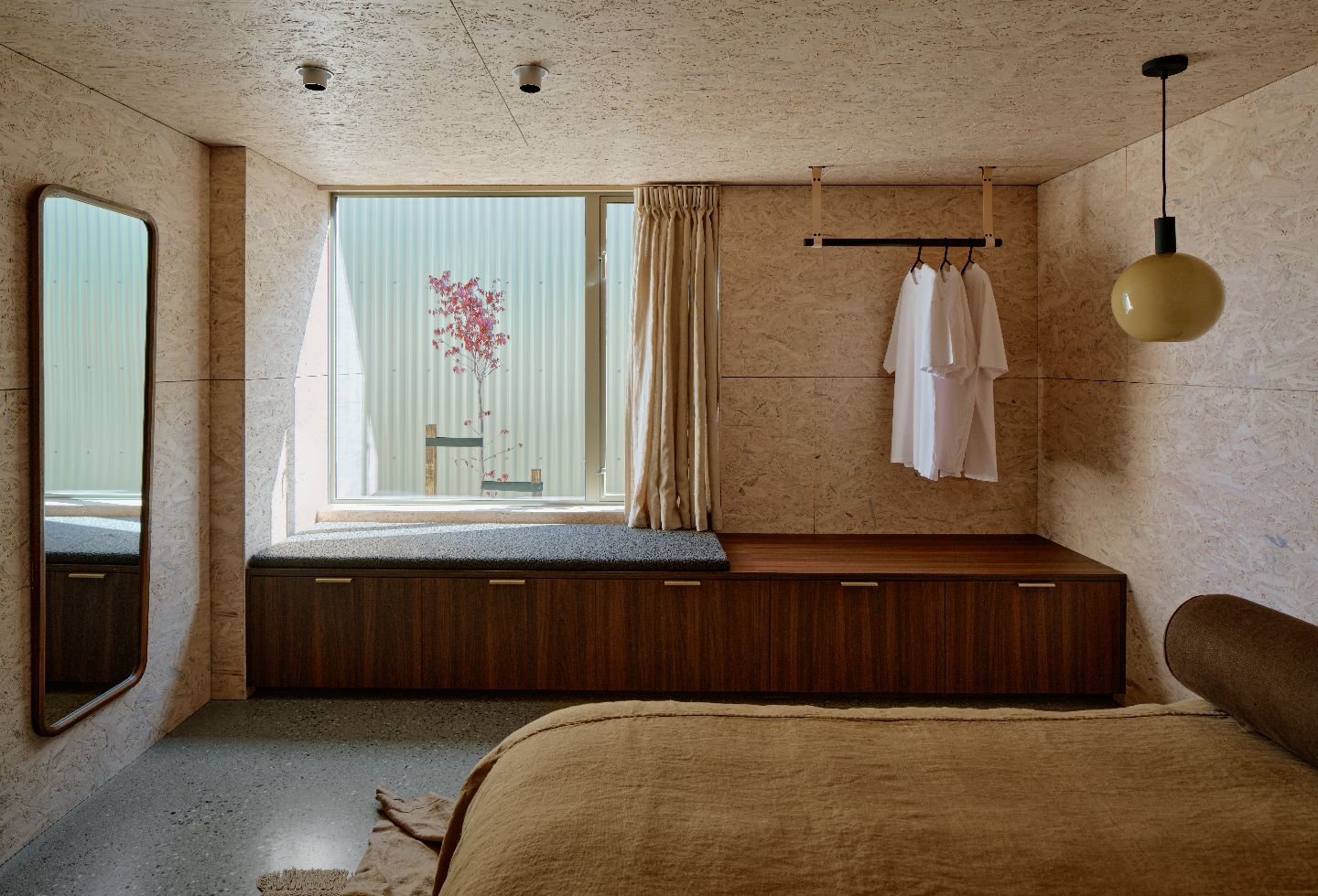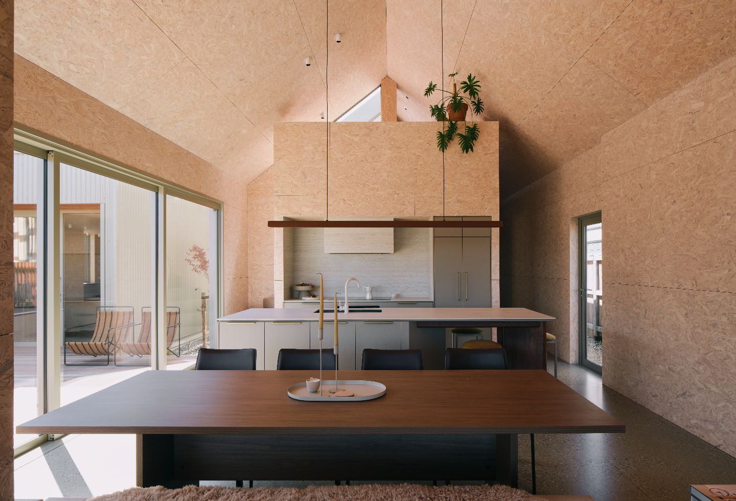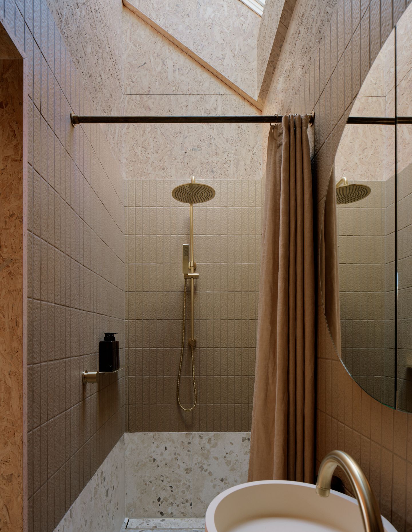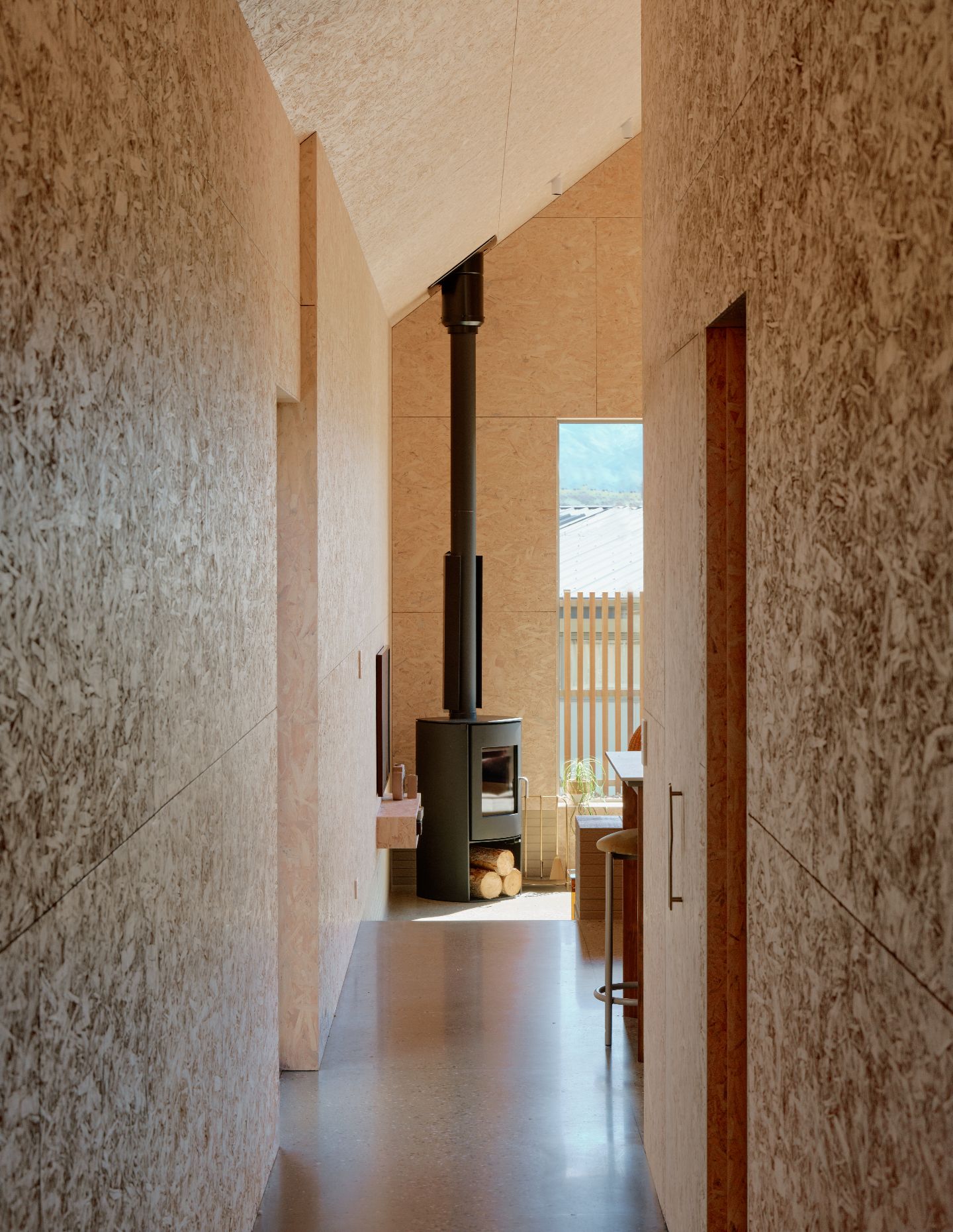 The design draws inspiration from the rich hues of Central Otago, with a palette of earthy browns, iron reds, and mushroom greys that shift with the changing light. Inside, the home balances bold materiality with thoughtful craftsmanship – polished concrete, walnut toned joinery, and handmade tiles create a tactile, immersive experience.