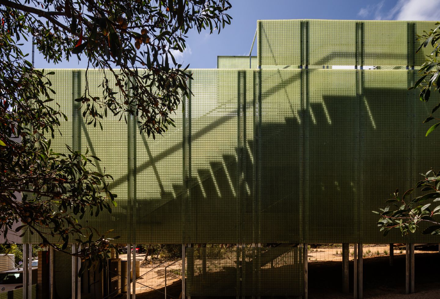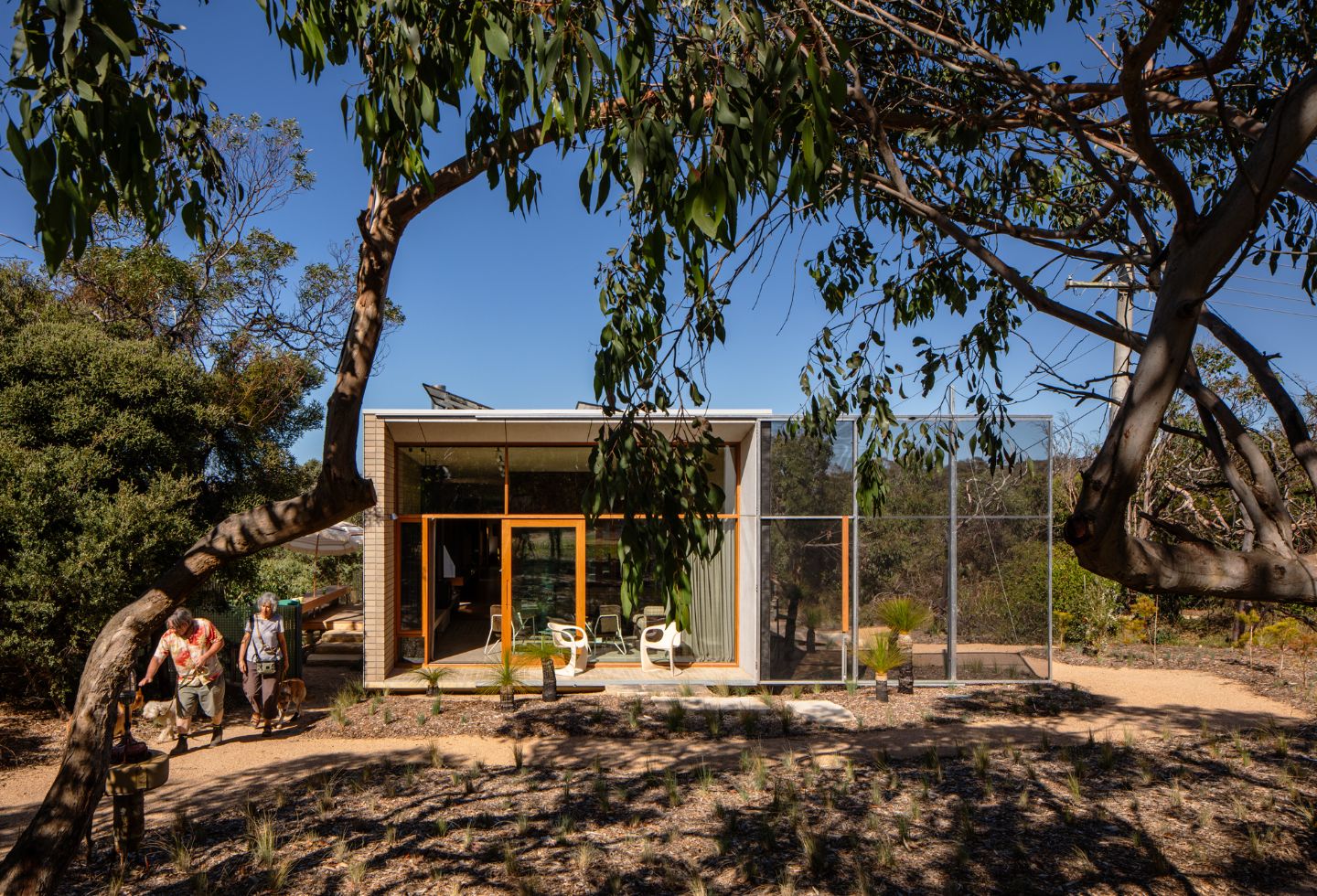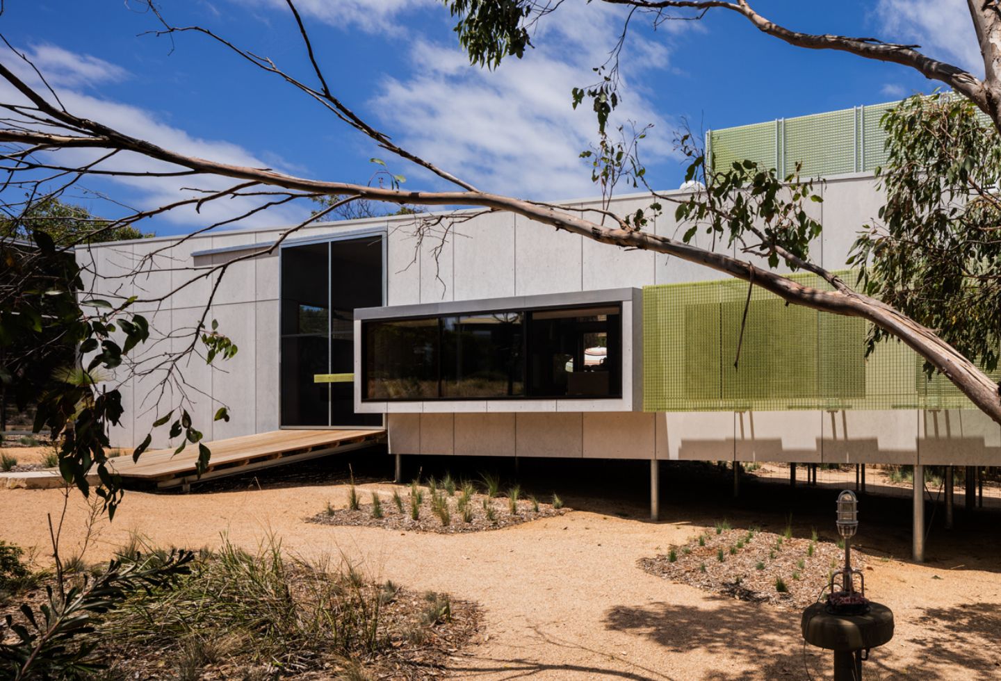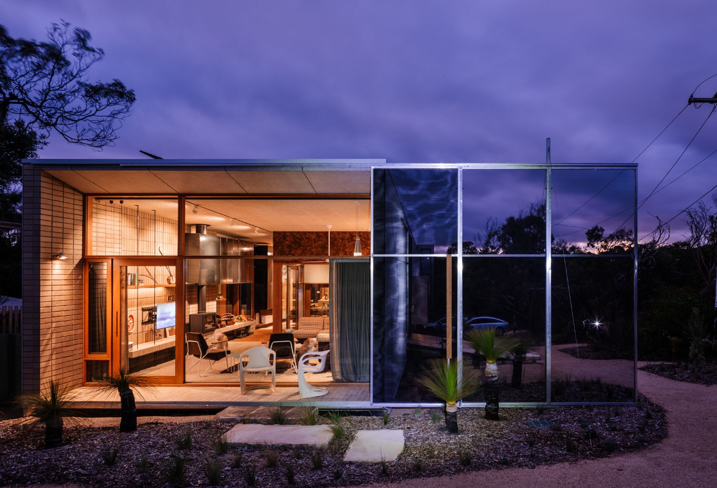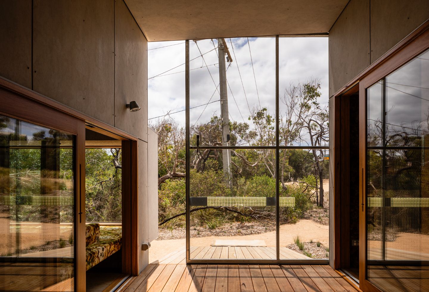 Embedded in the landscape and devoid of high fences, the Aireys Inlet house incorporates Fibre Reinforced Plastic (FRP) panels to screen areas requiring privacy, such as bathrooms and bedrooms. Operable flywire screens enclose areas such as the welcoming verandah and living area.