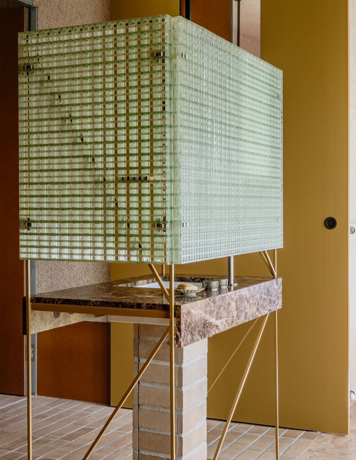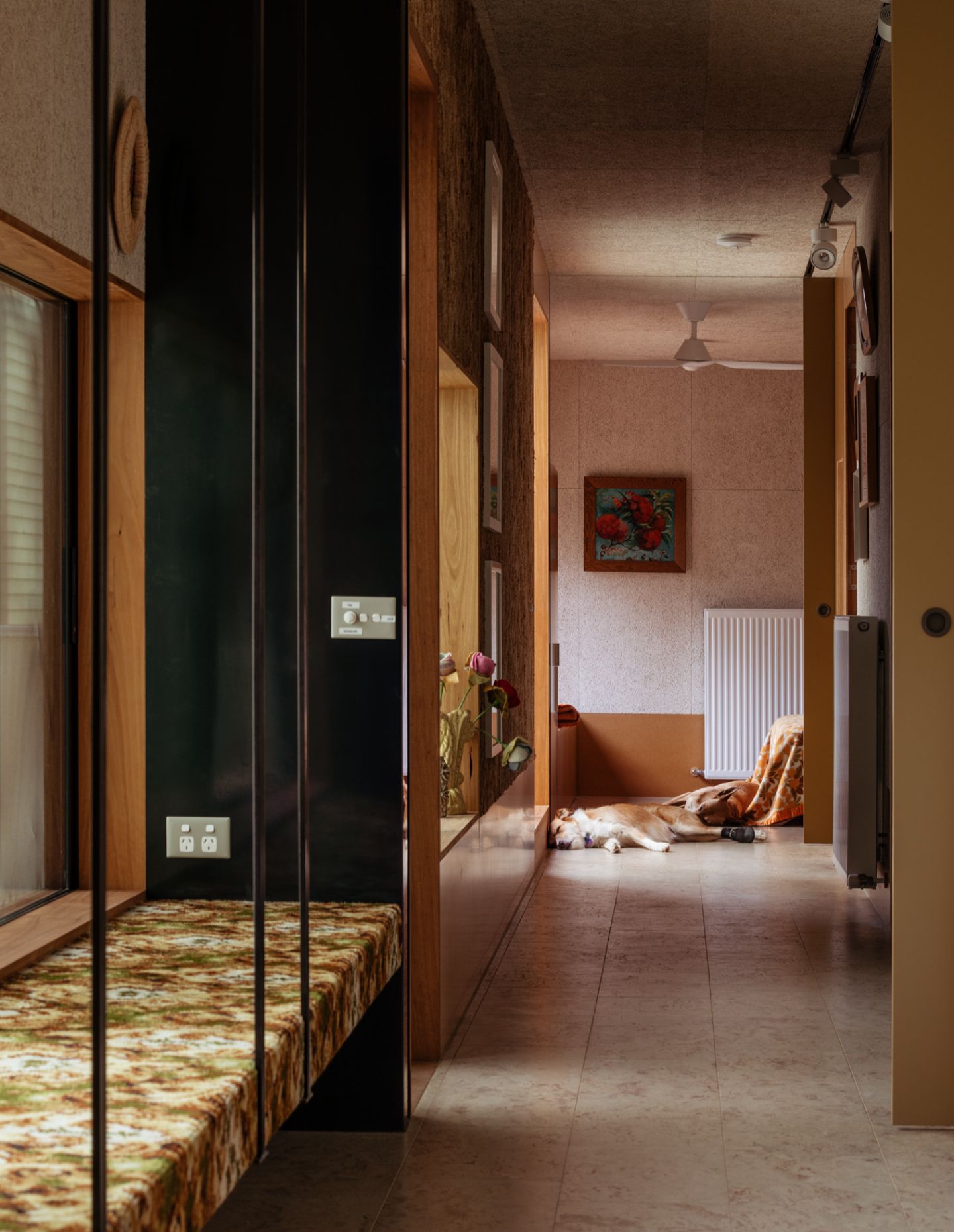 While the carpet meets the client’s brief for texture, the FRP screens juxtapose the home’s cement walls, adding depth and luminosity. Shells, collected by the owner over many years, have been thoughtfully interwoven throughout.