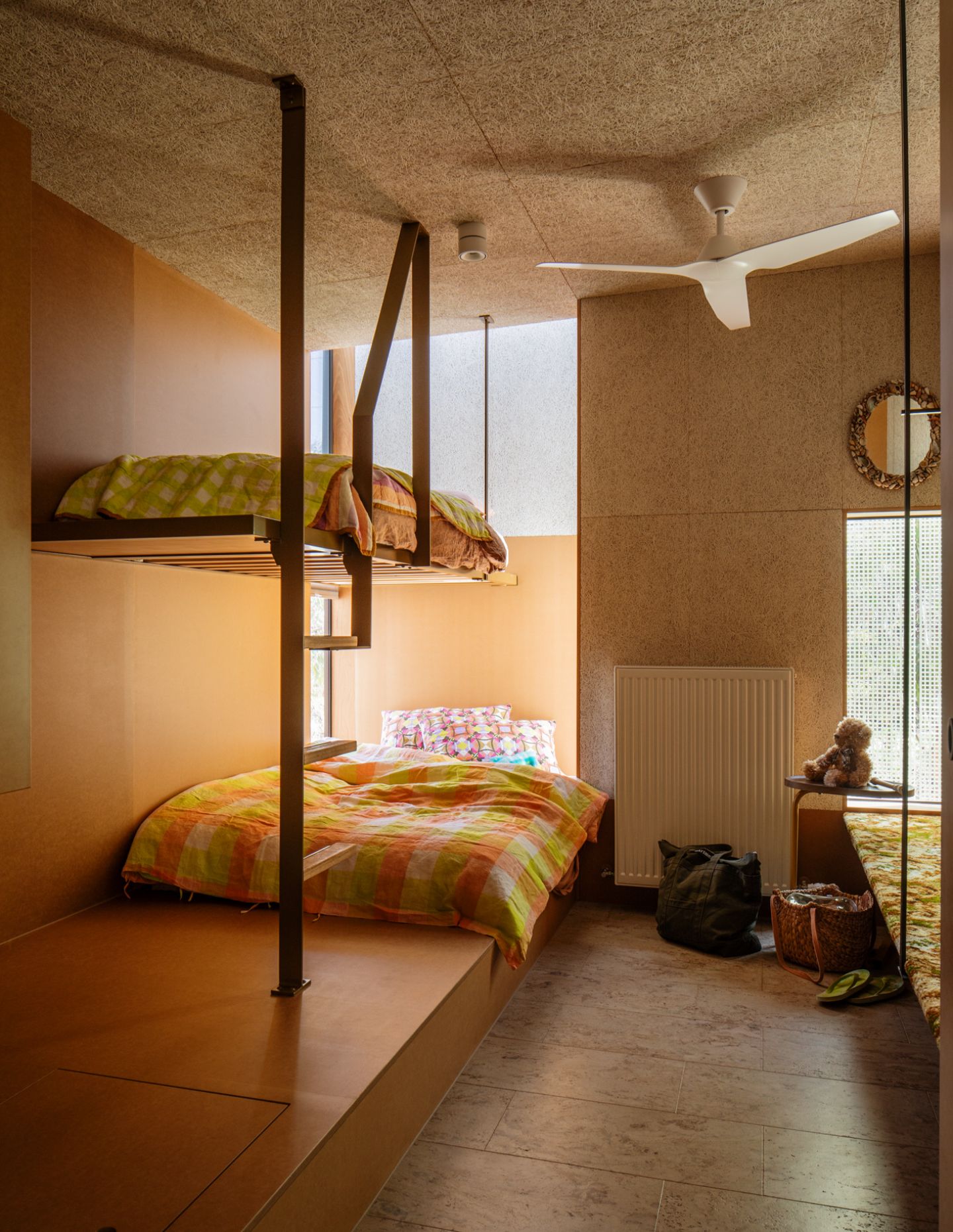 The designers were mindful of the surrounding environment and bring it into the home via a periscope-style aperture. Cutting into a wall from the main passage, the opening uses mirrors to reflect both the sky and the landscape. An extruded window above the top bed in the bunk room allows a child to stand up and see the ocean before heading off to sleep.