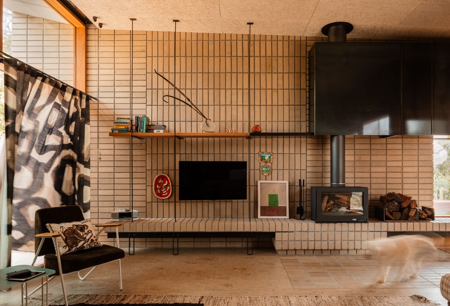 Keen to respect a neighbouring ’70s brick house, the mix of materials includes an inverted curved arched brick wall that separates the carport from the home. Also used in the interior, these beige-coloured bricks appear as feature walls, a hearth for the fireplace, and as the island bench in the kitchen – complete with a brick splashback. As with many surviving holiday shacks, shag and deep piled carpets form part of the material palette, used on walls and a custom bench seat that separates the kitchen from the front porch.
