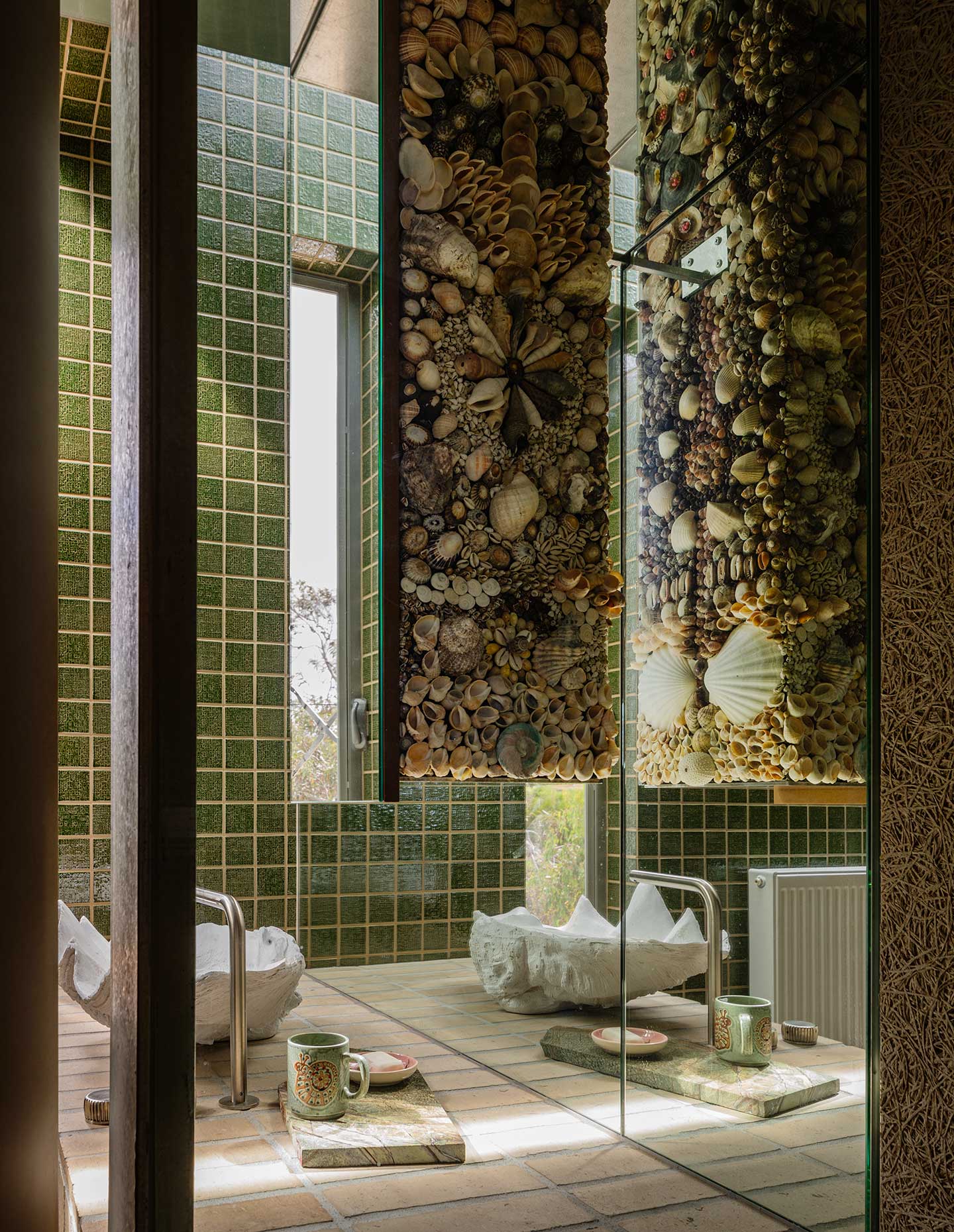 It’s in the ensuite of the main bedroom that shell art is fully celebrated. Rather than the usual vanity, this iteration was conceived as a work of art. “Gaby was looking for something that evoked the creek at the end of the property,” says O’Sullivan, who combined shells with mirrors to allow the installation to be viewed through a glass panel in the main bedroom.