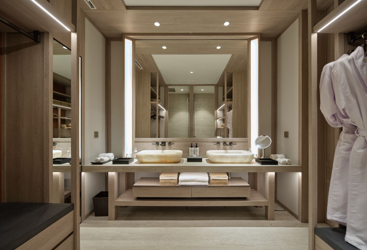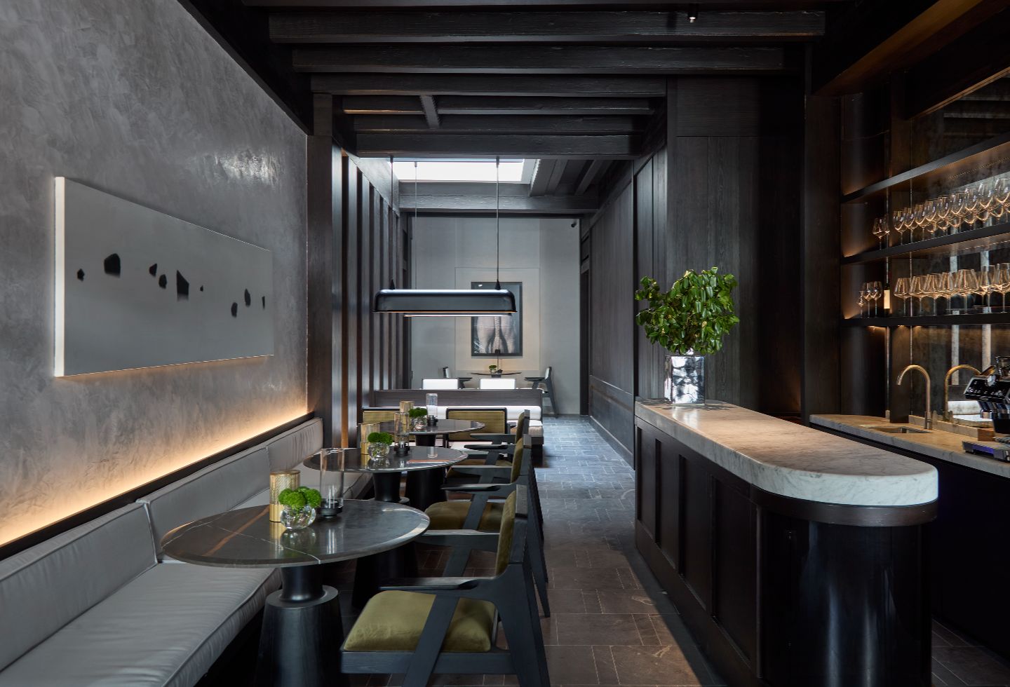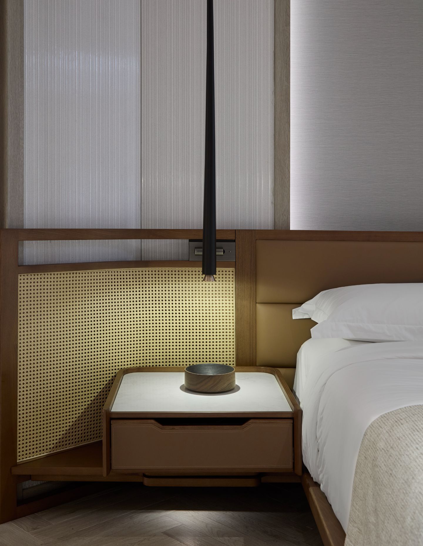 The common areas’ dark timber walls alternate with white ones. Extruded, ribbed and glazed ceramic panels feature a crackling effect like ceramic bowls and surfaces of lime wash deployed in a Venetian plaster technique. In the suites, Chan switched the dark timber with light solid oak joinery as they make for a better canvas for light and shadows. The ceramic panels reappear behind the bedroom’s headboard. Alabaster reappears in the suites too, in standing lamps and washbasins. Timber screens mark spatial and programmatic transitions through the long plan and rattan add to the contextual aesthetic.
