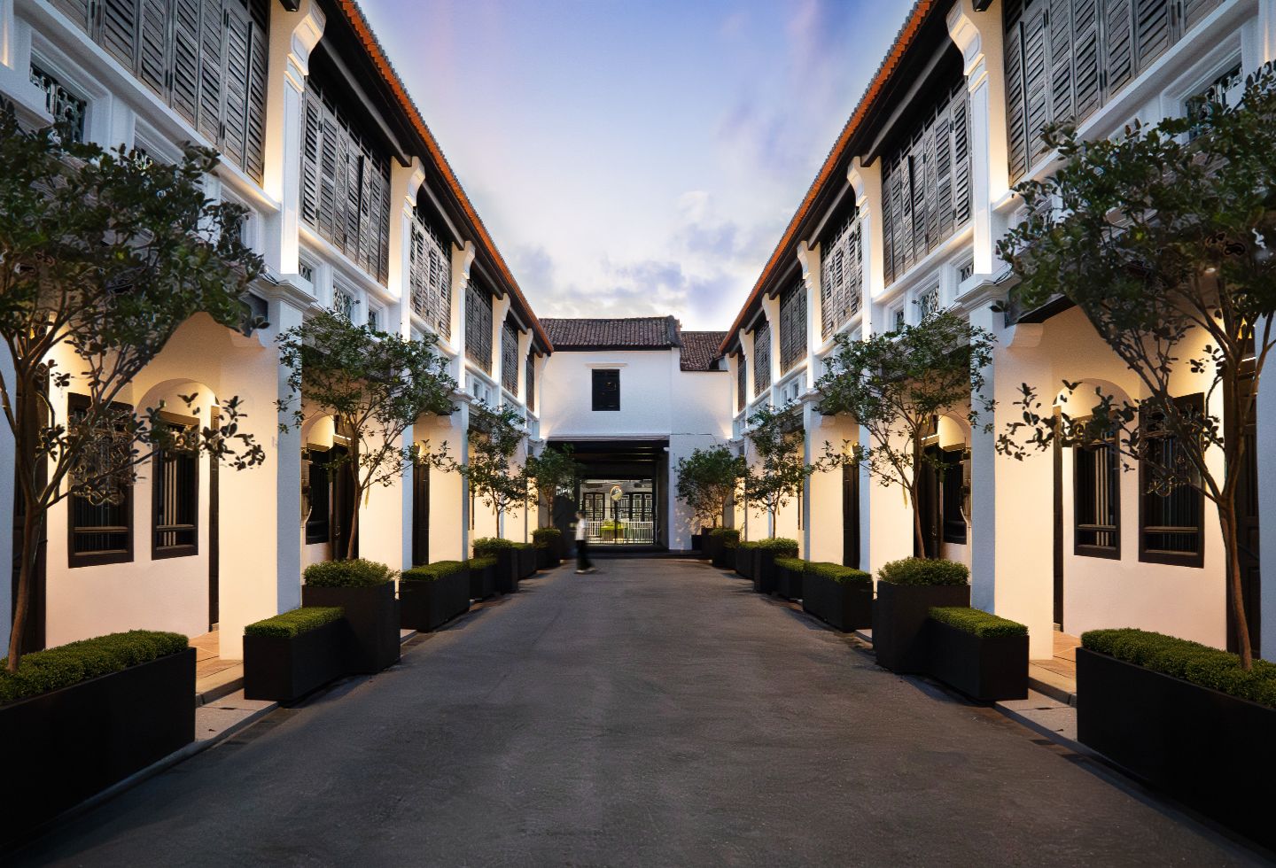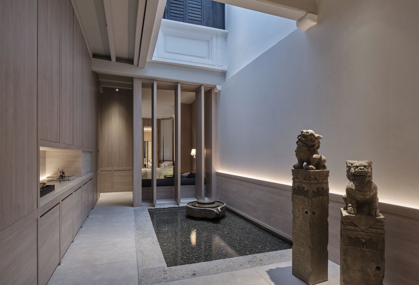 The hotel’s suite doors flank Cannon Square that leads to the Khoo Kongsi courtyard. Embellished by manicured plants and stone lions mimicking larger versions outside the temple, it is public during the day. Unlike Penang’s many other shophouses, Soori Penang maintains a streamlined black-and-white front. Chan’s memories of shophouse living inspired this, as well as the interior palette. Light from the air well and windows at the short façade of the long plan provided dramatic light, as the front door was always closed for privacy from the street, he recounts.