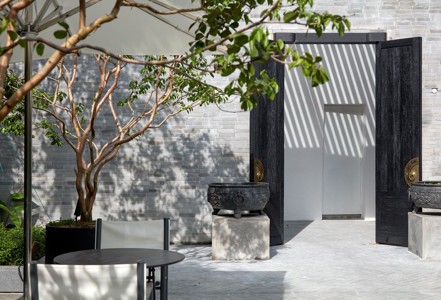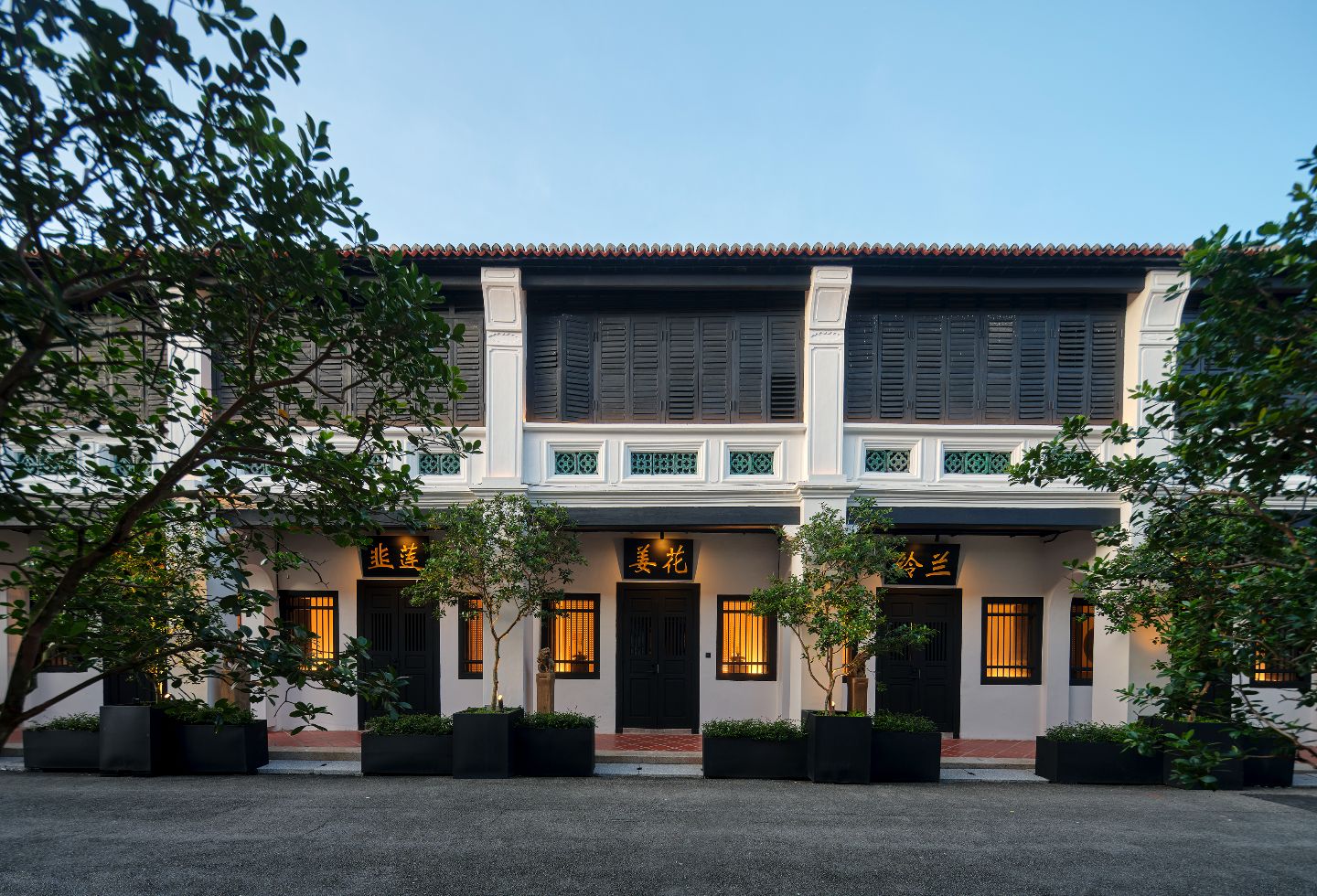 Guests arrive into these spaces through a nuanced journey. Chan turned a small carpark into a private garden, sandwiched by white walls facing the bustling Lebuh Acheh and tall, grey, Chinese brick walls. These frame landscaping of bamboo and ornate plants, as well as a pool with lotus plants and lilies.