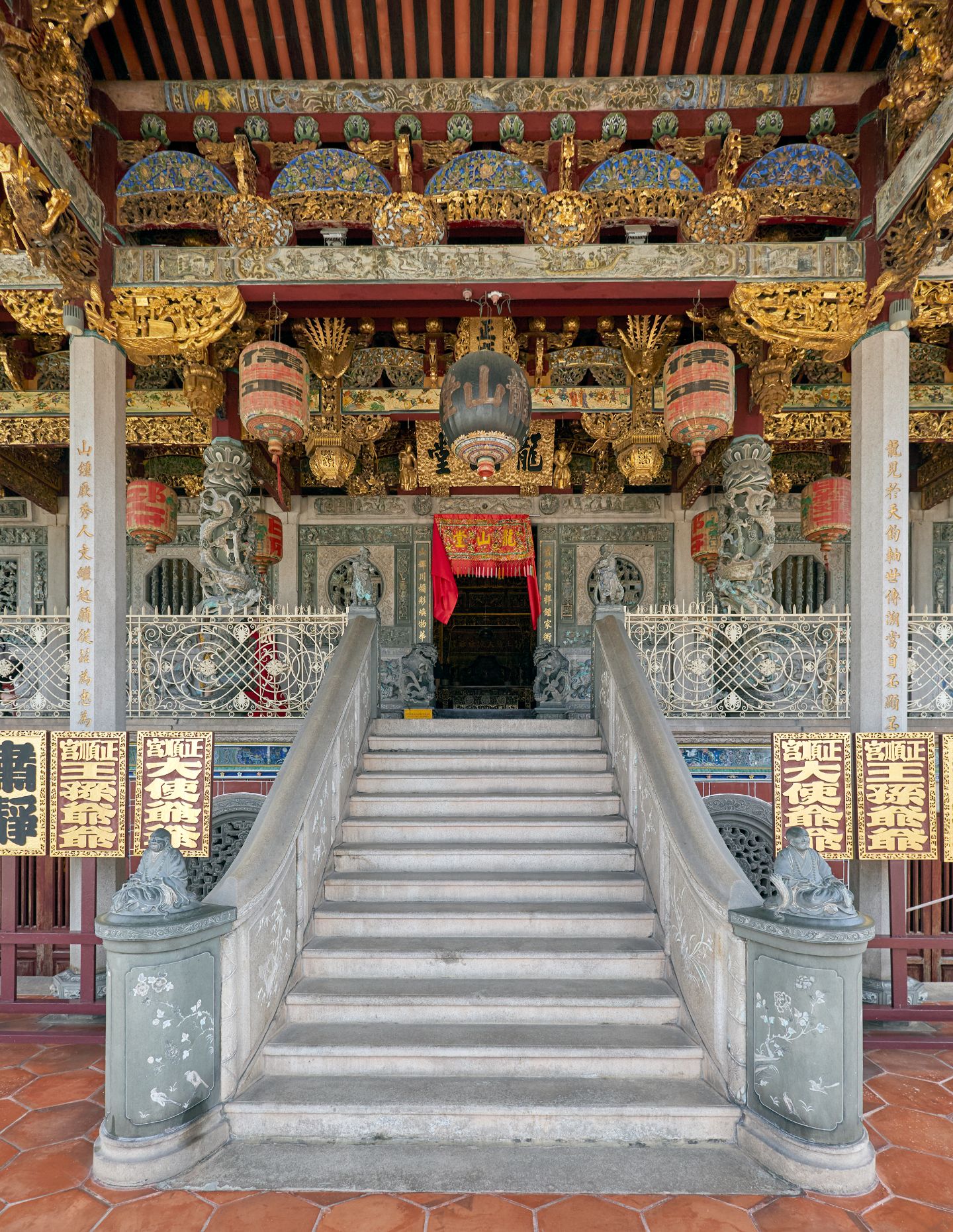 In this way, iconography is used – but sparingly, as accents or art – in the fountain, a circular air vent above the sofa similar to those on the kongsi temple walls and more stone lions perched on pedestals. Culture is also encountered through Penang’s food: guests can ask staff to bring back a selection of Chan’s select dishes from nearby eateries to enjoy in the intimate darkness of the main dining area.