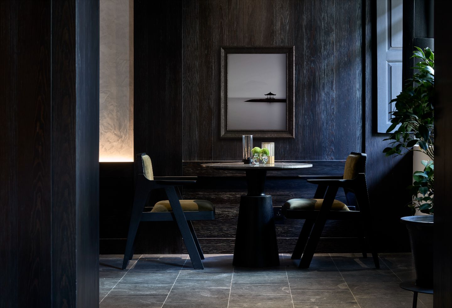 “The space exudes serenity and calmness amidst the bustle of the city. It is an important arrival experience – a procession through different spatial thresholds from the chaos of the city into the calm hotel public spaces,” says Chan. A Feng Shui requirement that the main door not face the entrance takes guests from the private garden through a threshold in the brick wall into an interstitial zone where a trellis templates graphical shadows on the walls. A left turn and then right turn leads one into the foyer proper, where a custom alabaster lamp is a visceral comma among dark wire-brushed, dark timber walls.