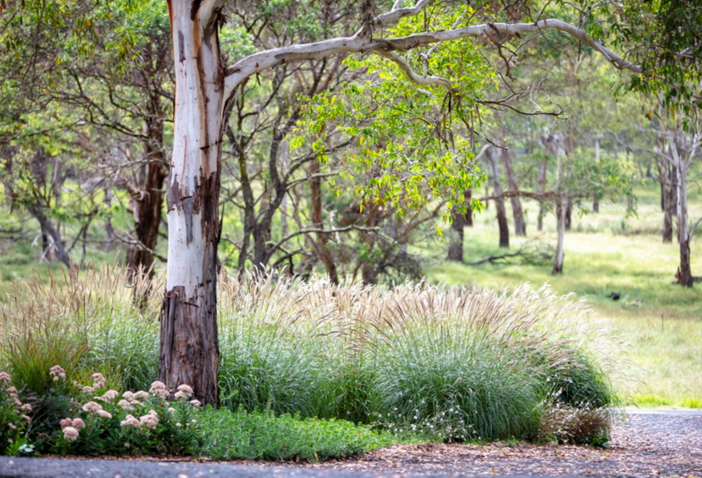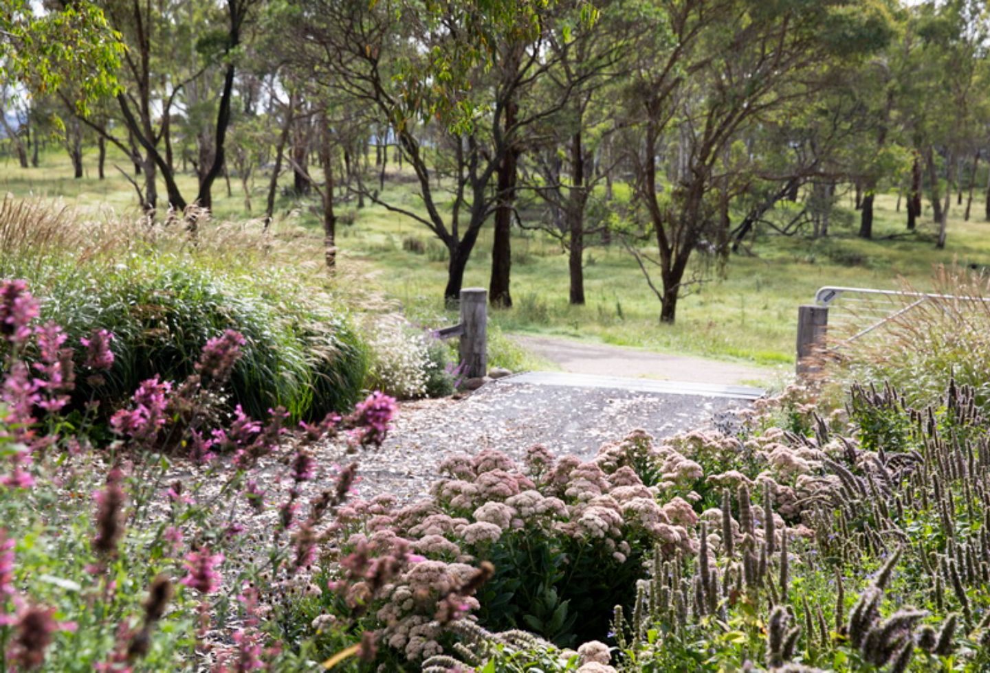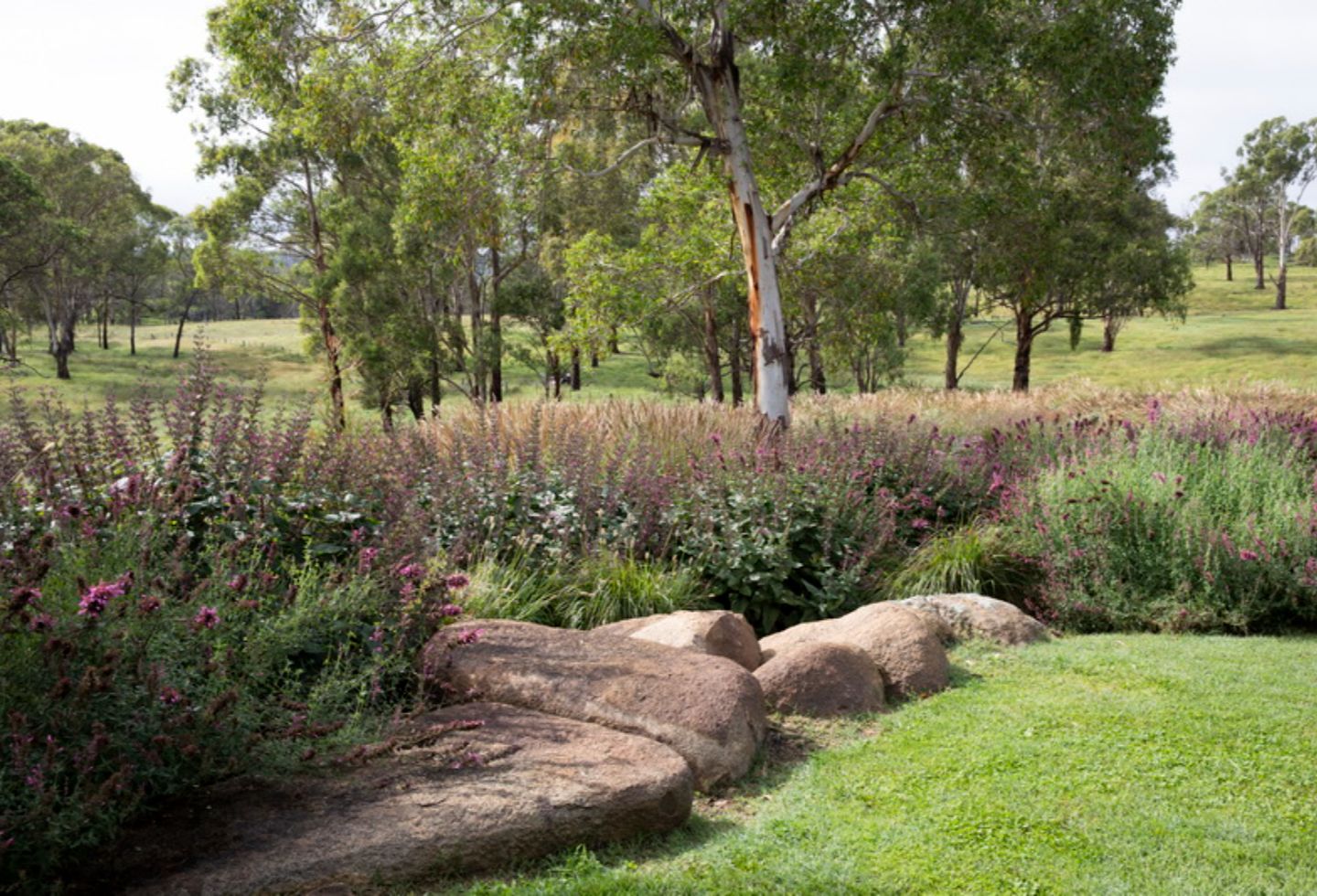 With these challenges in mind, he approached the garden as part of the landscape, pushing out into the paddock without imposition. He planted natives and Miscanthus but also maintained some of the prettiness and femininity of his childhood garden too: a return to home. The palette is soft with sage green and greys; the granite boulders and grasses were already there in the paddock, so a lot of biotic matter was not cleared.