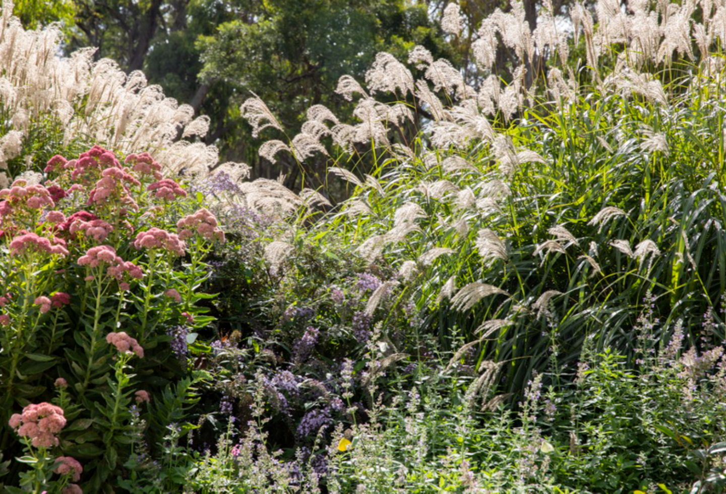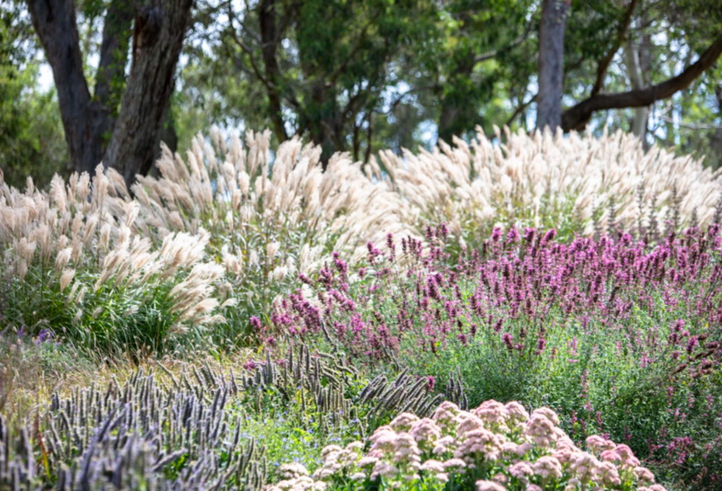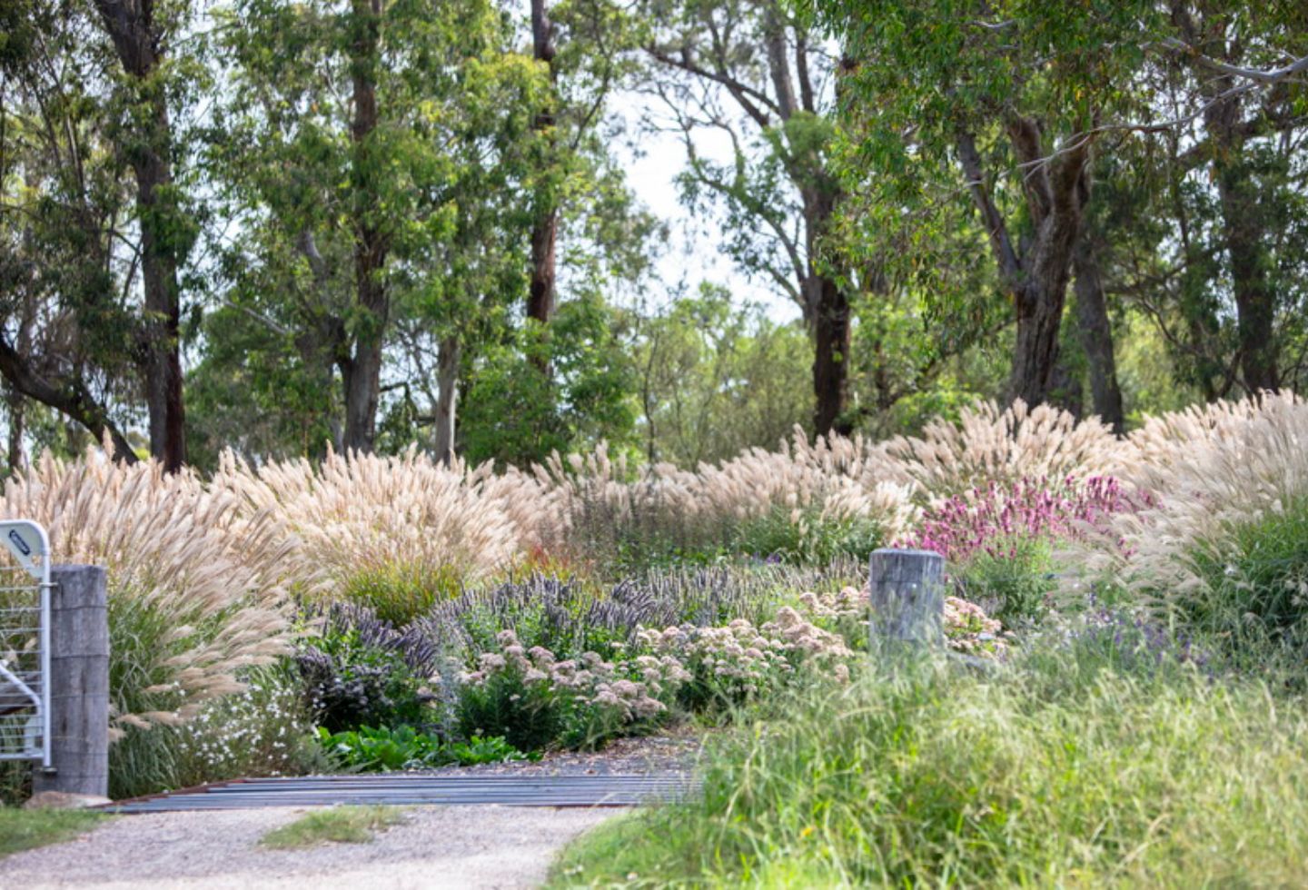 With these challenges in mind, he approached the garden as part of the landscape, pushing out into the paddock without imposition. He planted natives and Miscanthus but also maintained some of the prettiness and femininity of his childhood garden too: a return to home. The palette is soft with sage green and greys; the granite boulders and grasses were already there in the paddock, so a lot of biotic matter was not cleared.