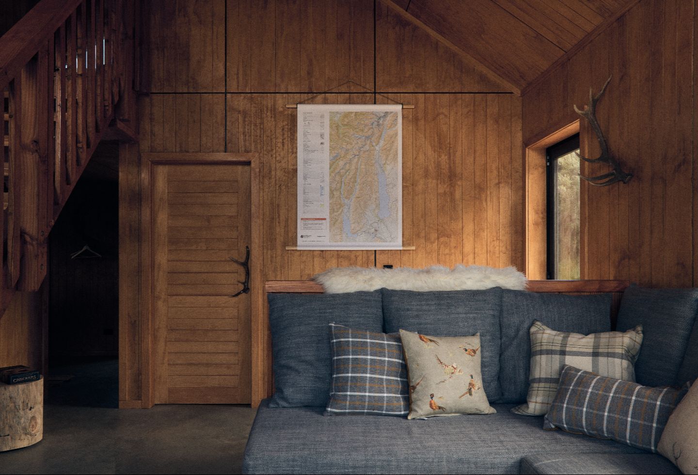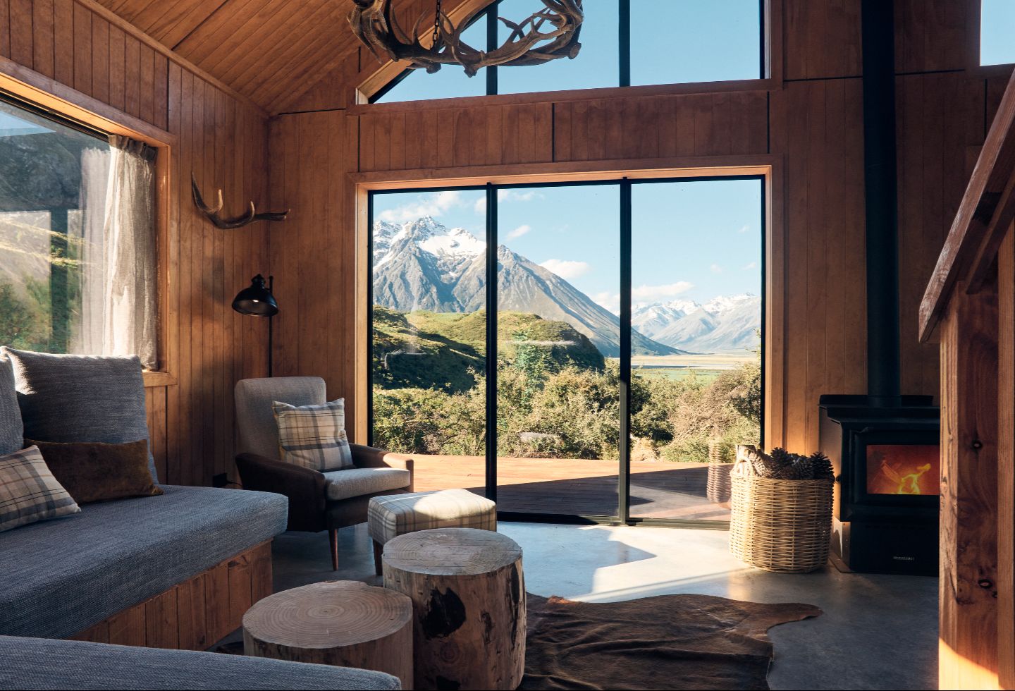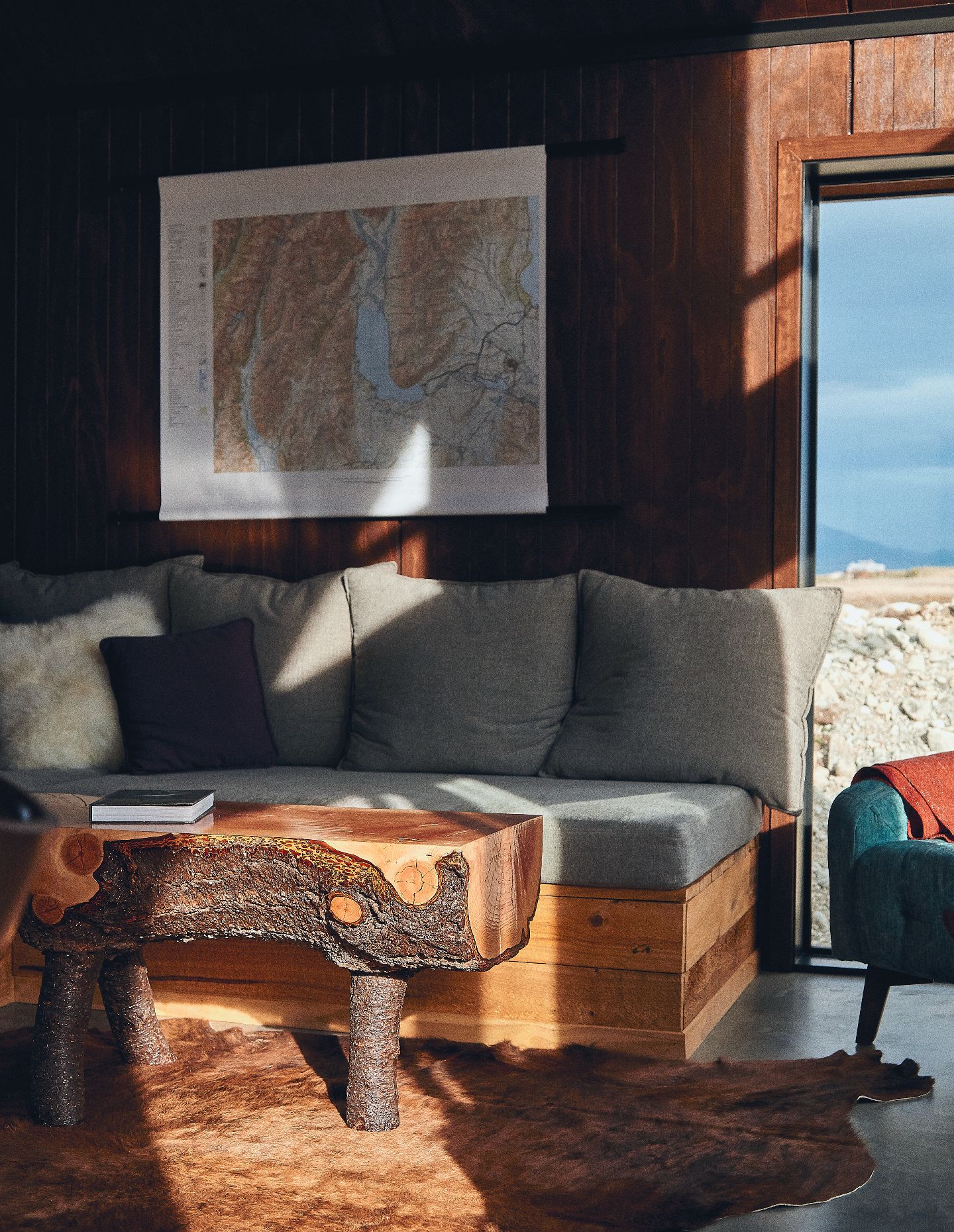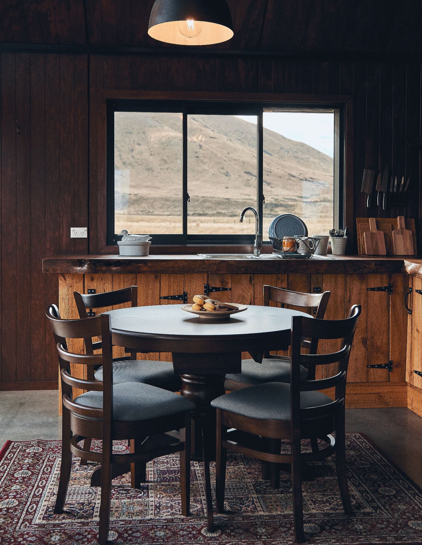 Material selections further articulate the relationship between dwelling and working land. Warm-toned timber lines the interior, offset by black steel elements and charcoal-coloured textiles that temper glare and draw attention outward. Cowhide is used as a rug, antlers form handles, hooks and a chandelier, and sheep wool throws soften seating areas. These gestures reference the realities of high-country station life – animal husbandry, deer farming, Merino wool production – without slipping into overt nostalgia. Instead, they serve as tactile reminders that this is a lived and worked landscape rather than an abstract wilderness.