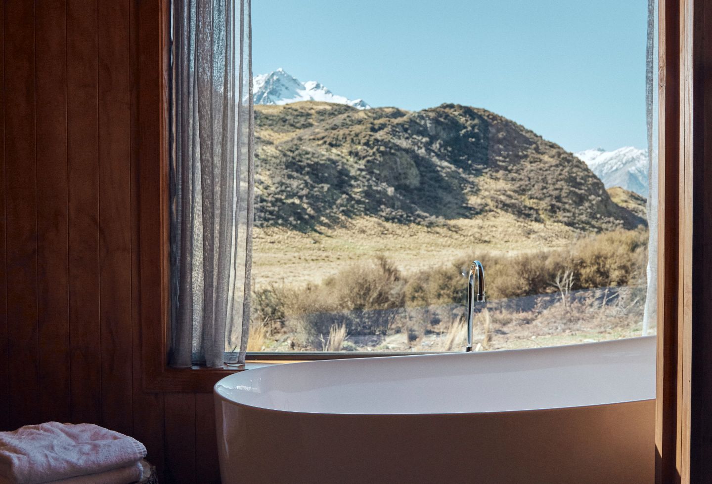 The structure is experienced as comfortable in a region known for forceful winds, its robust frame and dark exterior anchoring it against open sky and tussock. Inside, an open-plan layout centres on a hearth, reinforcing the notion of refuge. The spatial logic is simple and legible, with living, cooking and sleeping zones arranged to maintain continuous visual connection to the outdoors. A bathtub then introduces a note of quiet indulgence, positioned not as spectacle but as an extension of the cabin’s sheltering role.