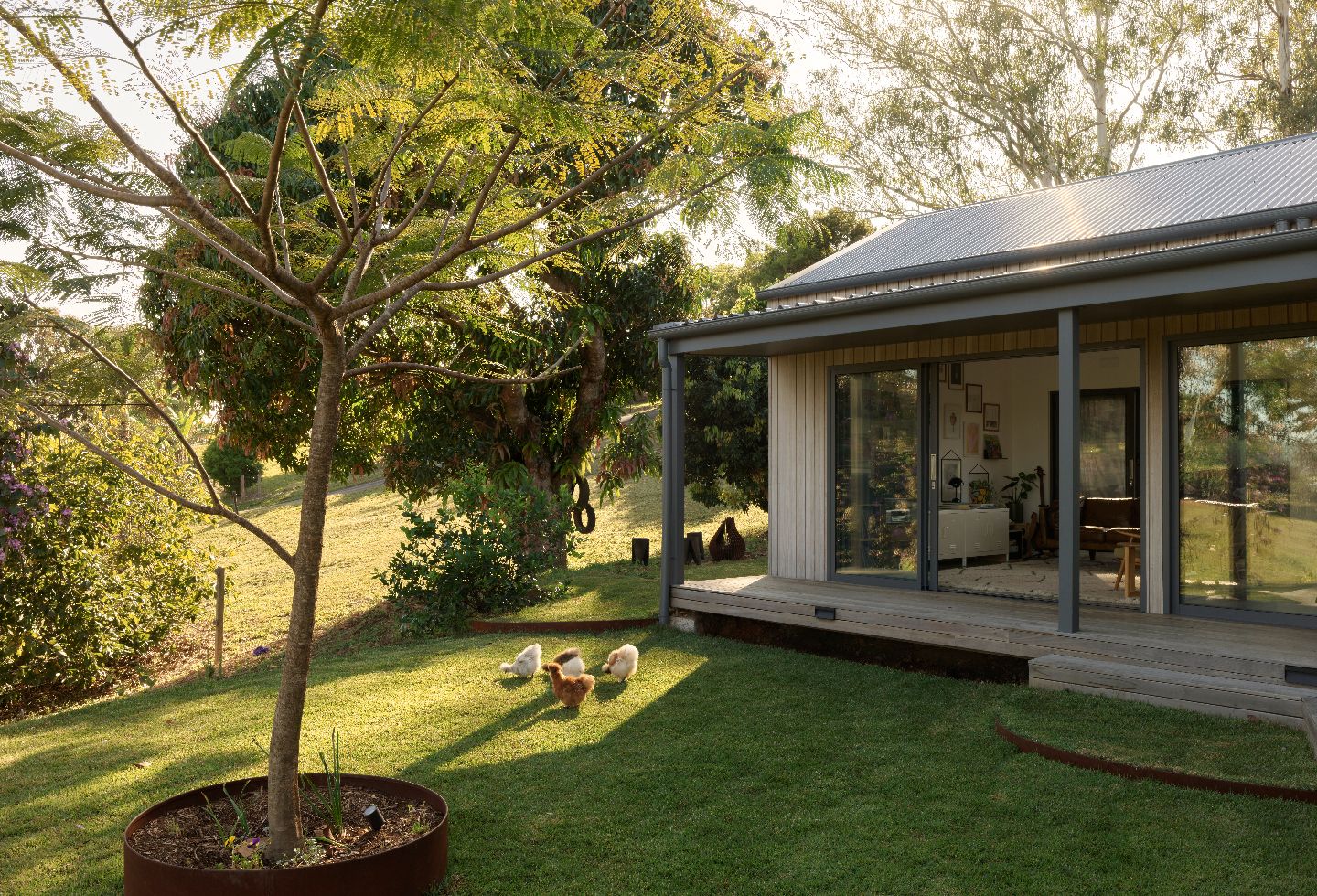 Maryanne and Nyall approached Maytree Studios to design a forever home for themselves, their two children, one dog and a flock of chickens. Sustainable design became the focus, with an emphasis on reuse and minimal waste, maximising views to the northwest while protecting against Queensland’s sun and heat. The result is a textural, warm, character-filled home with modern comforts.