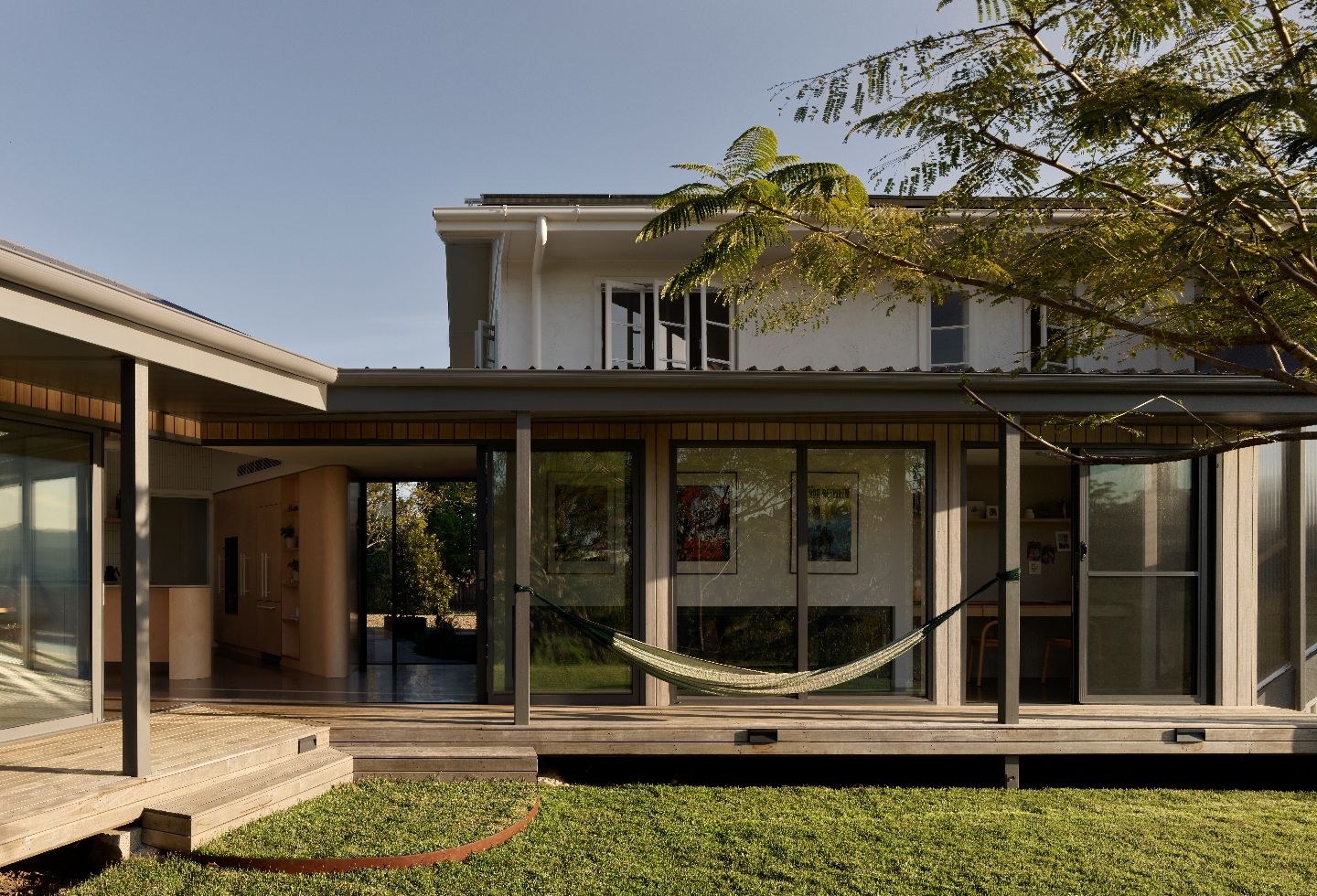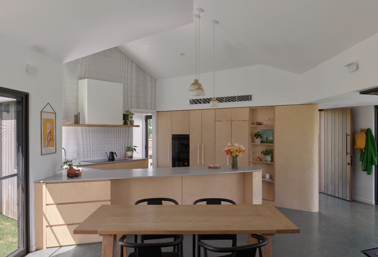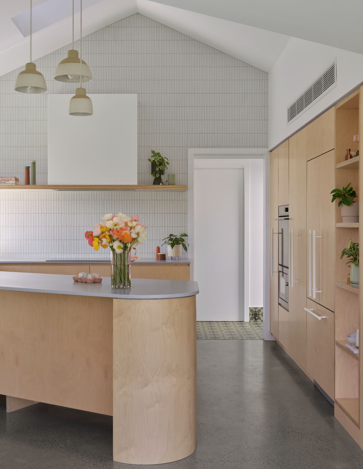 Throughout, the renovation prioritises reuse and minimal waste, updating the original structure and repurposing underutilised spaces. Existing timber floors were sanded, stained and refinished; new surfaces combine blonde plywood joinery, polished concrete and speckled Kit Kat tiles to create a cohesive, neutral base. Deep verandas and carefully positioned trees support passive cooling and shade, reducing reliance on artificial systems.
