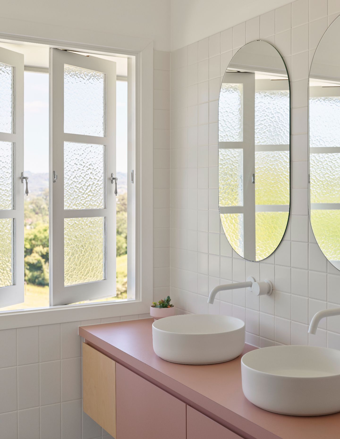 Pops of soft, muted pinks and greens and geometric pattern tiles in the laundry and bathrooms invite a whimsical sensibility that is mirrored by Maryanne and Nyall’s art, music, and book collection. Fun details, such as Ferm Living’s Curvature hooks and toilet paper holder, continue the art-like curation, along with Victorian ceramist Takewai’s pendants. They add a sculptural effect above the kitchen island bench, complementing the soaring overhead ceiling and again above the ensuite bath for a more intimate moment.