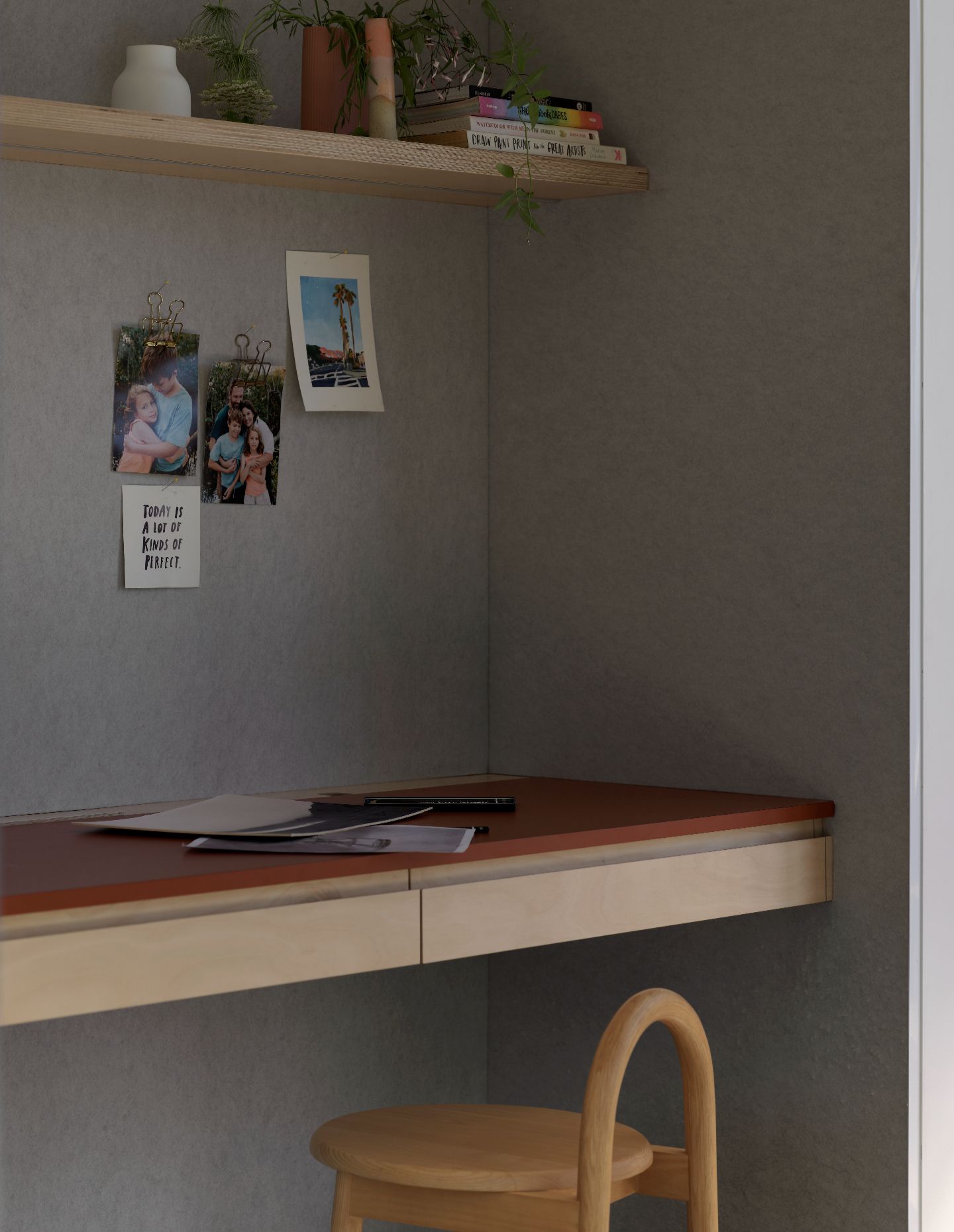 Joinery was used throughout for an effortless enhancement of family life. An inbuilt desk and shelves nestled away in the corridor, or in the mudroom, plenty of storage for school bags, coats, and shoes. This continues into the spotted gum stairwell, which physically unites the old and new.